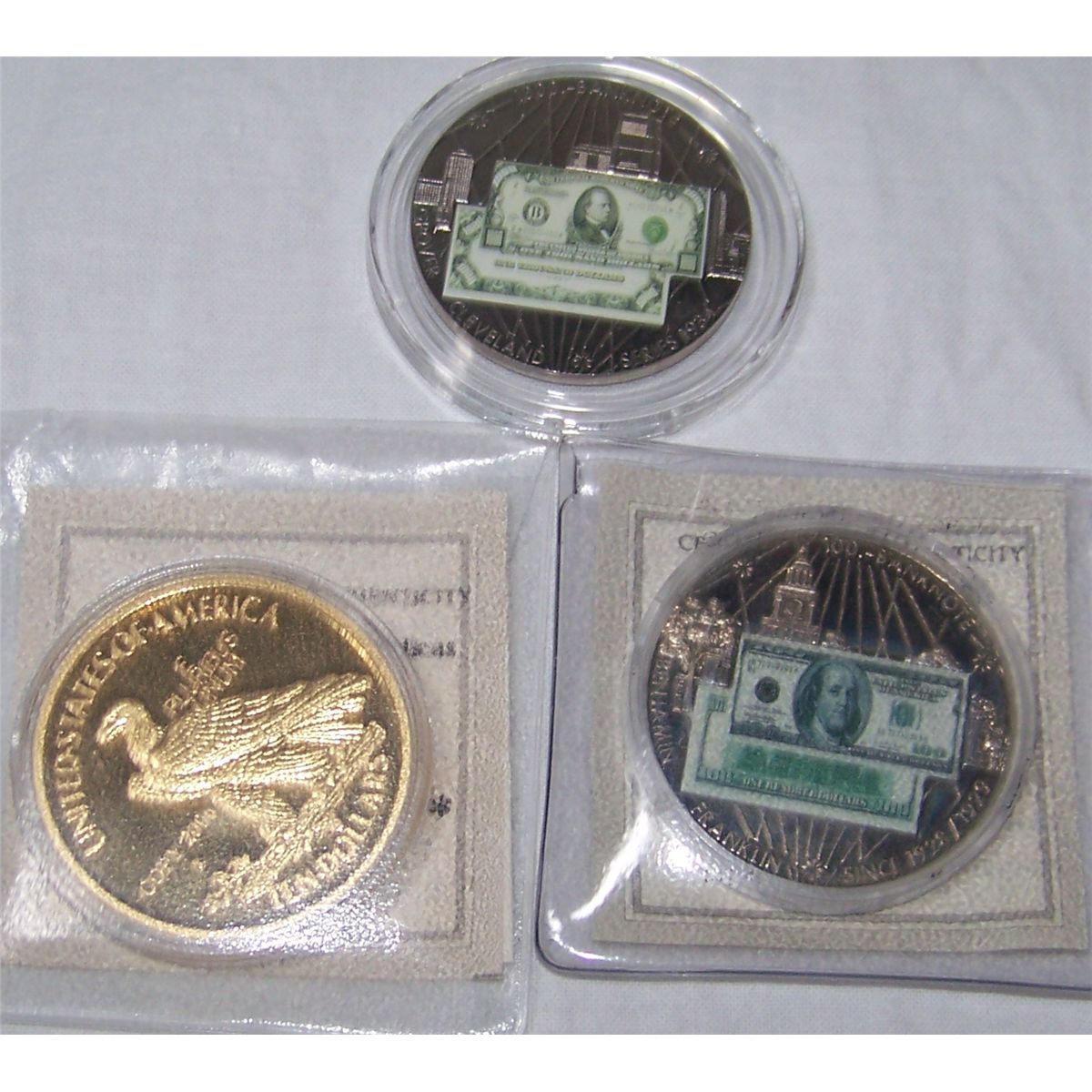 (3X$) COMMEMORATIVE "BANK NOTES OF AMERICA" 100.00,1000.00 INDIAN GOLD COIN, GOLD LAYERED