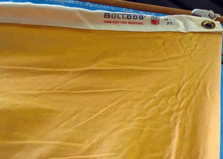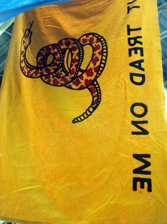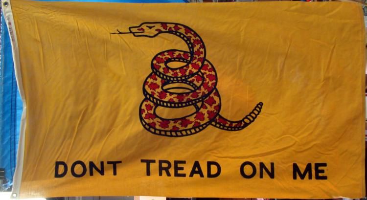 3X5' VINTAGE "DON T TREAD ON ME" FLAG ON POLE WITH FINIAL TOPPER-YELLOW W/SNAKE CENTER * * NICE OLDER FLAG & POLE-POLE IS 50"