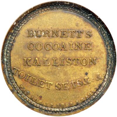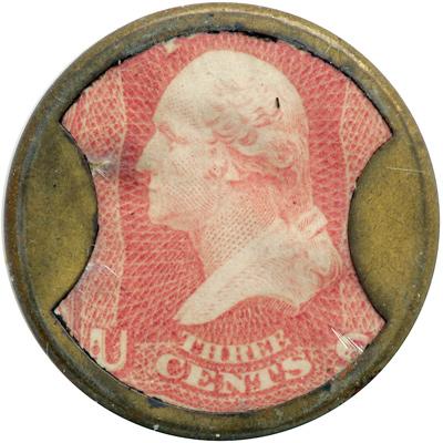 3¢ Encased Postage. Burnett's Cocoaine Kalliston. . Fr-EP-39. This "Cocoaine" encased postage issue is among the most popular in the entire series. The case grades Very Fine or better and is absoutely authentic and untampered holding the 3¢ Washington postage stamp. The mica has a few minor crazed areas as normally seen.