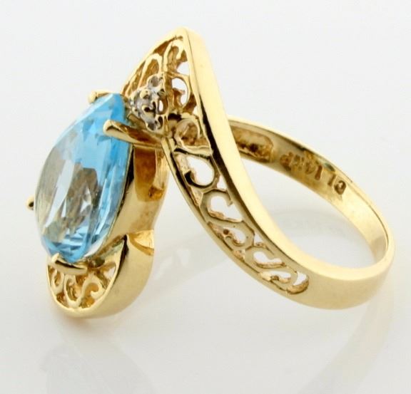 In 14K yellow gold, this ring contains a 12x8mm pear blue topaz gemstone, as well as a 1/2pt round diamond. Size 7 1/4 3.4g