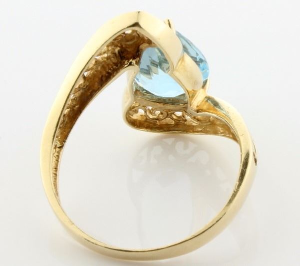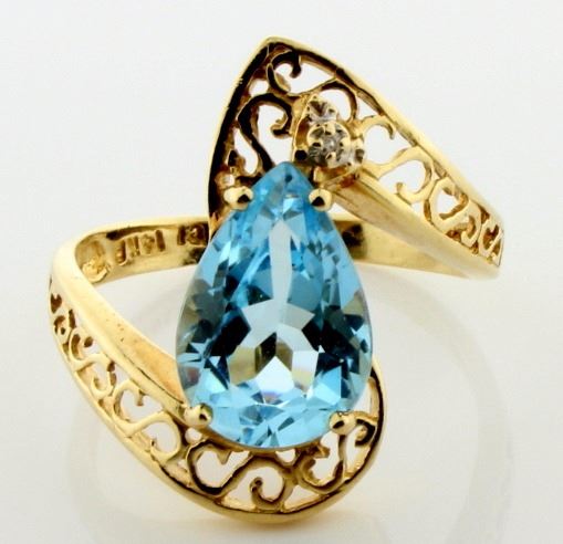 In 14K yellow gold, this ring contains a 12x8mm pear blue topaz gemstone, as well as a 1/2pt round diamond. Size 7 1/4 3.4g