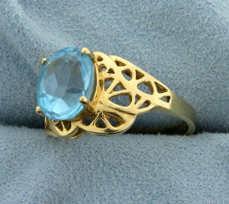 In 14k yellow gold, containing a 3ct oval blue topaz that has a fantastic sky blue color. Size 7 1/2. 4.3g.