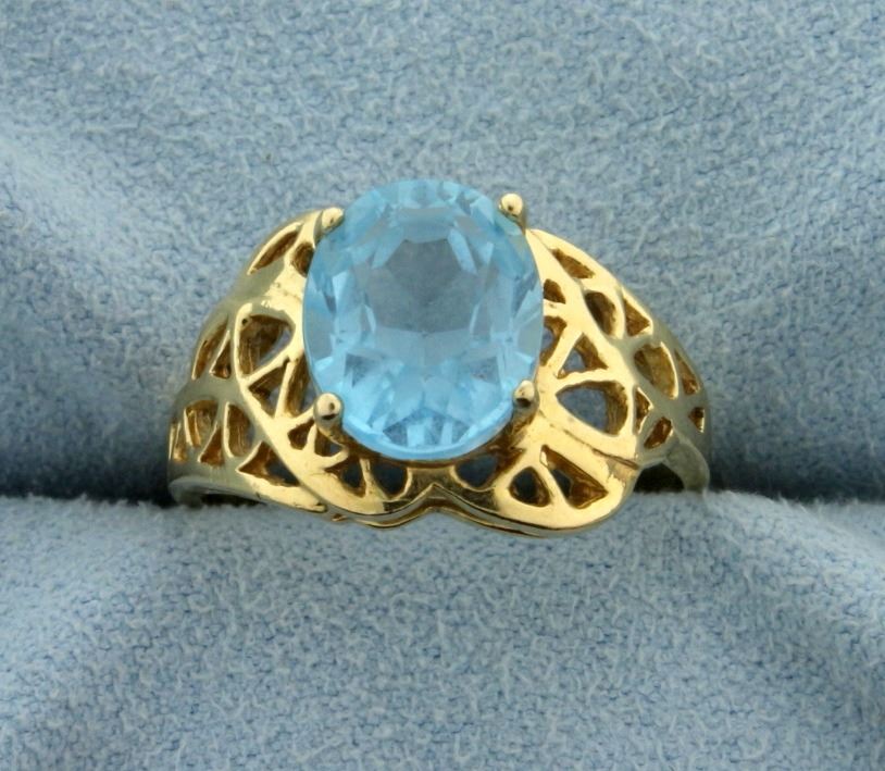 In 14k yellow gold, containing a 3ct oval blue topaz that has a fantastic sky blue color. Size 7 1/2. 4.3g.