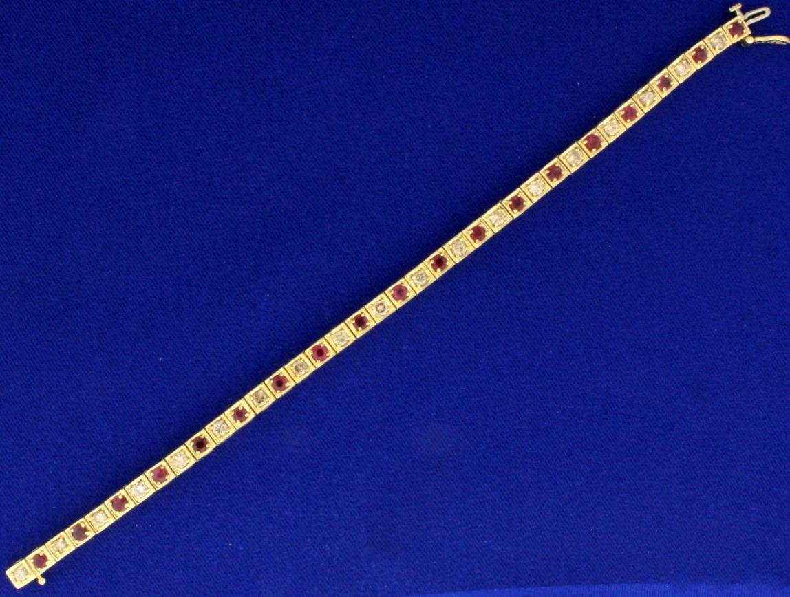 In 14k yellow gold, containing 1.5cts of high quality champagne diamonds with excellent clarity and warm champagne color. Also contains 1.5cts of high quality natural rubies with deep ruby red color and excellent clarity. 7 1/8 inches long with safety clasp. 20.9g