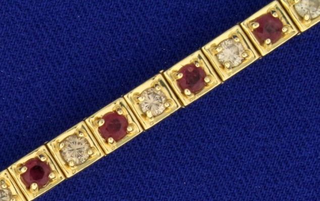 In 14k yellow gold, containing 1.5cts of high quality champagne diamonds with excellent clarity and warm champagne color. Also contains 1.5cts of high quality natural rubies with deep ruby red color and excellent clarity. 7 1/8 inches long with safety clasp. 20.9g