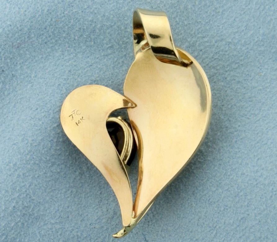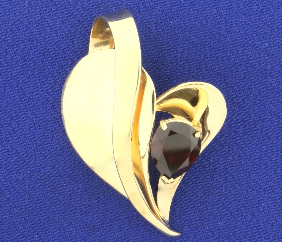 In 14K Yellow Gold. Contains a large 12x8mm natural Garnet gemstone with deep red color and excellent clarity. 1 3/4" long with bale. 11.6g