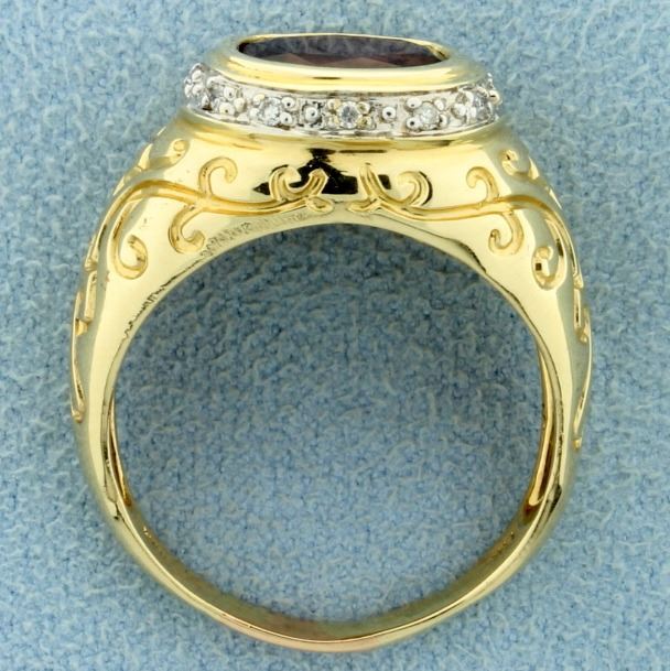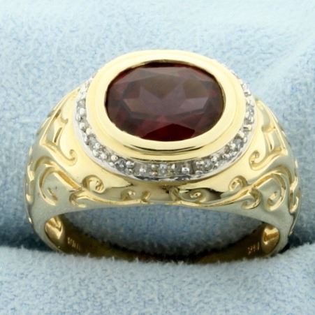 In 14K yellow & white gold, the 10x8mm oval garnet has beautiful color & clarity. It also contains twelve 1/2pt round diamonds. Size 9 1/4 4.9g
