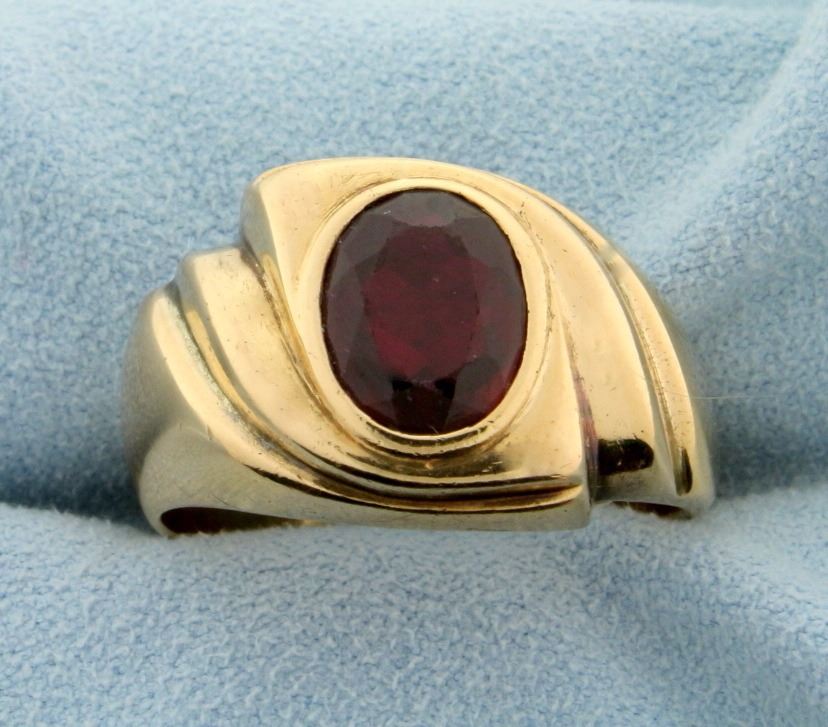 In 14k yellow gold, containing a 10x8mm oval shaped high quality natural ruby gemstone with a deep ruby red color and excellent clarity. Size 10 1/2. 13.2g.