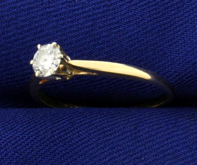 In 14K Yellow Gold. Contains a high quality .3ct diamond, VS clarity/G color. Excellent cut for lots of sparkle. Size 7. 1.4g