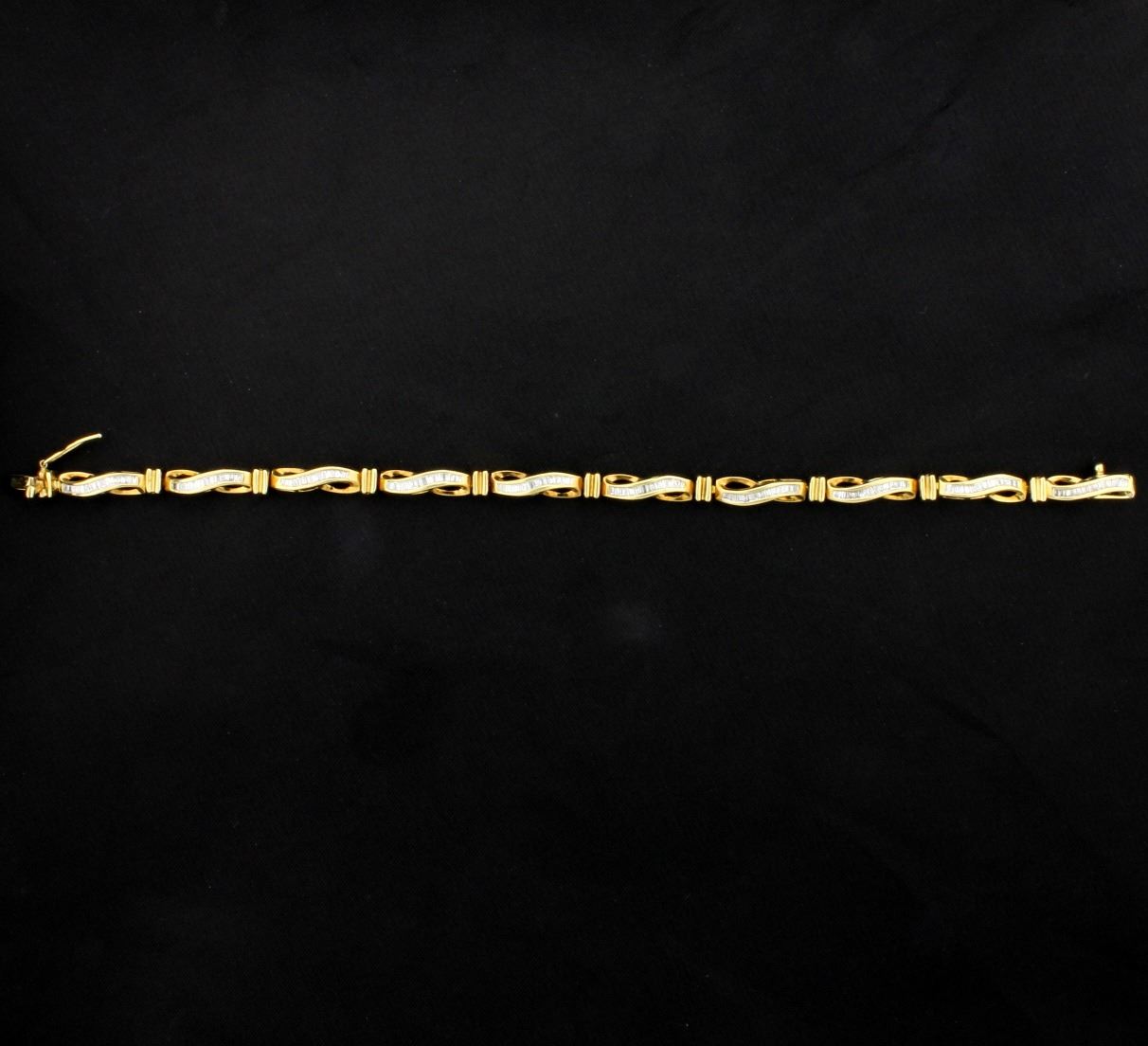 The 10K yellow gold bracelet is 7 1/4 inches long, contains 3cts total weight of high quality baguette diamonds that are SI clarity/H color, and it has a safety clasp. 8.5g