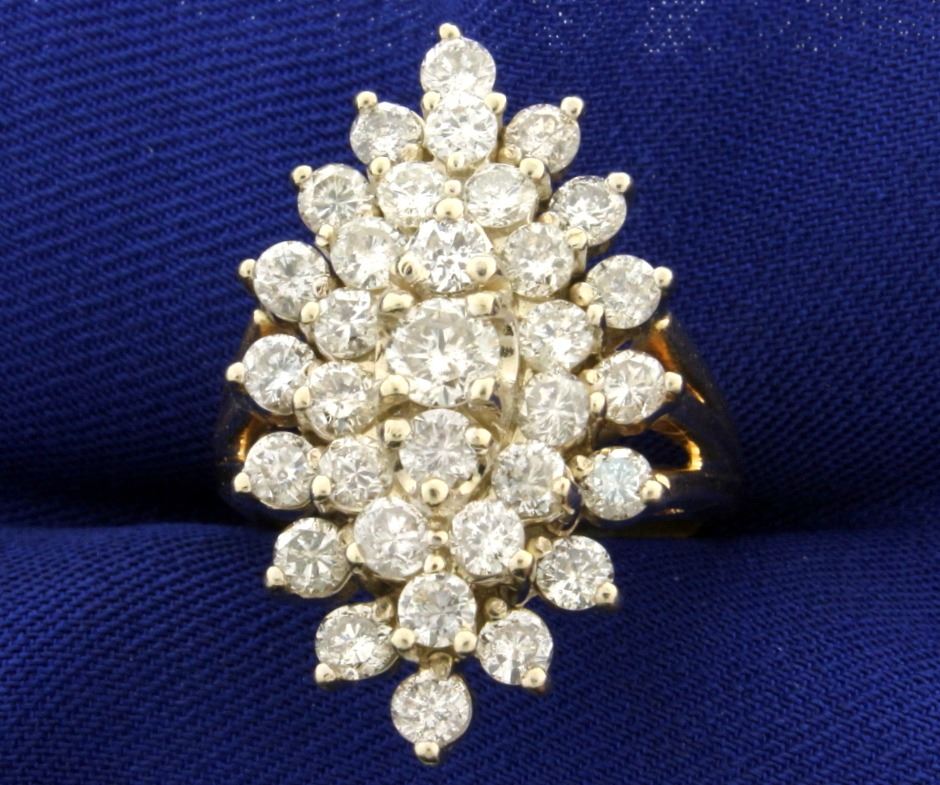 In 14k yellow gold. Center high quality diamond is slightly over 1/4ct, diamond is surrounded by two .1ct diamonds and thirty .08 to .09ct diamonds, SI clarity/H color, eye clean. Size 7 1/4. 12.3g.