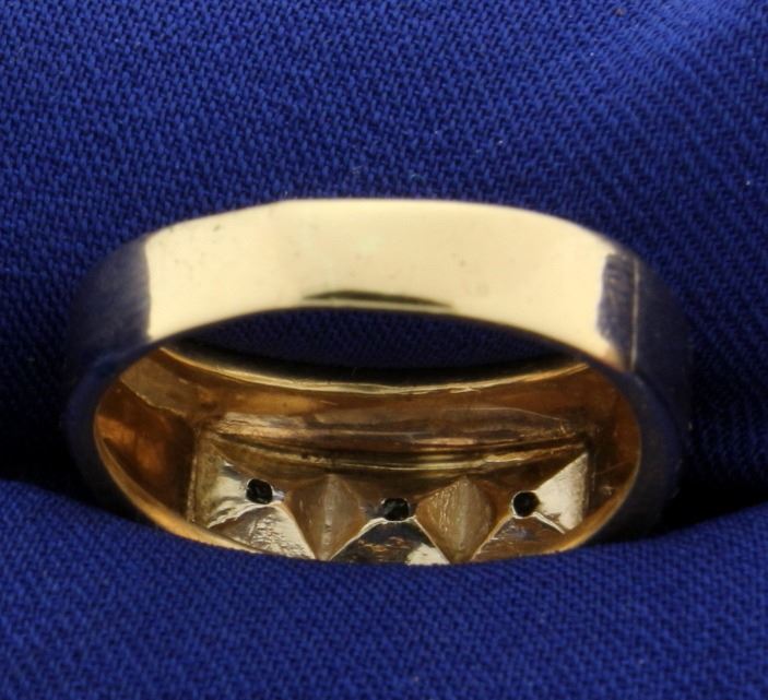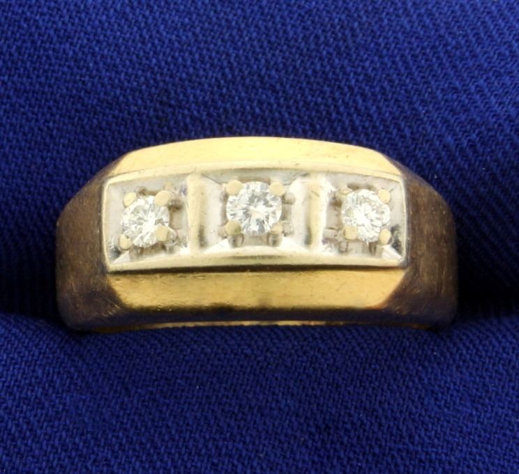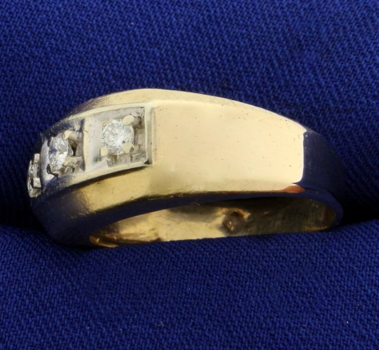 In 14k yellow and white gold. Contains three high quality .1 ct diamonds, SI Clarity/H Color. Size 10 1/2. 7.0g.