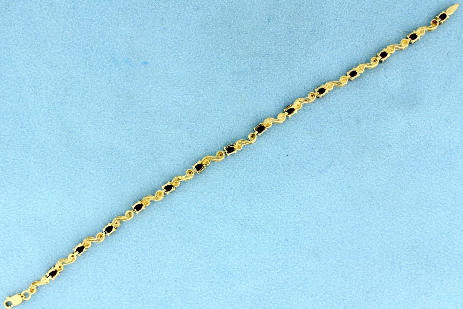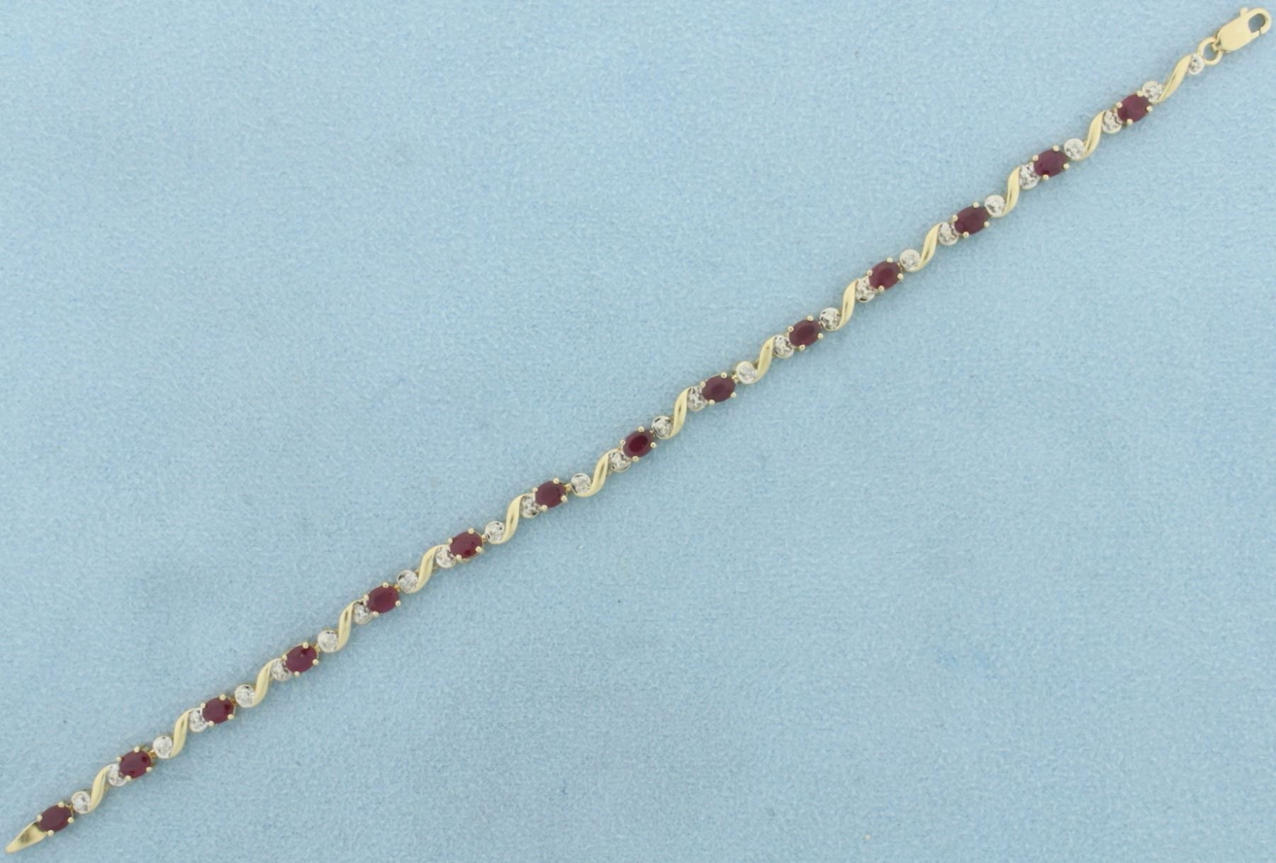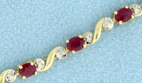In 14k yellow and white gold. Contains fourteen natural 4x3mm oval cut ruby gemstones with deep ruby red color and excellent clarity. Also contains six high quality 1/2pt diamonds. 7" long with lobster clasp. 5.7g.