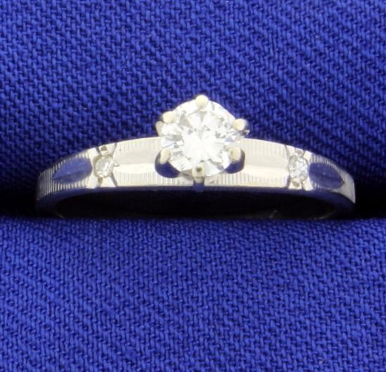 In 14K white gold, there is a .28ct great quality G color/ SI clarity, very "white" stone and two .01ct diamonds in shank. Size 5 1/4 1.8g