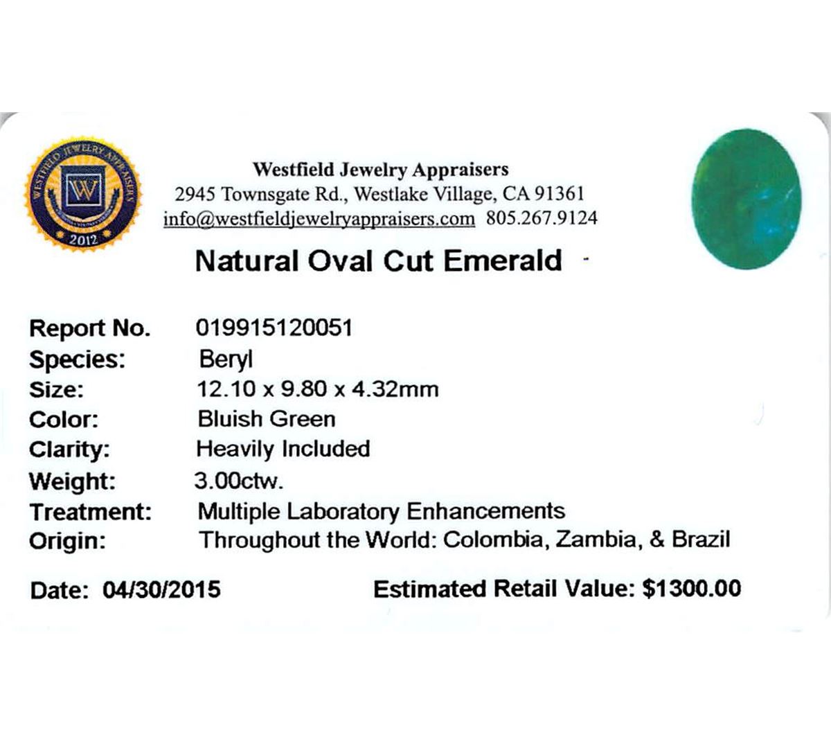 One oval mixed cut natural emerald, measuring 12.10 x 9.80 x 4.32mm, exact weight 3.00ct., clarity is heavily included, type III, medium dark, very slightly grayish, bluish green color, (GIA bG 6/3), cut is good. Indications of multiple laboratory enhancements, including high temperature heat treatment. Westfield Appraised at $1,300.00.