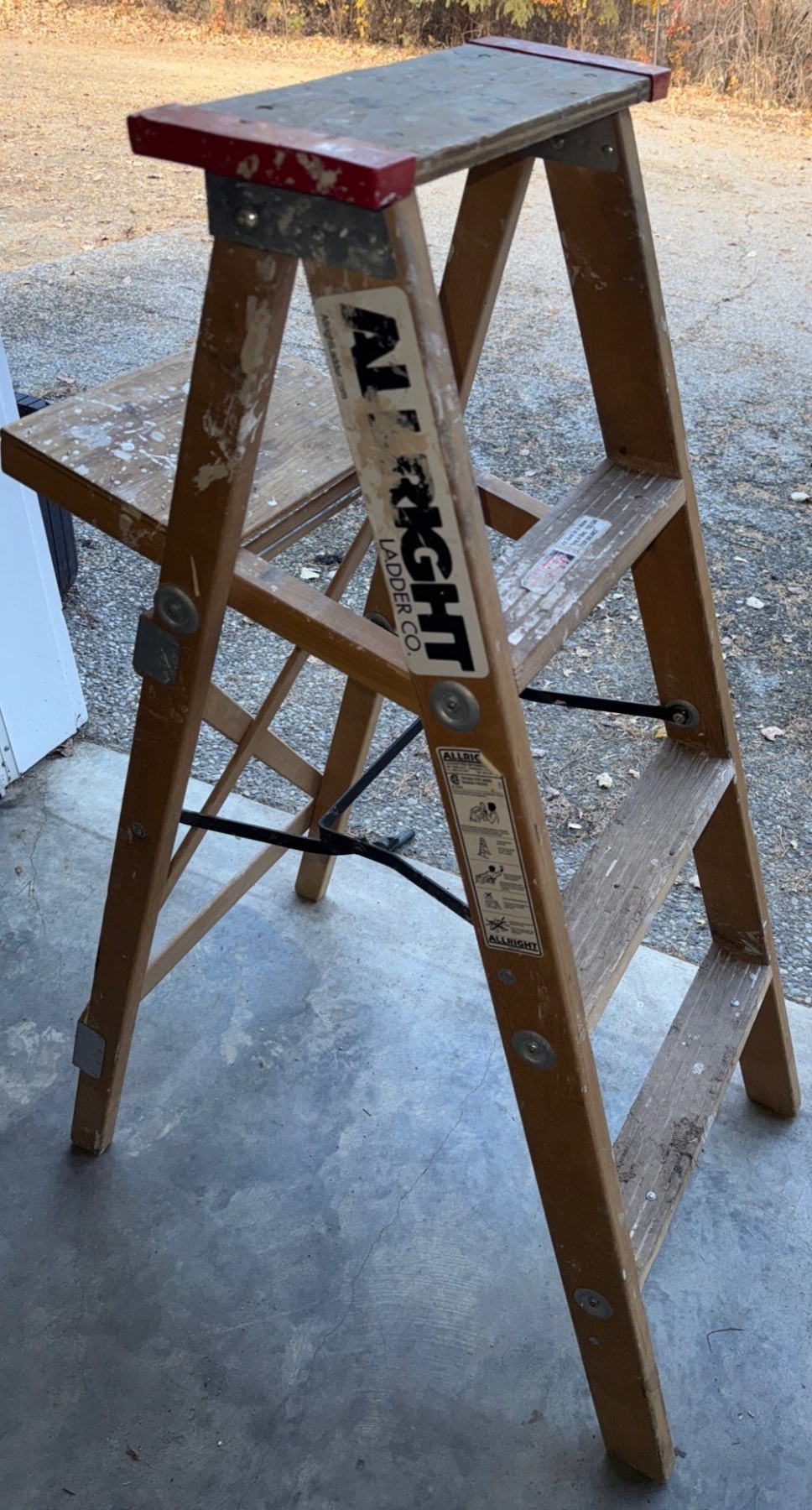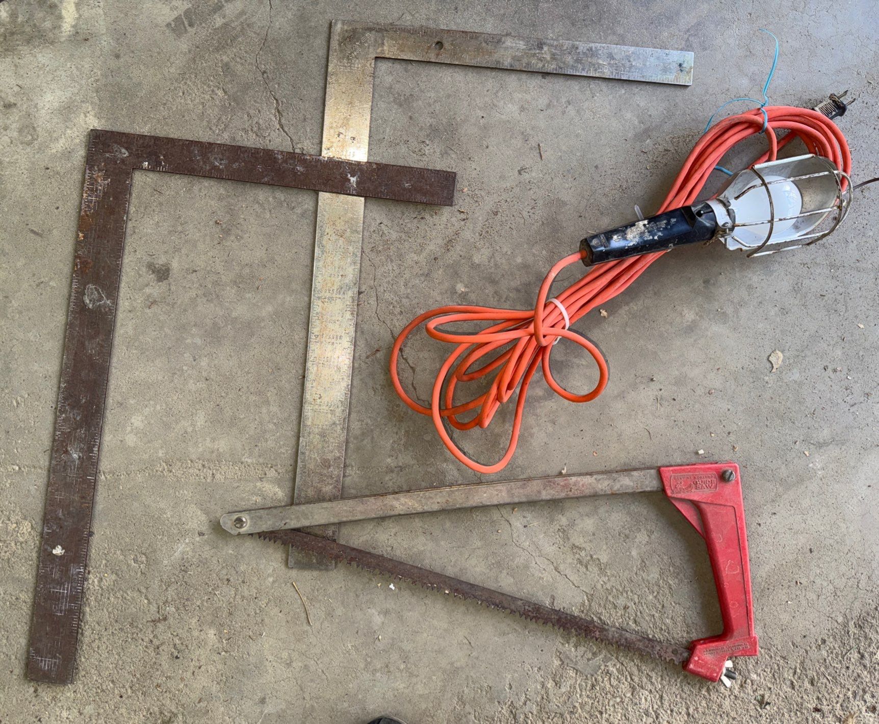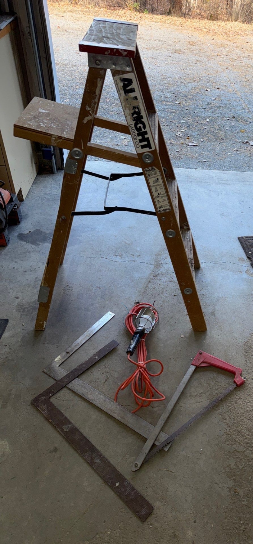 3ft Wooden Ladder, Shop Light w/ Extention Cord, Squares & A Hand Saw