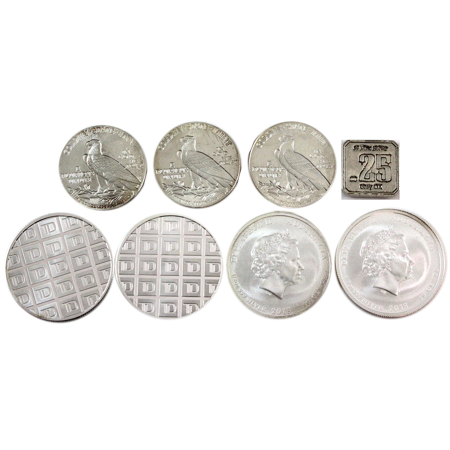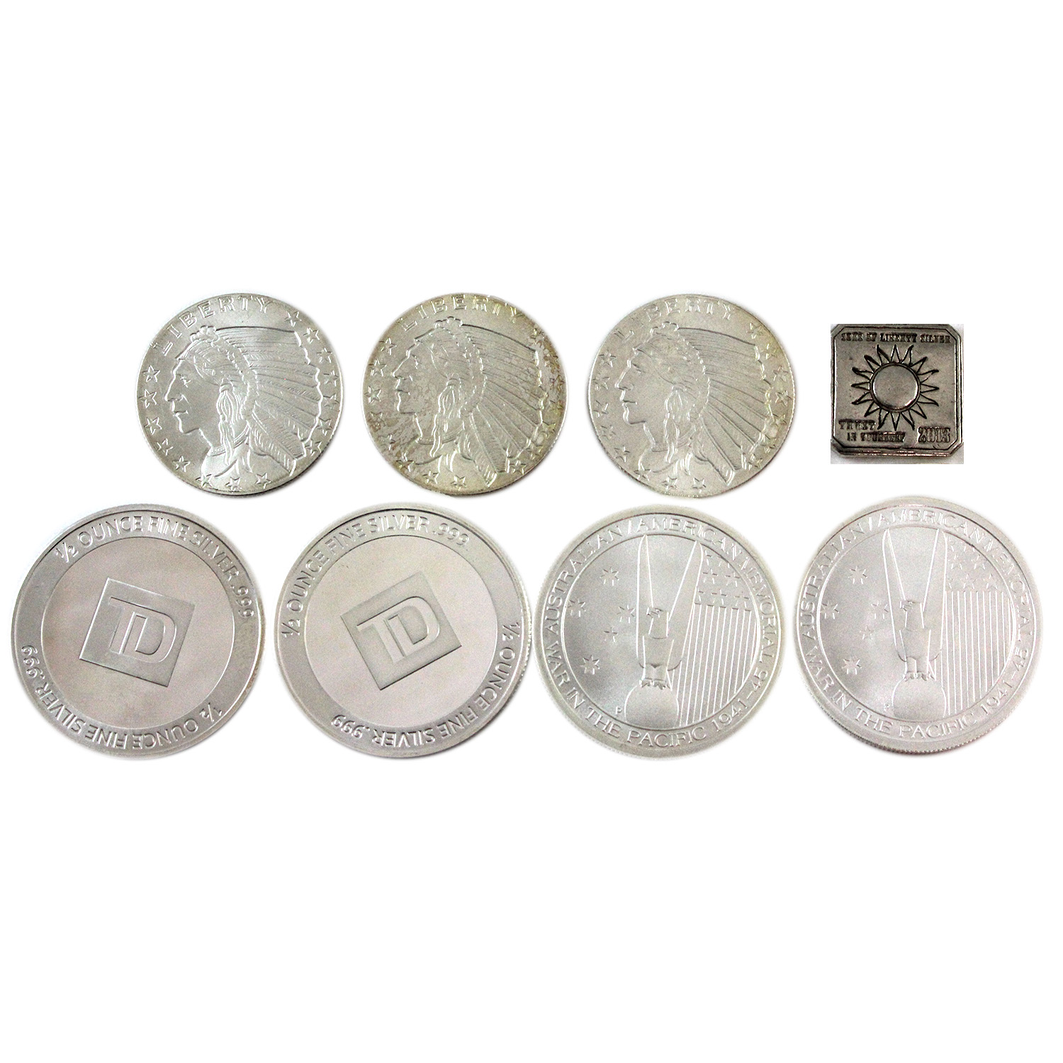INCLUDES: 2 x1/2oz TD rounds , 2 x 1/2oz Australia Commemorative rounds, 3x 1/4oz Golden State Mint Rounds & 1/4oz 2013 Suns of Liberty Silver Bar. 8pcs. (Tax Exempt)