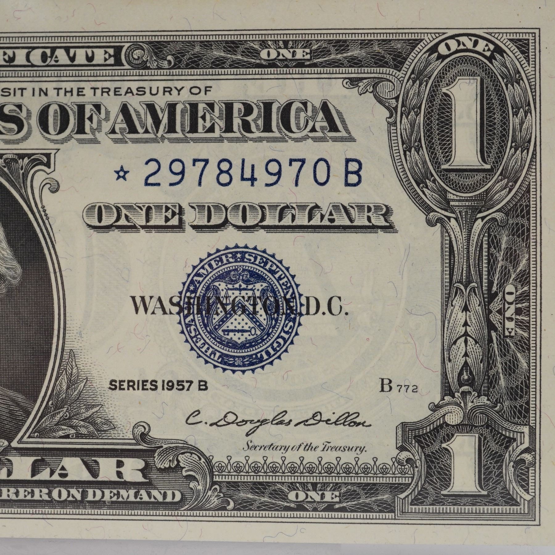 Set of three small-size United States one dollar silver certificates issued during the mid-twentieth century, representing transitional printing varieties and replacement note production. This group includes two Series 1957B mule star notes and one Series 1935F pre-motto note with a visible serial number misalignment. Each note is housed in a protective sleeve. The first note is a 1957B one dollar silver certificate mule star note bearing serial number 12104425B. Identified as Friedberg number 1621m, this note was issued from Federal Reserve District F - Atlanta. The back plate number is 415. This note is marked with a star prefix, signifying it was printed as a replacement. The note displays crisp paper quality, strong ink saturation, and well-defined margins. The second note is also a 1957B one dollar silver certificate mule star note with serial number 29784970B. Designated Friedberg number 1621m, this example was printed for Federal Reserve District B-New York. Its back plate number is 432. Like the first, this is a star replacement note. It originates from one of the final mule printing runs and features a narrowed plate gap preceding the full transition to non-mule formats. The third note is a 1935F one dollar silver certificate with serial number X95069285I, cataloged as Friedberg number 1615. Issued from District X - San Francisco, it bears back plate number 6279. This pre-motto note does not display the phrase In God We Trust, consistent with designs prior to the 1957A revision. A notable printing anomaly is present in the serial number, where the prefix letter X is visibly misaligned above the number string, constituting a recognizable askew prefix error. This positioning variation is considered a minor yet collectible printing flaw. Collectively, these notes illustrate the nuances of United States currency printing techniques, including mule pairings, star replacements, pre-motto issuance, and misalignment anomalies from the era. A protective sleeve: 6.5"L x 3"W. A bill: 156mm x 67mm.