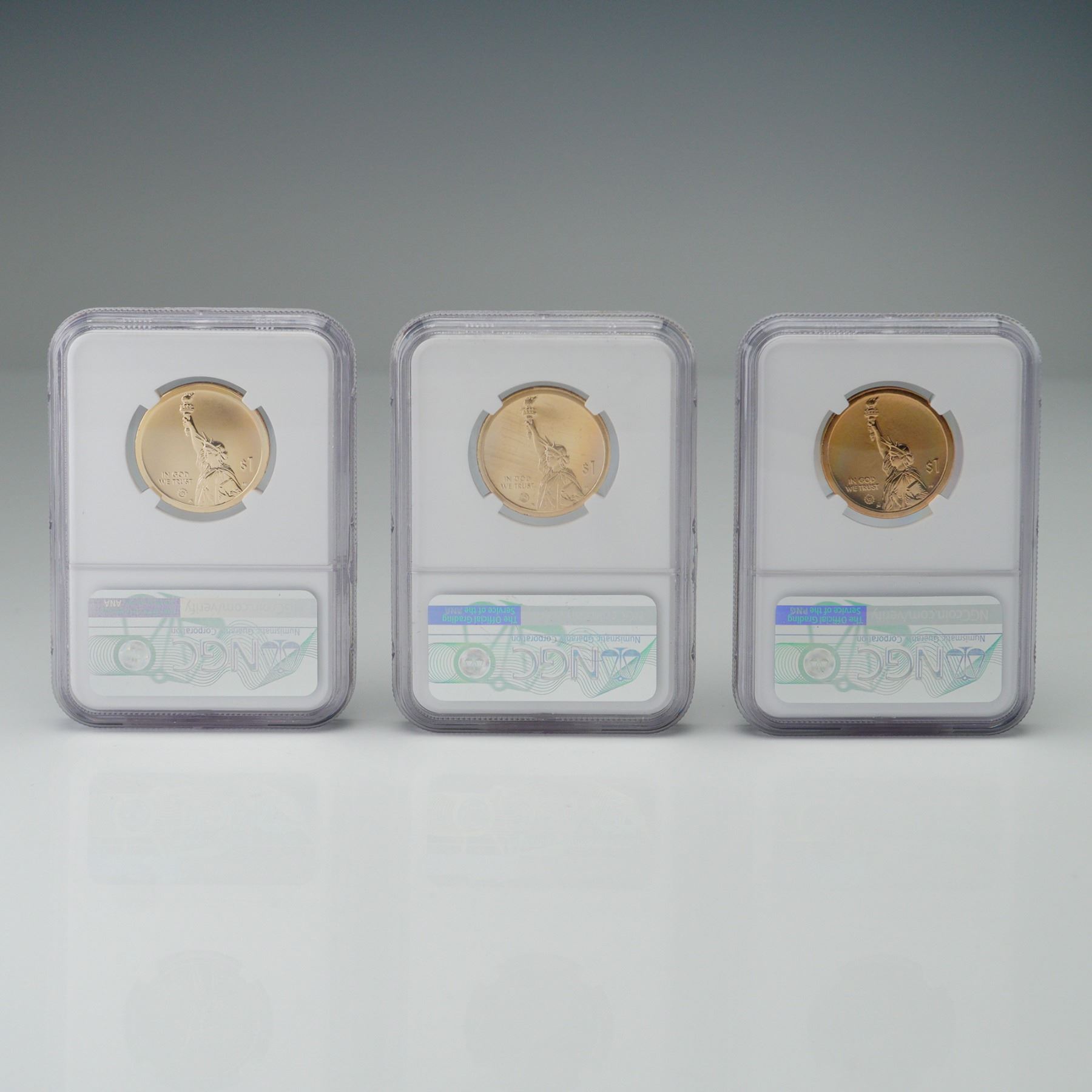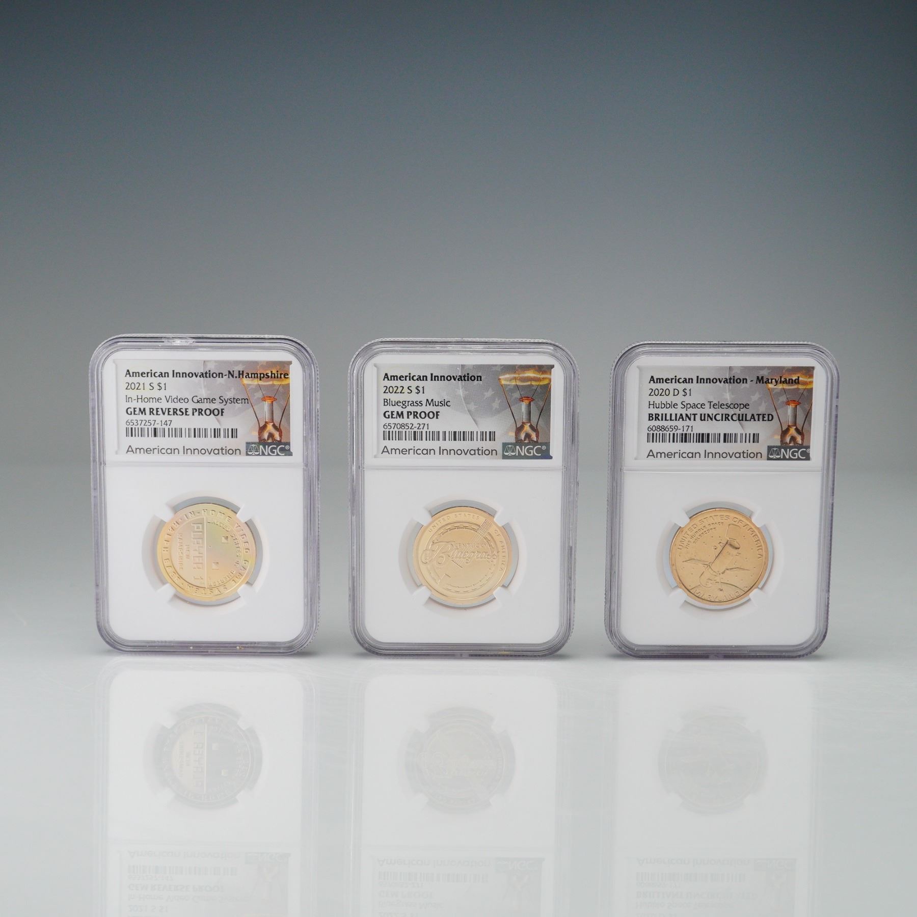 A set of three NGC-certified American Innovation series $1 coins featuring a 2020-D Maryland Hubble Space Telescope graded BRILLIANT UNCIRCULATED, a 2021-S New Hampshire In-Home Video Game System graded GEM REVERSE PROOF, and a 2022-S Kentucky Bluegrass Music graded GEM PROOF. Each coin features a reverse design specific to the state's contribution to American innovation and a common obverse with the Statue of Liberty. Housed in individually graded NGC slab for further preservation and authentication. Slabs measure: 2.25"L x 0.25"W x 3.25"H. Coin's diameter: 26.49 mm.