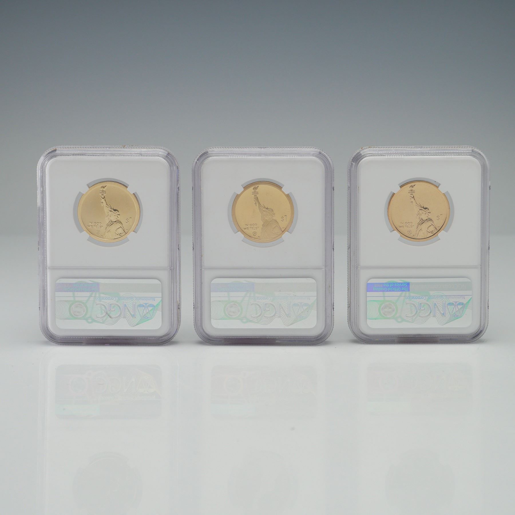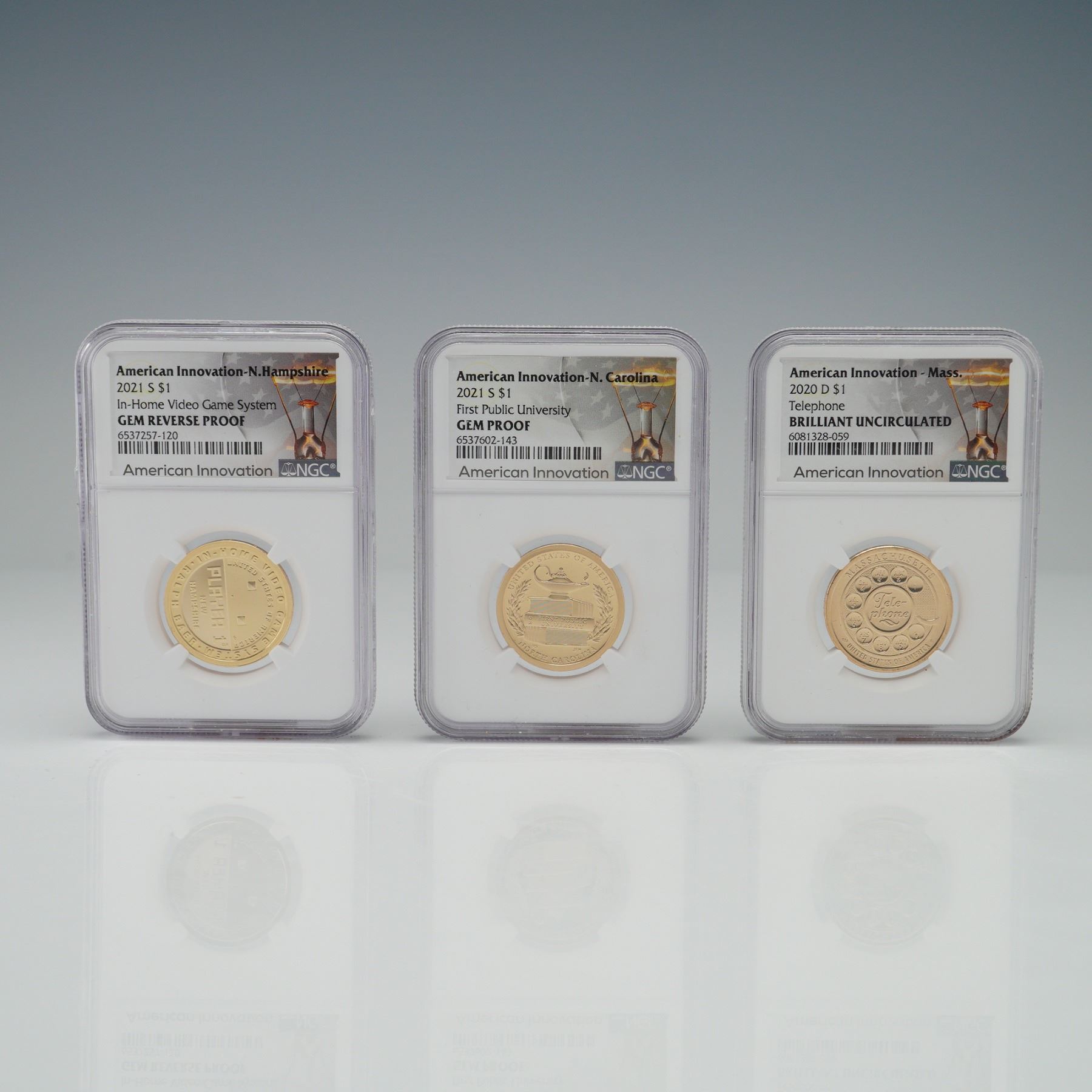 A trio of American Innovation one-dollar coins, each certified by NGC, showcasing state-specific tributes to American ingenuity. this collection includes a 2020-D Massachusetts coin honoring the invention of the telephone, designated as Brilliant Uncirculated, a 2021-S North Carolina coin commemorating the founding of the first public university, graded GEM Proof, and a 2021-S New Hampshire coin celebrating the invention of the in-home video game system, presented in GEM Reverse Proof. The obverse of each coin features The Statue of Liberty in profile. The reverse of each feature a design specific to the state's contribution to American innovation. Housed in individually graded NGC slab for further preservation and authentication. Slabs measure: 2.25"L x 0.25"W x 3.25"H. Coin's diameter: 26.49 mm.