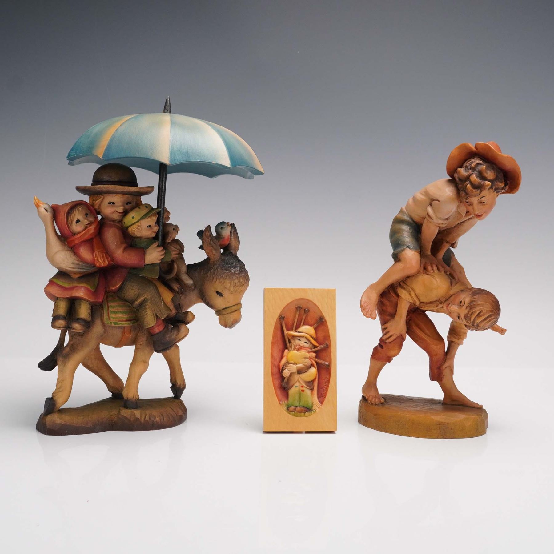Delightful group of three carved wood pieces including two ANRI figures by Jerrandiz. The first is a highly detailed figural group depicting children riding a donkey under a blue striped umbrella, full of charm and narrative appeal. The second is a vertical wall plaque featuring a child playing the bagpipes in high relief, framed in an oval recess and signed Jerrandiz. The third is an unsigned sculpture of two boys at play, captured mid leap in a spirited leapfrog pose, showcasing fluid movement and expressive carving. Anri backstamp. Marked Ferrandiz. Largest item measures: 6.75"L x 5.75"W x 10.25"H.