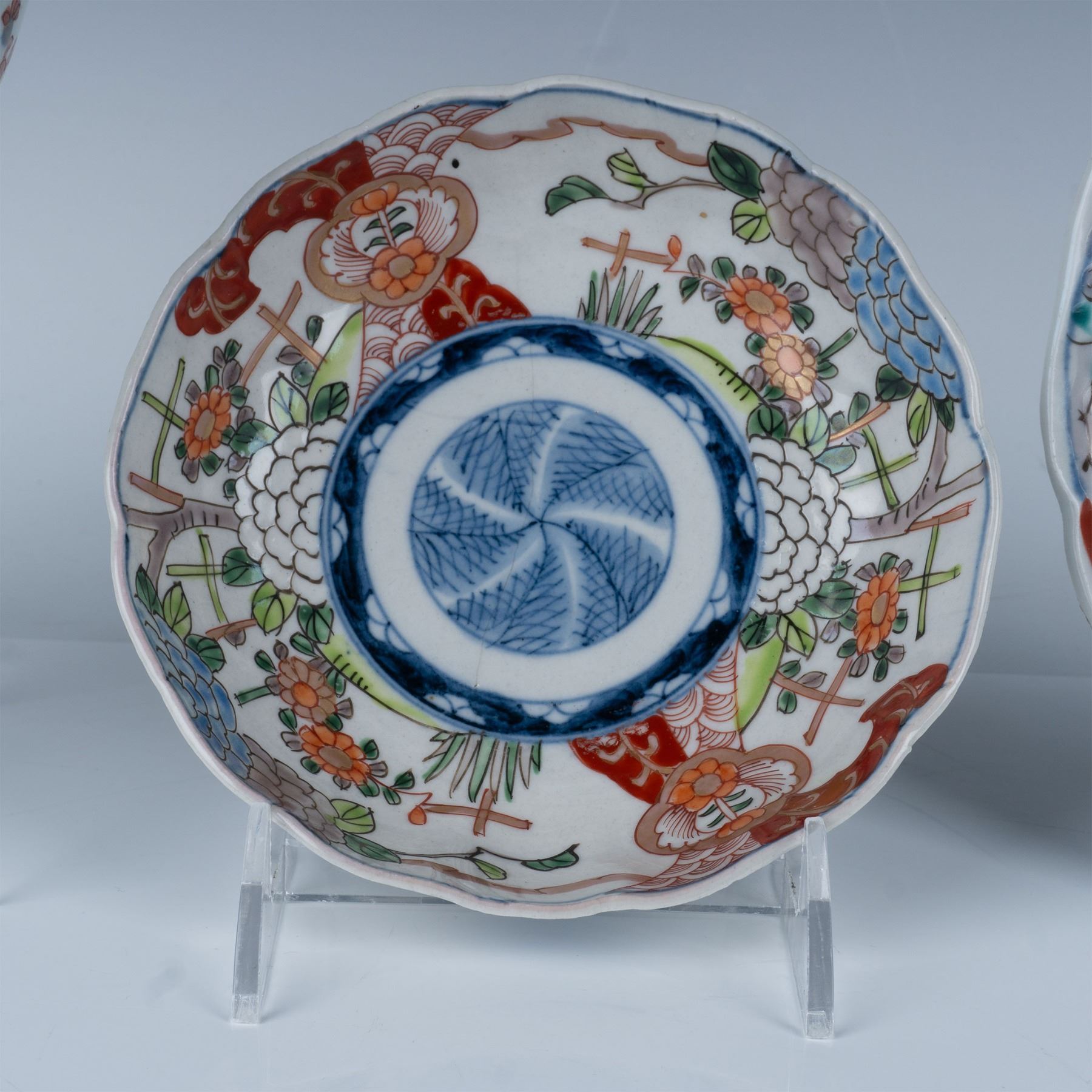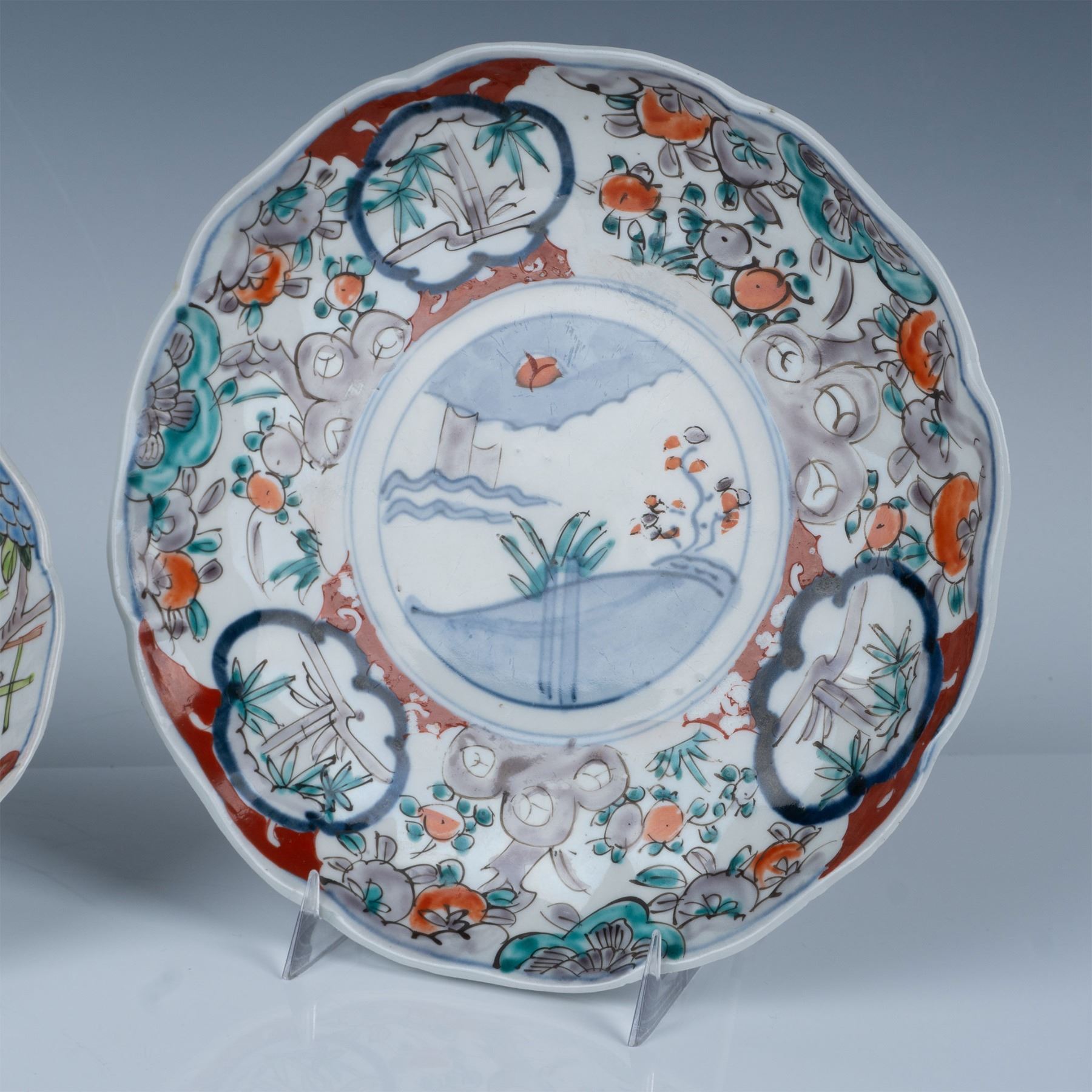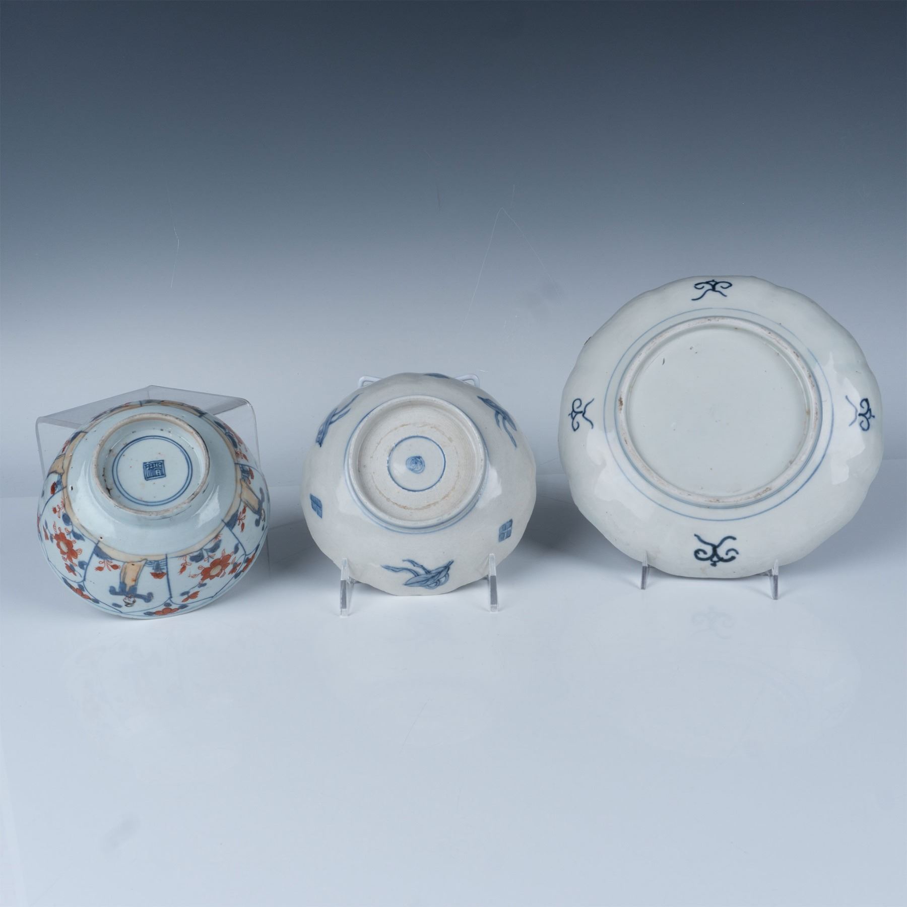 A trio of hand painted porcelain dishware rendered in shades of blue, green, red and yellow on a white base. Largest measures 8.25"L x 8.25"W x 1.5"H.