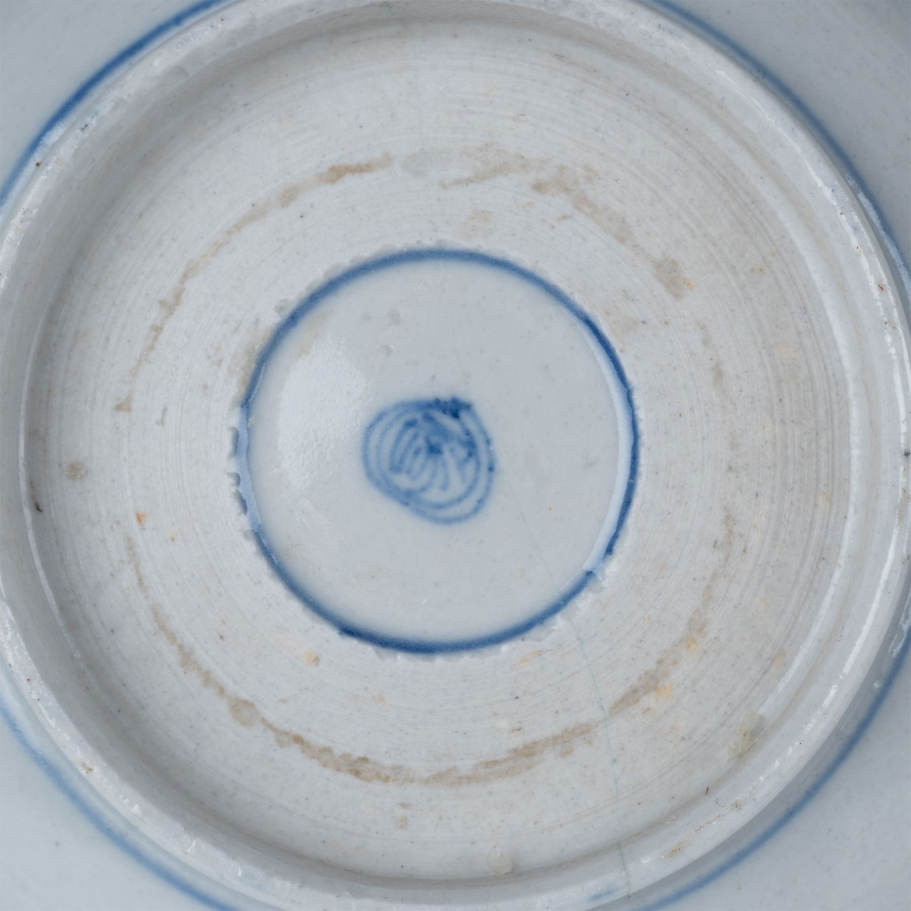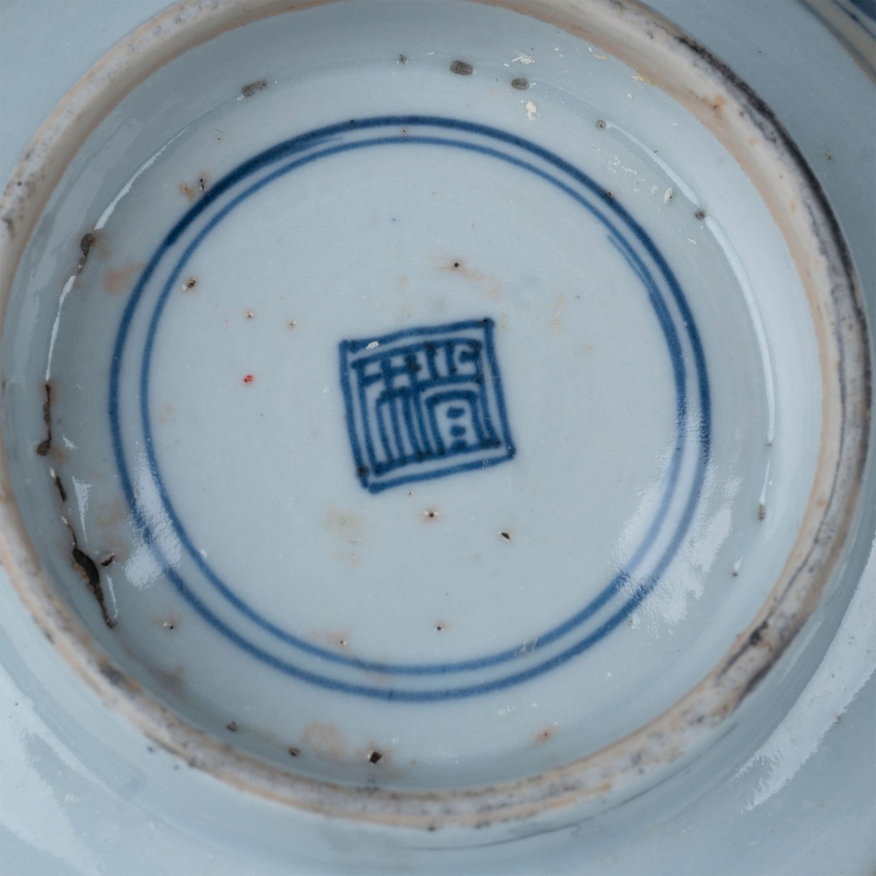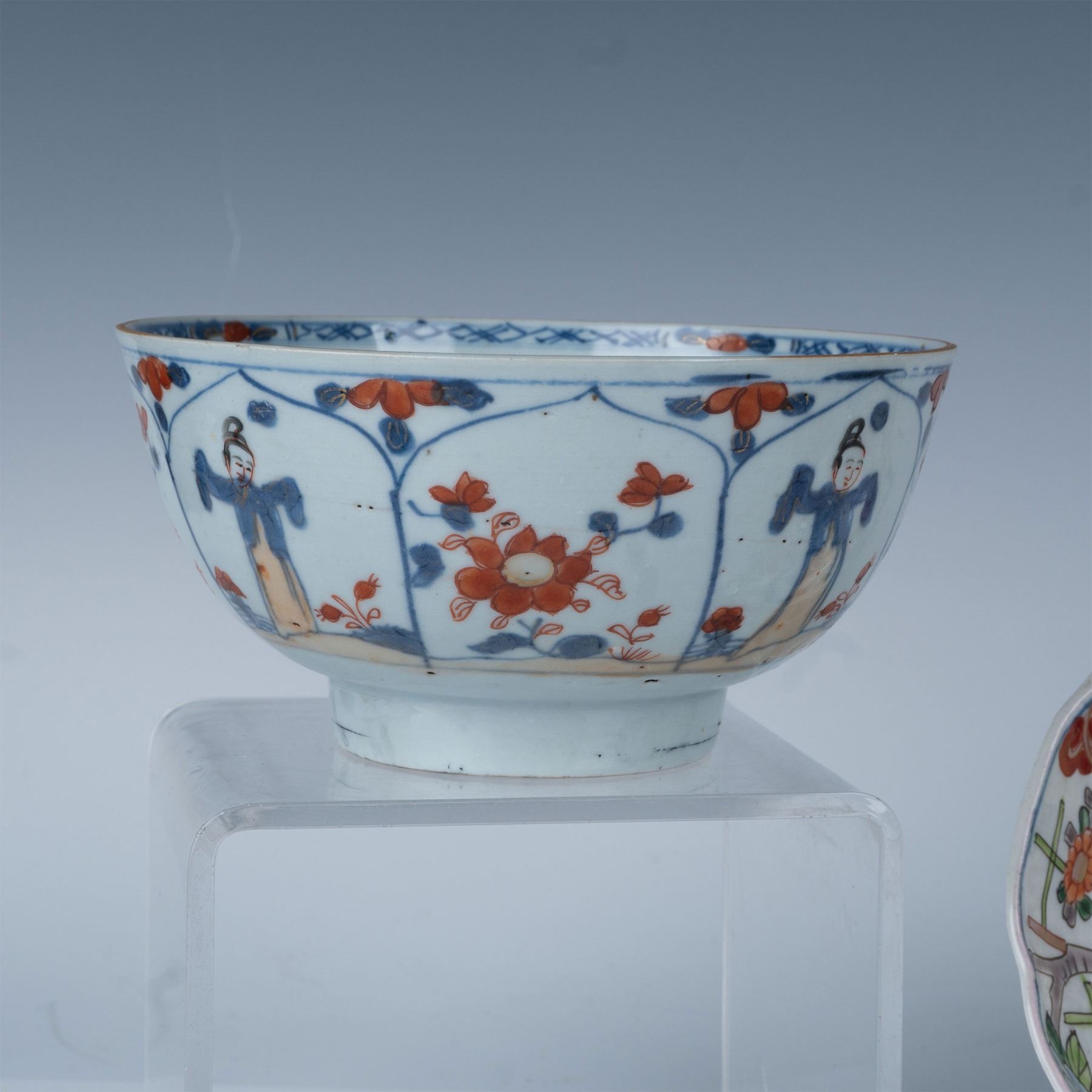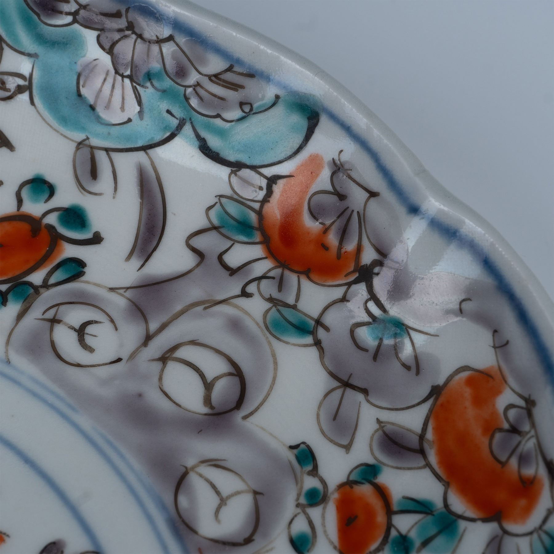 A trio of hand painted porcelain dishware rendered in shades of blue, green, red and yellow on a white base. Largest measures 8.25"L x 8.25"W x 1.5"H.
