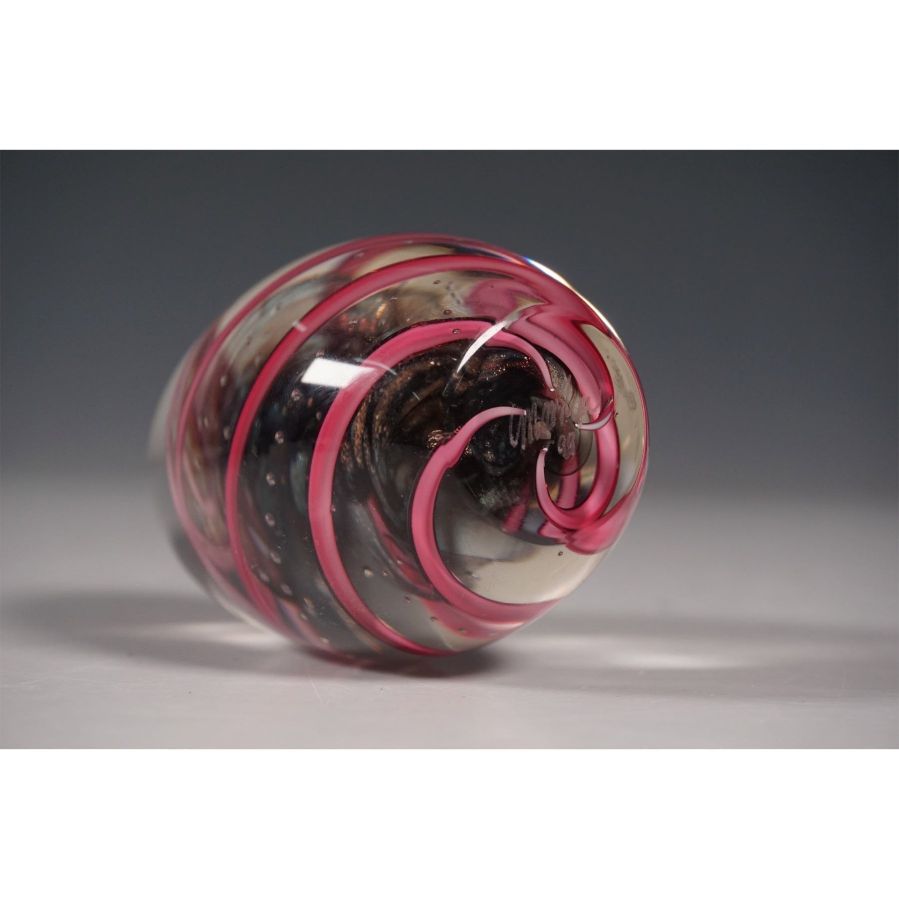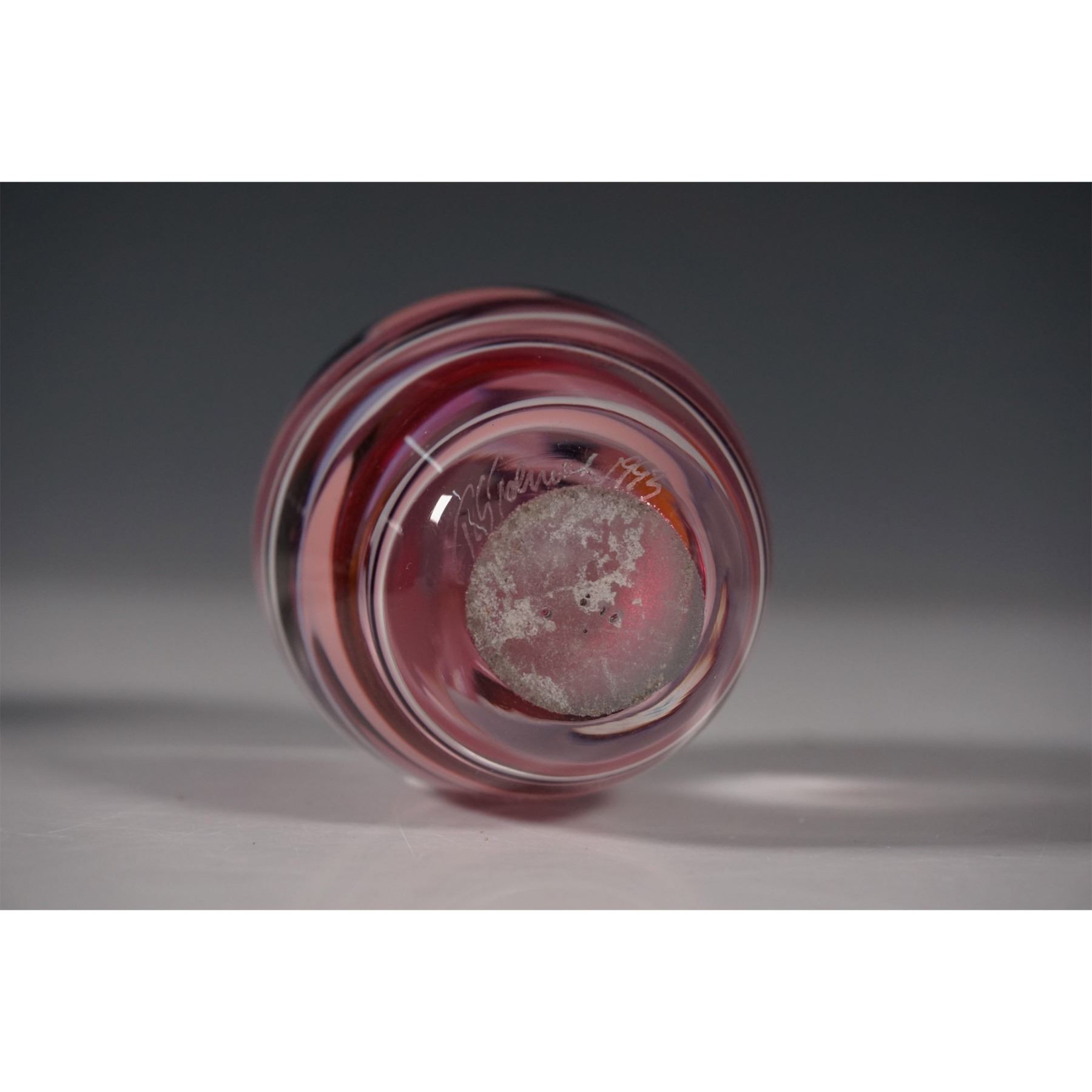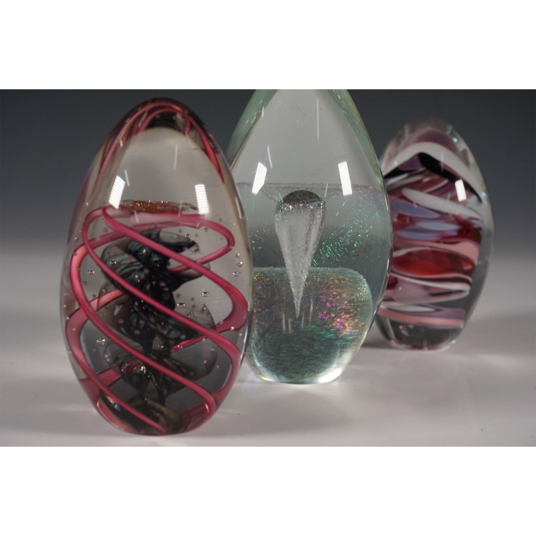 A collection of three signed art glass paperweights. The lot includes a 1996 Robert Eickholt piece with a clear form and shimmering iridescent interior, a 1999 Marilyn Kimble Holt paperweight featuring a striking black and pink swirl design with controlled bubbles, and a third signed and dated 1993 piece showcasing a vibrant mix of pink, purple, and white swirls. These handcrafted works exhibit exceptional glass artistry and intricate detailing. Tallest item: 4.5"H.