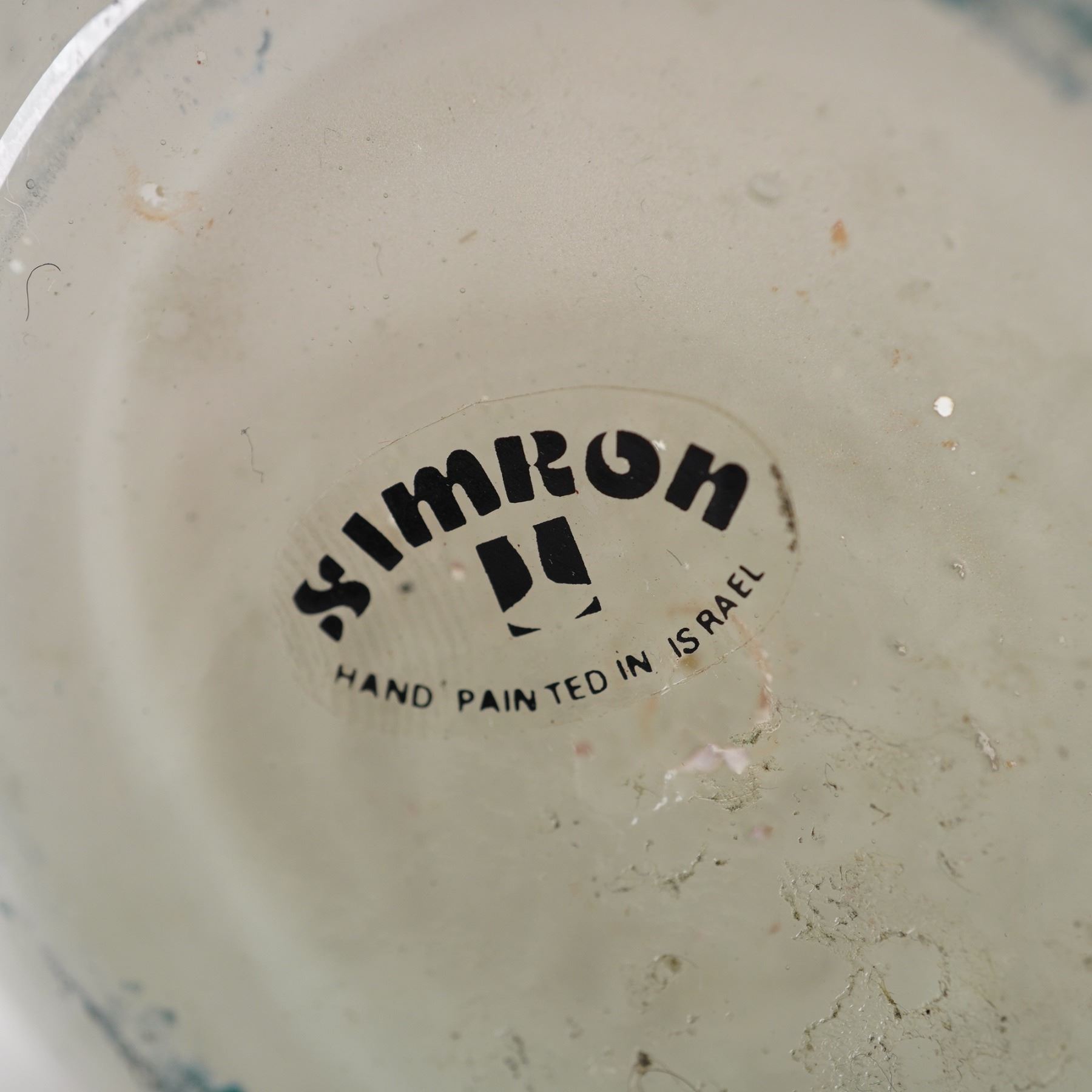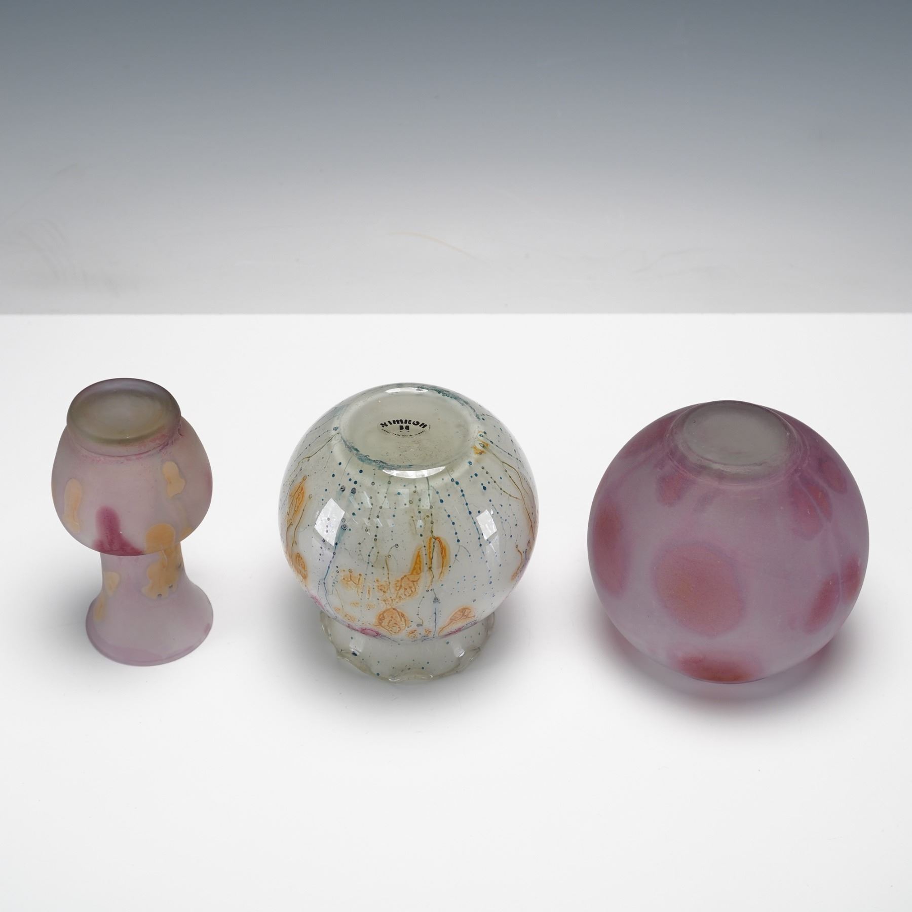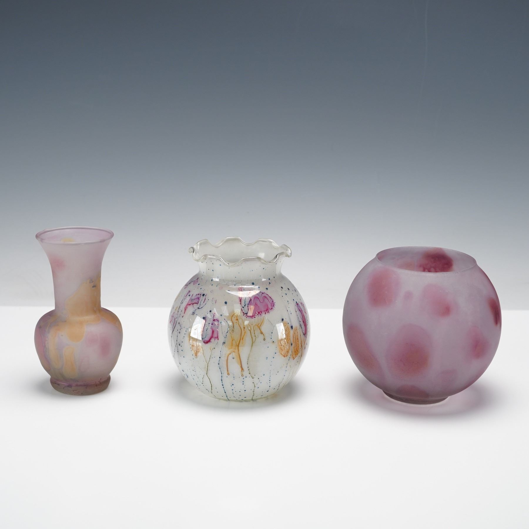 Beautiful grouping of three handblown art glass vases, each with distinctive coloration and surface treatment. The centerpiece is a ruffled glass vase marked Simron, hand painted in Israel, featuring a clear ground with applied pink and gold abstract patterning and delicate speckling throughout. It is complemented by two coordinating art glass vases in shades of pink and mauve - one with soft satin frosted finish and warm amber veining, and the other with a rounded form and subtle internal marbling. Together, the trio forms an eye-catching display of artistry and form, ideal for collectors or modern decor.