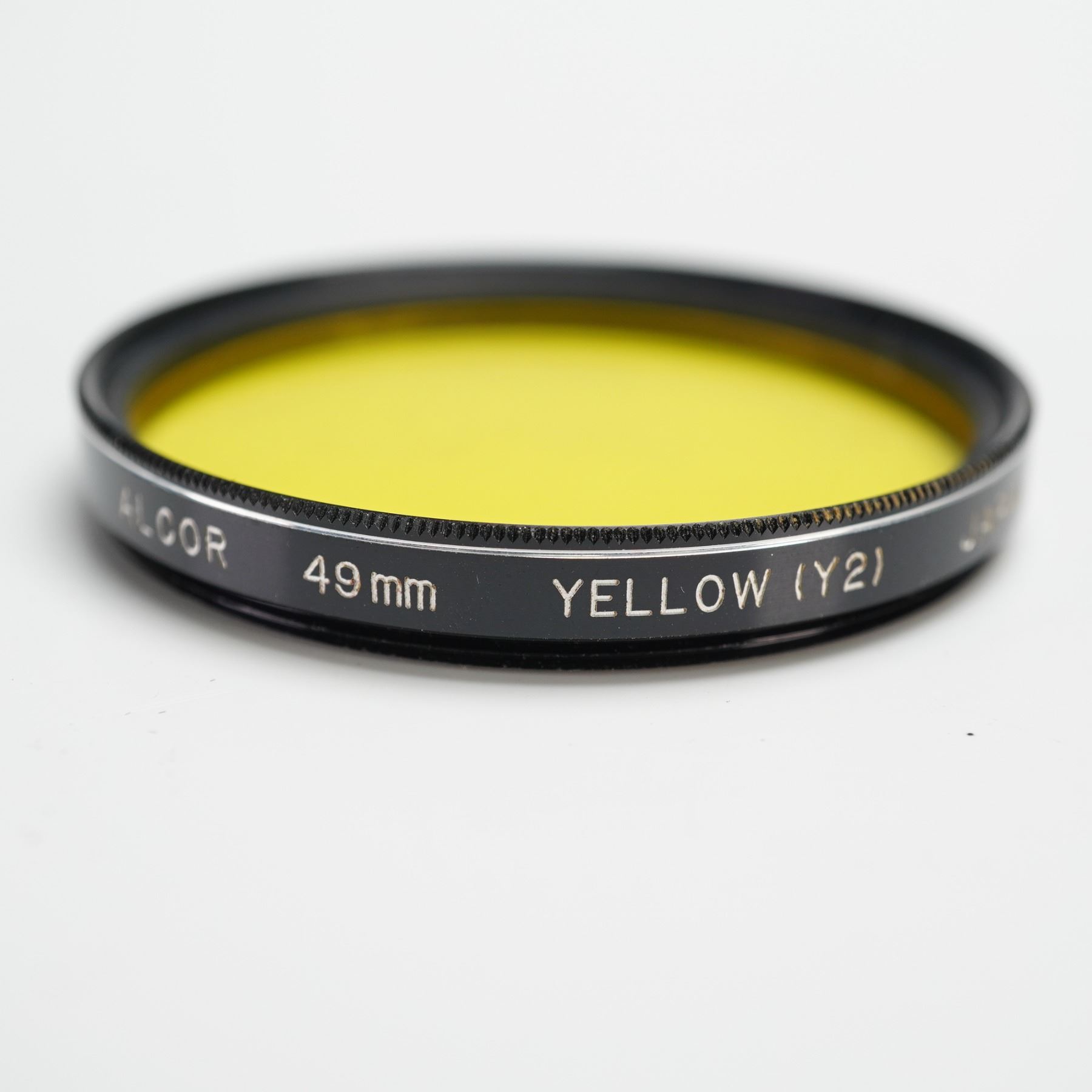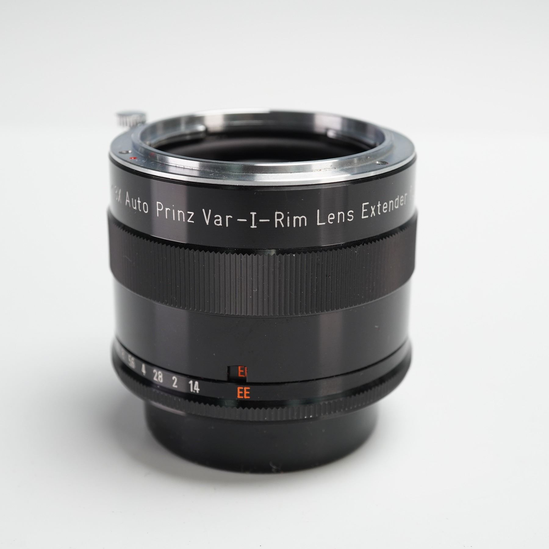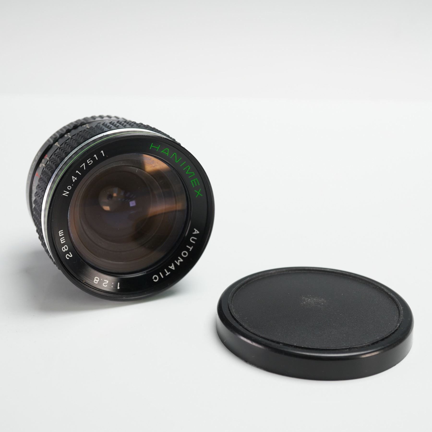 A collection of vintage photography accessories including an Asahi Pentax SMC Pentax-M 135mm f/3.5 telephoto lens marked "Asahi Opt. Co. Japan," a Hanimex Automatic 28mm f/2.8 wide-angle lens marked No. 417511, and a Prinz Var-I-Rim Auto Lens Extender featuring adjustable magnification. Accompanying the lenses is an Alcor 49mm Yellow (Y2) filter in original case and box, designed to enhance contrast in black and white photography. The lot also includes lens caps, carrying cases, and pouches as shown.