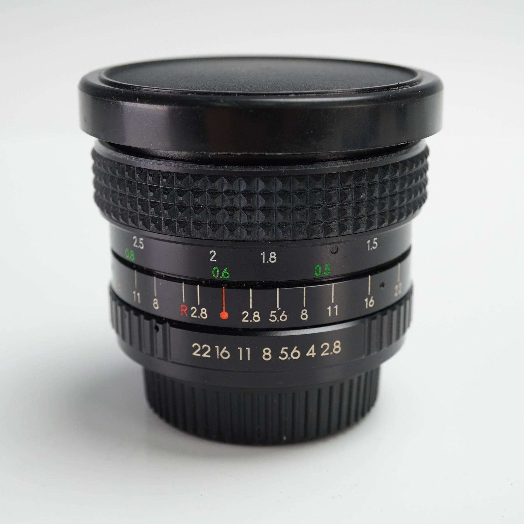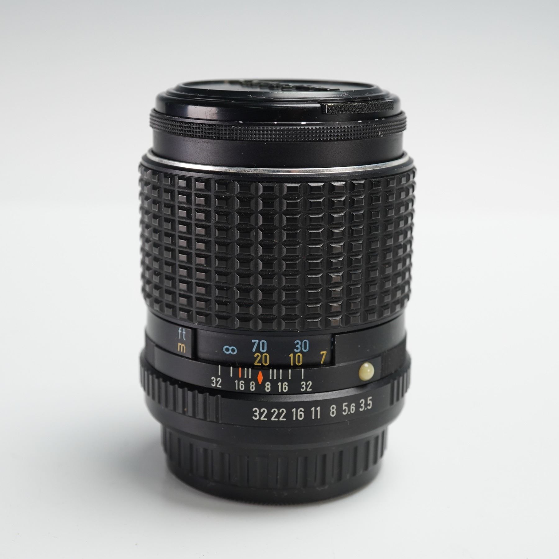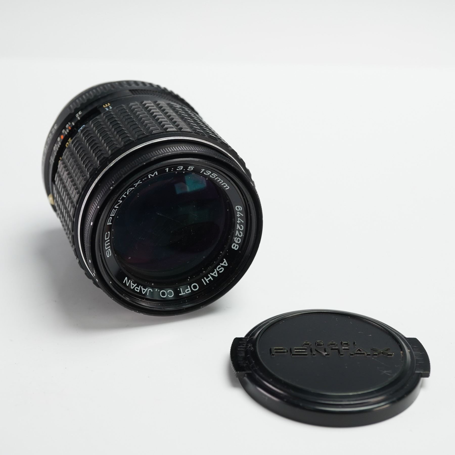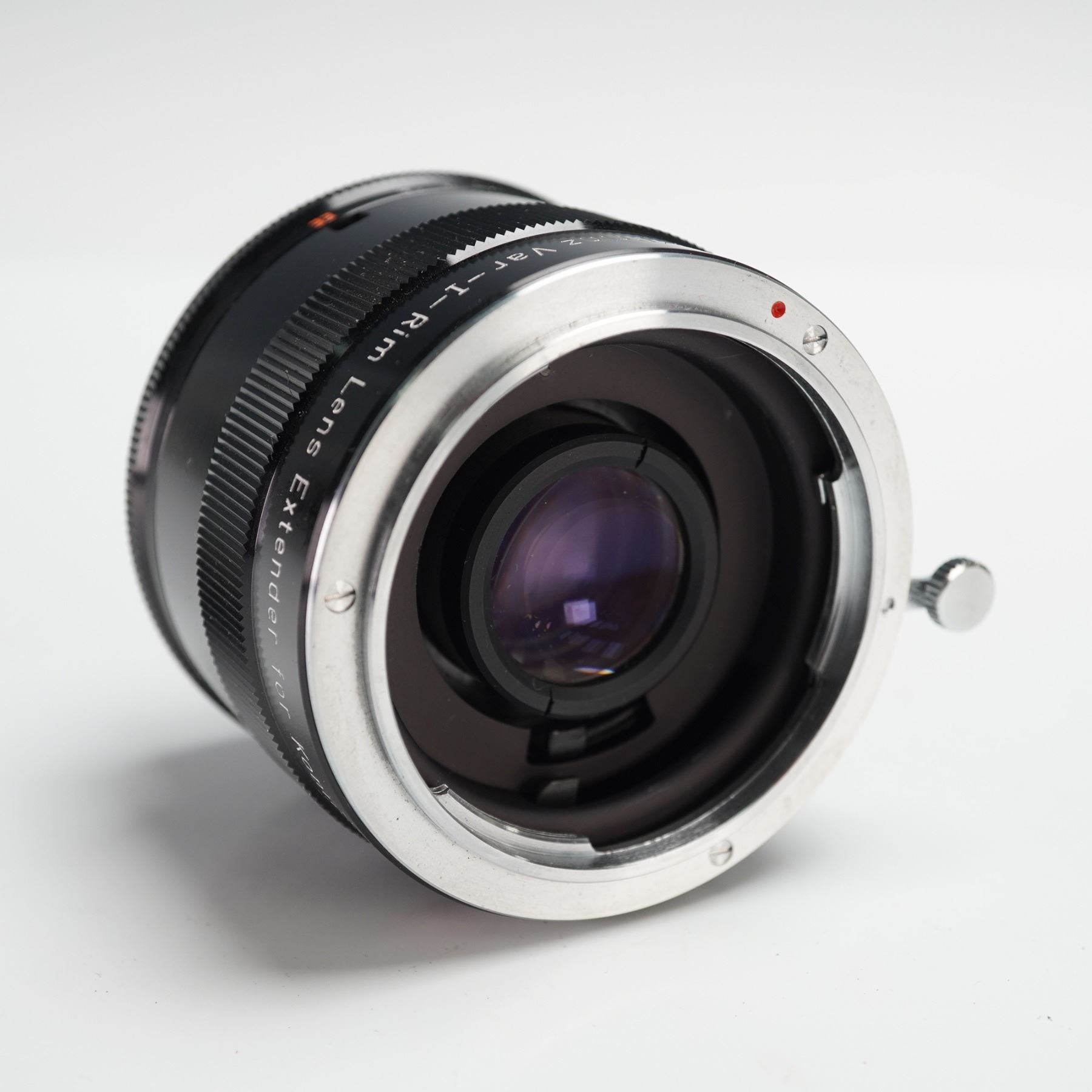 A collection of vintage photography accessories including an Asahi Pentax SMC Pentax-M 135mm f/3.5 telephoto lens marked "Asahi Opt. Co. Japan," a Hanimex Automatic 28mm f/2.8 wide-angle lens marked No. 417511, and a Prinz Var-I-Rim Auto Lens Extender featuring adjustable magnification. Accompanying the lenses is an Alcor 49mm Yellow (Y2) filter in original case and box, designed to enhance contrast in black and white photography. The lot also includes lens caps, carrying cases, and pouches as shown.
