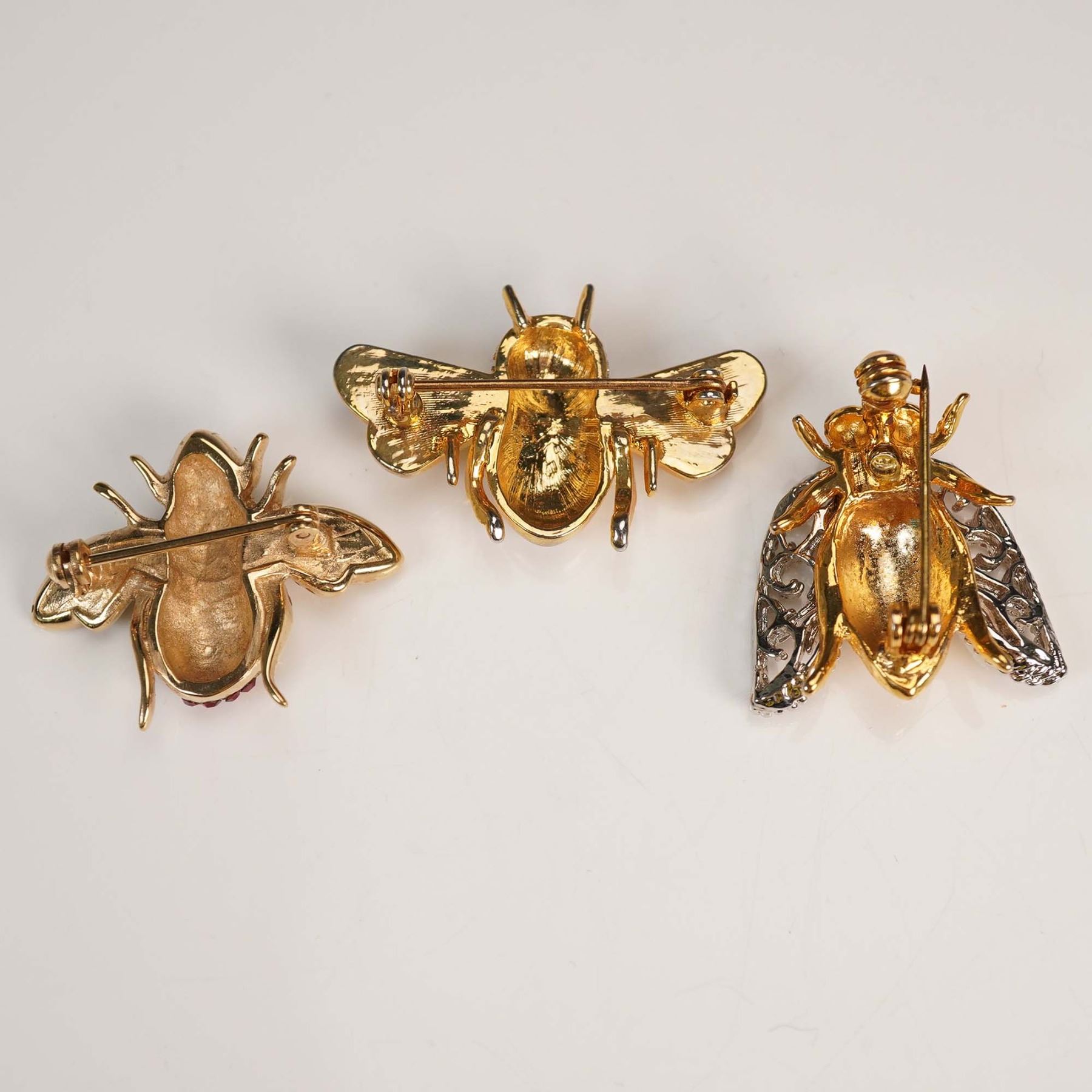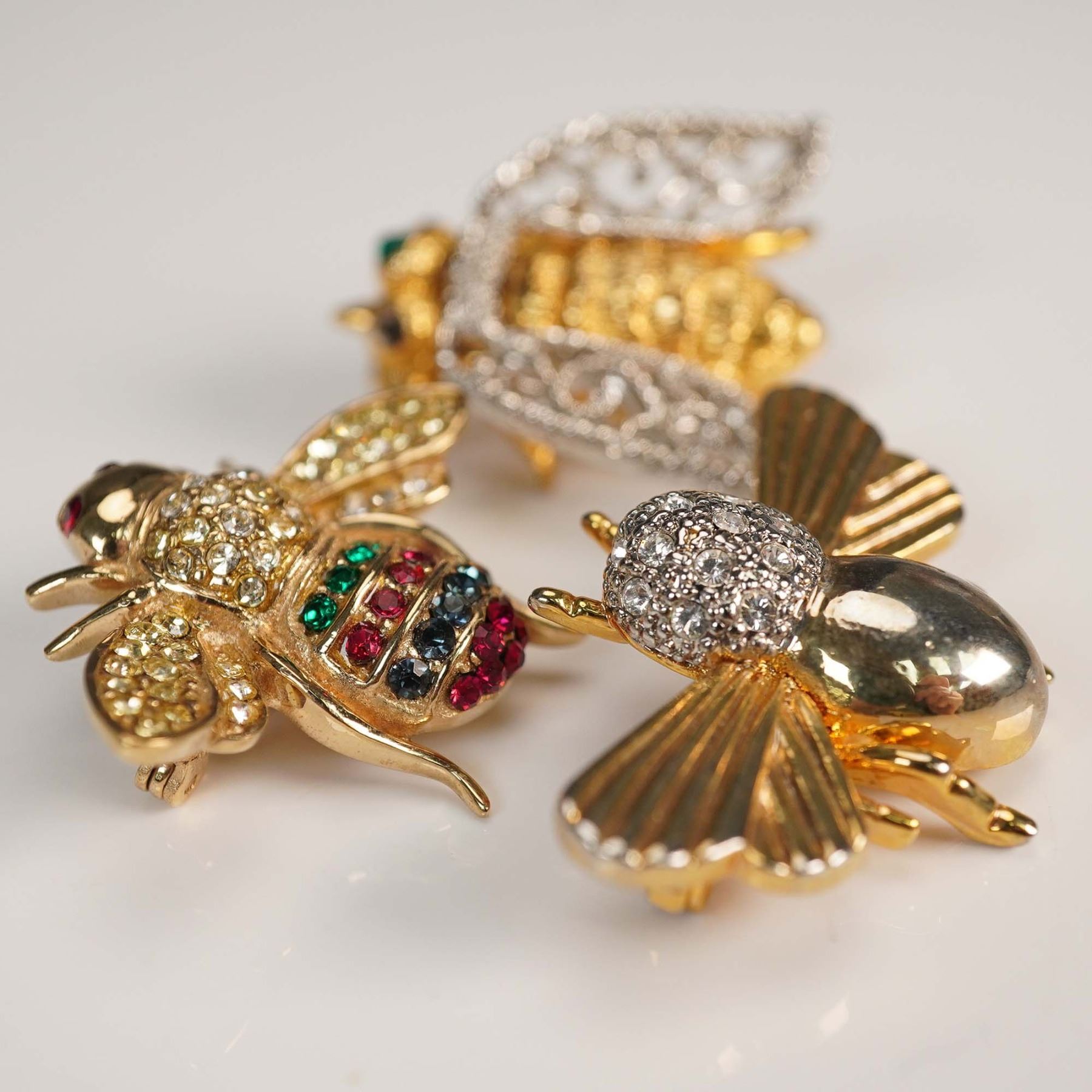 Group of three bee-inspired brooches crafted in gold-tone metal with various embellishments. Includes a bee brooch with multicolored rhinestone stripes, a sculptural gold and silver-tone bee with a domed body and textured wings, and a third brooch featuring intricate filigree wings with a textured gold body and green accent eyes. All are fitted with pin-back closures. Unmarked. Each brooch measures approximately 1"H, with one slightly larger at 1.25"H.