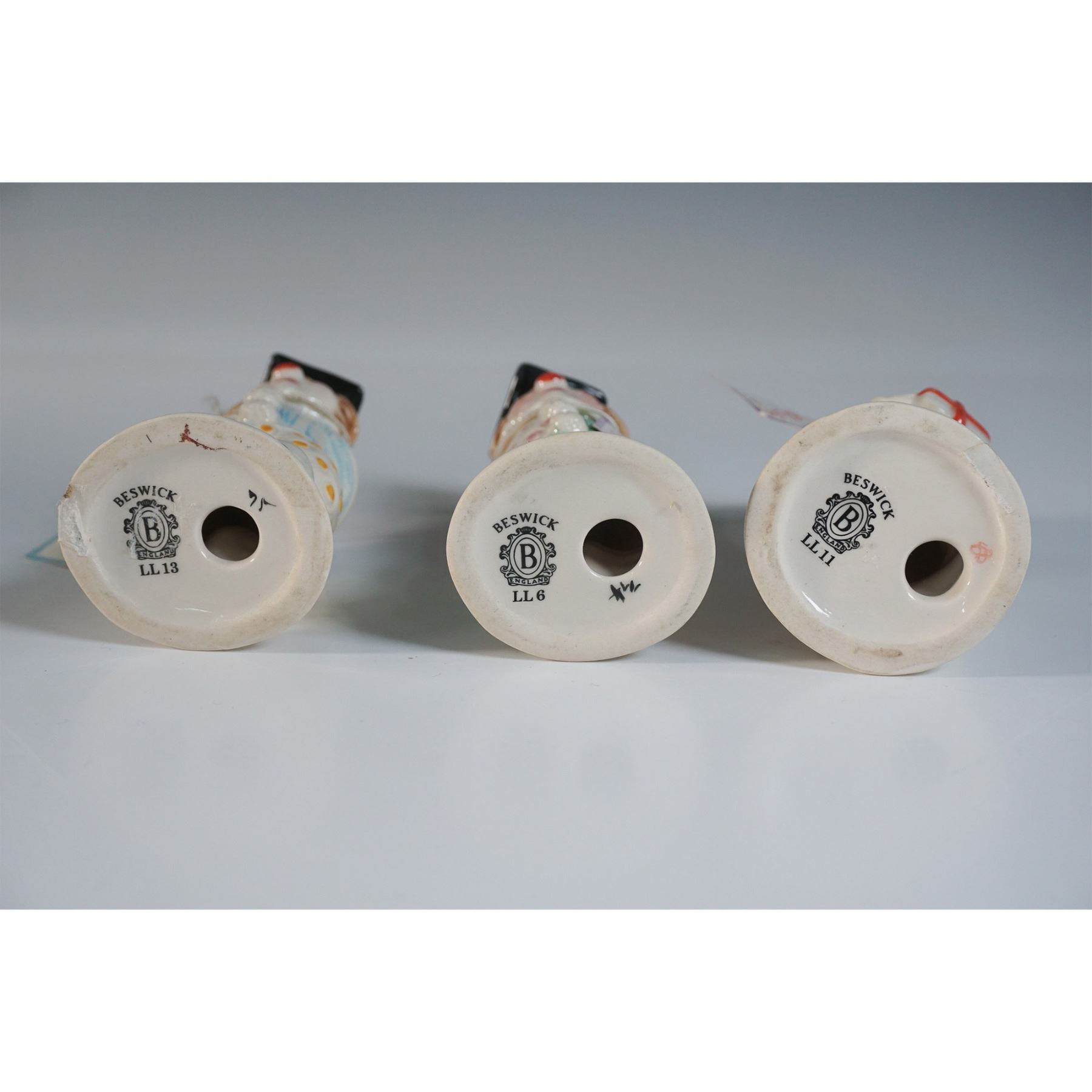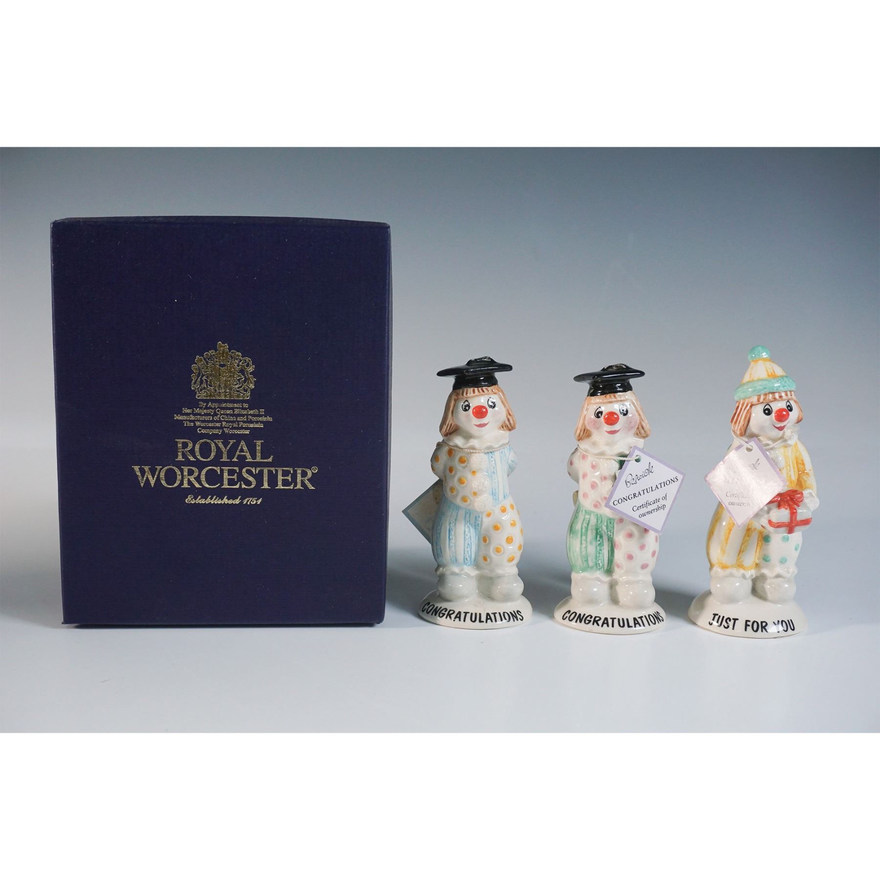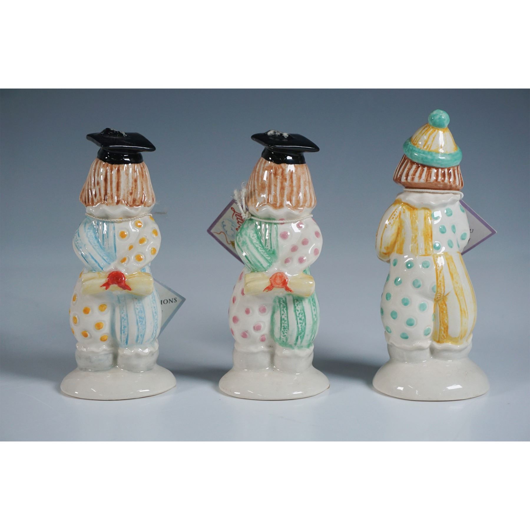 A delightful set of three Beswick Little Lovables porcelain clown figurines. Each clown is hand-painted with bright, cheerful colors and fine detailing, featuring two Congratulations clowns wearing graduation caps and one Just For You clown holding a gift. The figurines come with original tags and certificates of ownership. These whimsical collectibles are perfect for celebrating special occasions or adding a playful touch to any display.