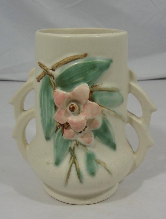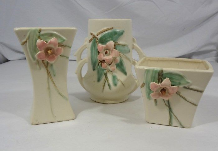 3pc Blossomtime Vases signed by McCoy. Warman's "McCoy Pottery" book has these pieces listed throughout the book. A beautiful set to add to any collection! Est Value $60.00-80.00