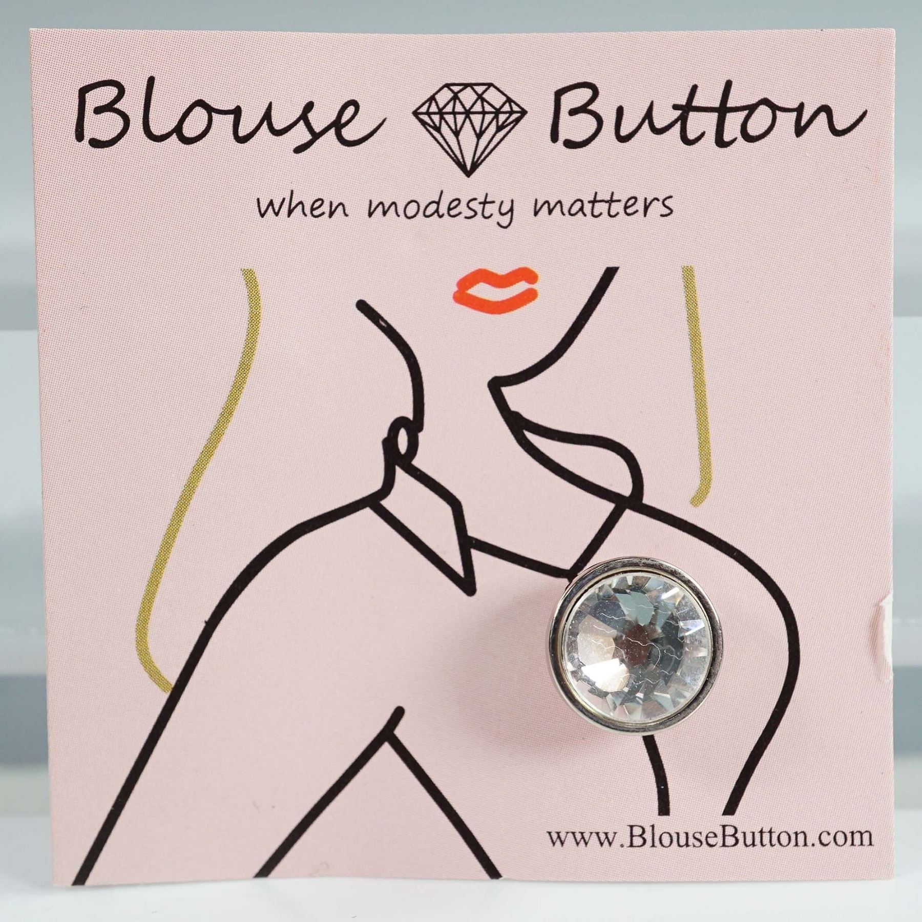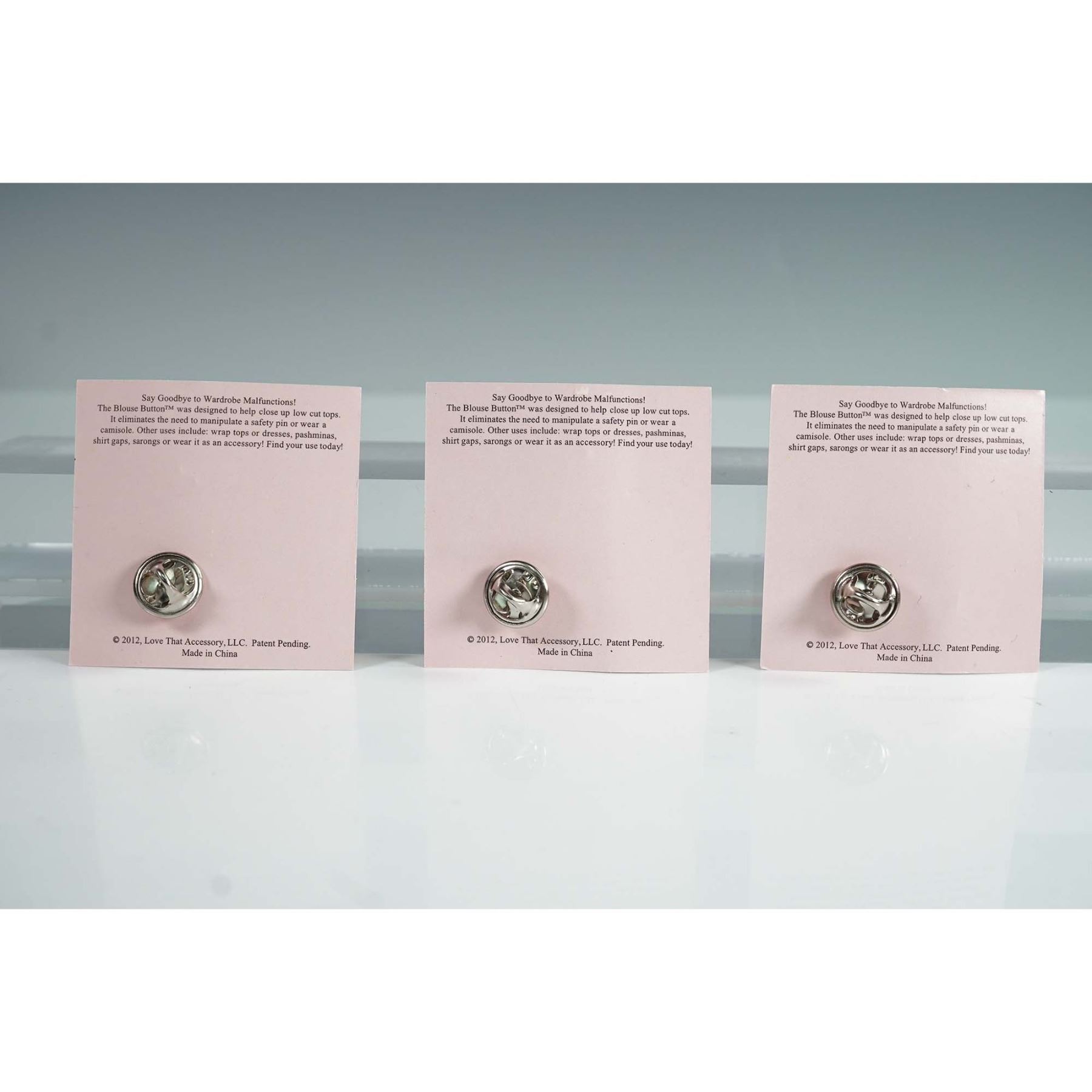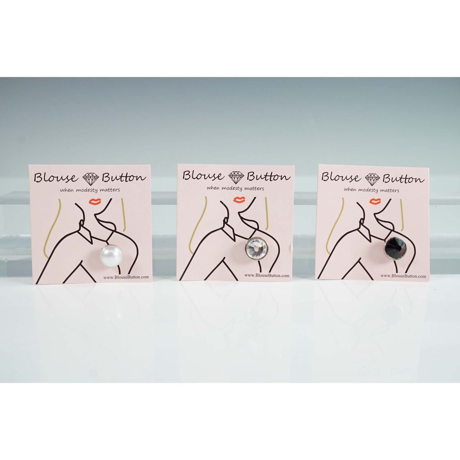 Set of three BlouseButton decorative fasteners, designed as functional fashion accessories to help secure wrap tops, low-cut blouses, or close shirt gaps. This set includes a round white faux pearl BlouseButton, a faceted clear crystal-style button, and a jet black faceted button set in silver-tone metal. Each BlouseButton is affixed to its original card, marked with branding and the slogan "when modesty matters."
