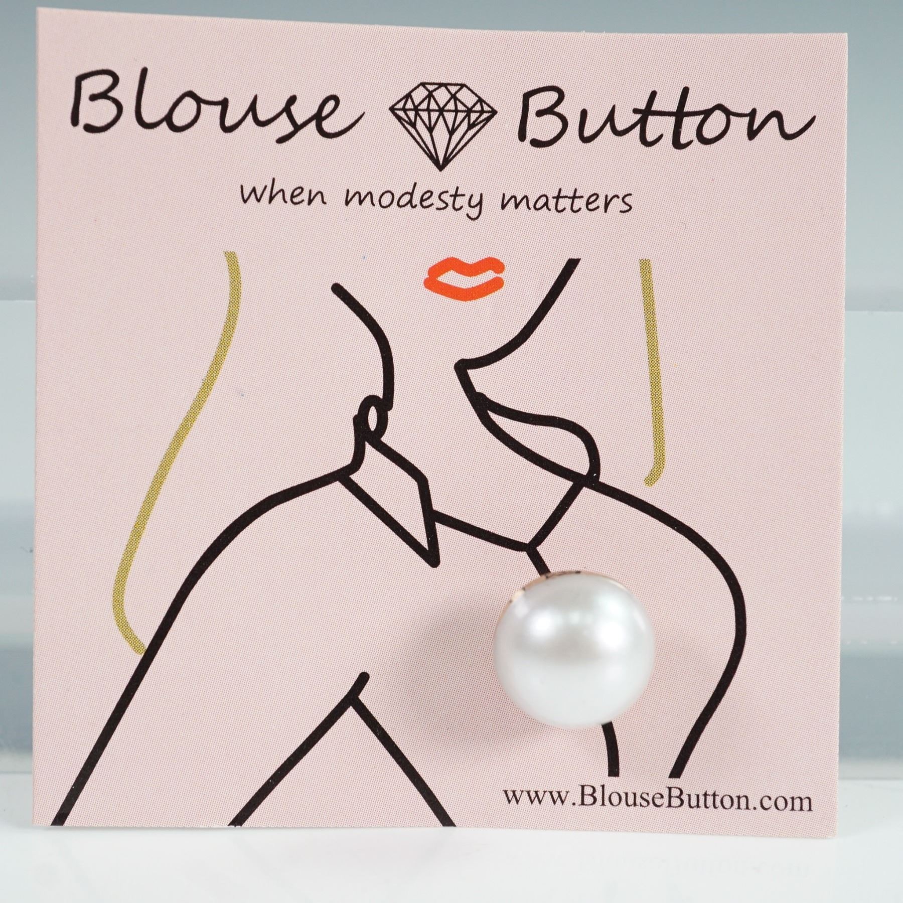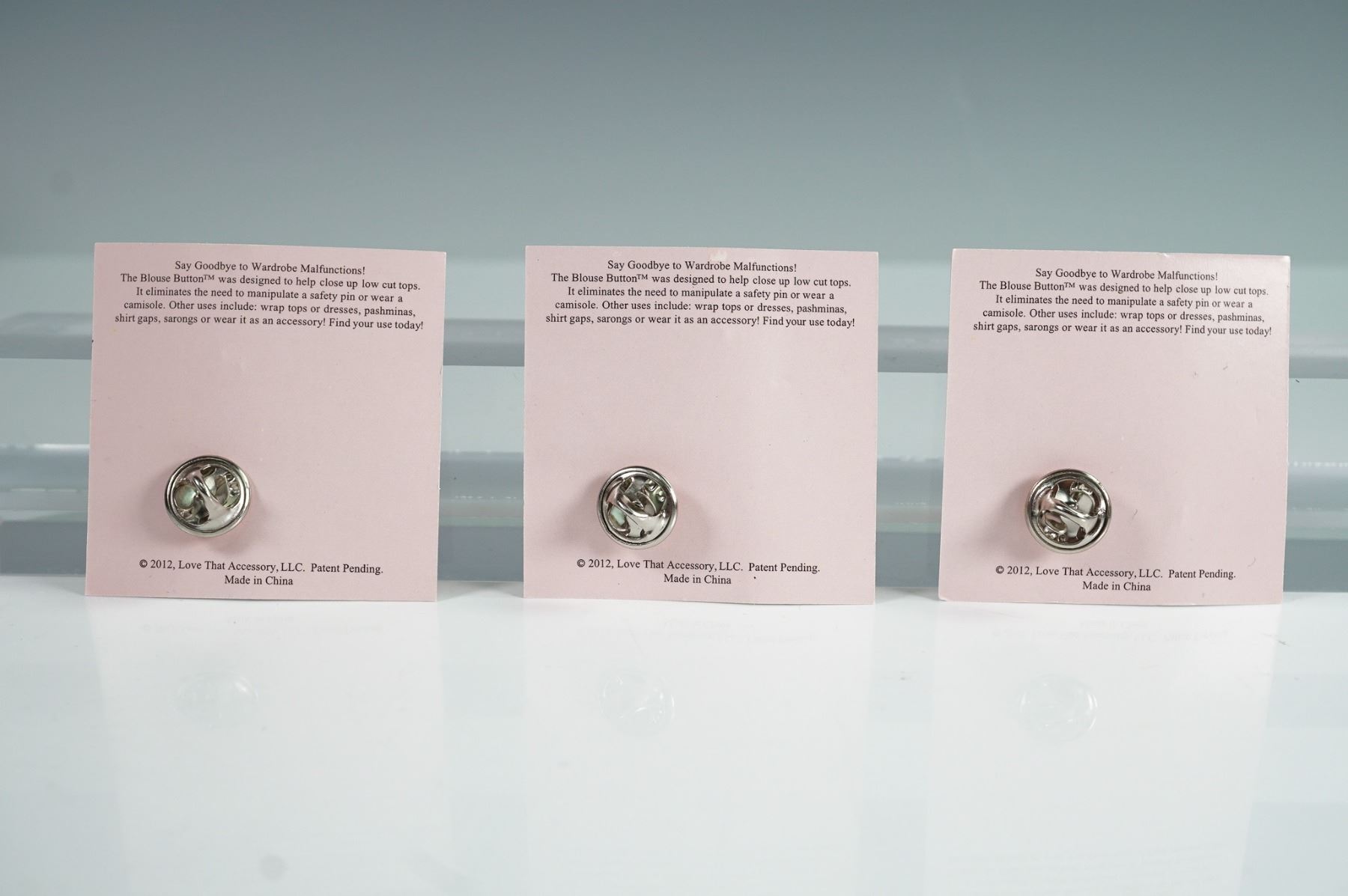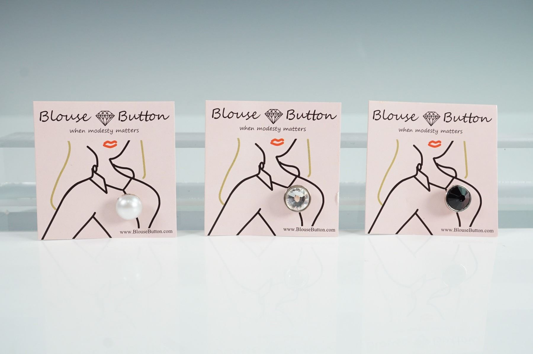 Set of three BlouseButton decorative fasteners, designed as functional fashion accessories to help secure wrap tops, low-cut blouses, or close shirt gaps. This set includes a round white faux pearl BlouseButton, a faceted clear crystal-style button, and a jet black faceted button set in silver-tone metal. Each BlouseButton is affixed to its original card, marked with branding and the slogan "when modesty matters."