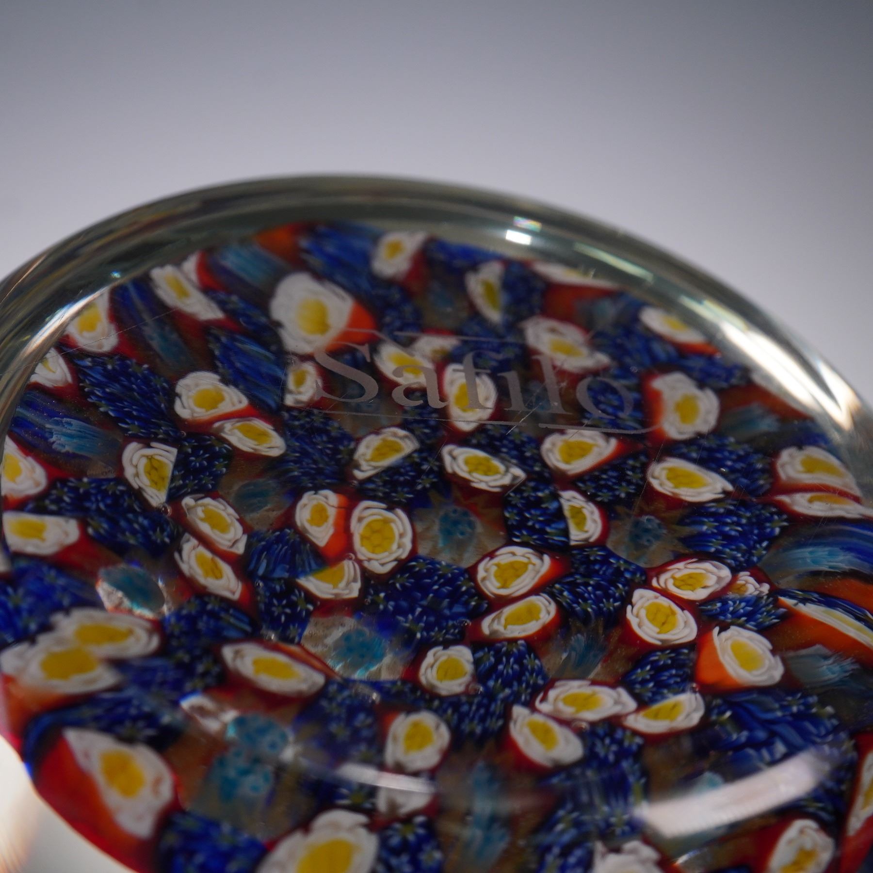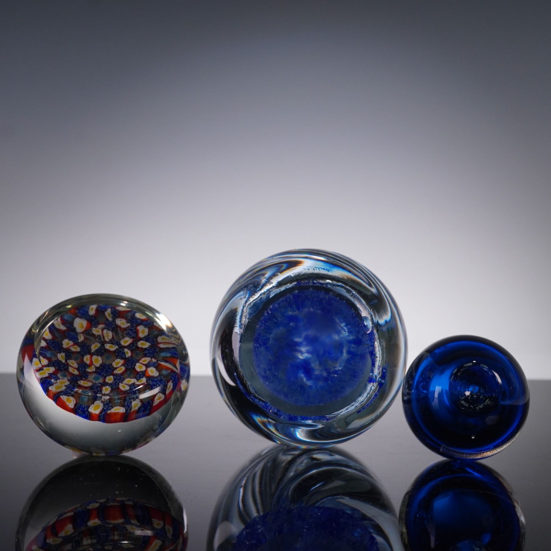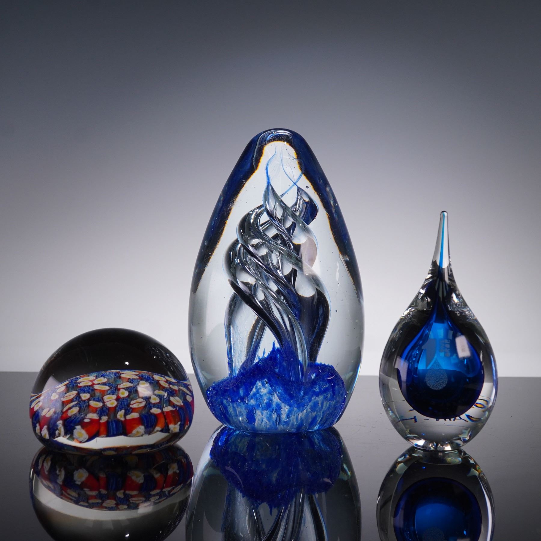 A three piece assortment of decorative art glass paperweights comprising a millefiori dome with a densely packed field of colorful canes in red, white, blue, and yellow, a tall clear glass weight enclosing swirling cobalt ribbons rising from a bed of mottled blue, and a teardrop-shaped weight containing a suspended deep blue orb encased within clear crystal. Tear drop paperweight sticker labeled "Cassandre - Canada Hand Made".