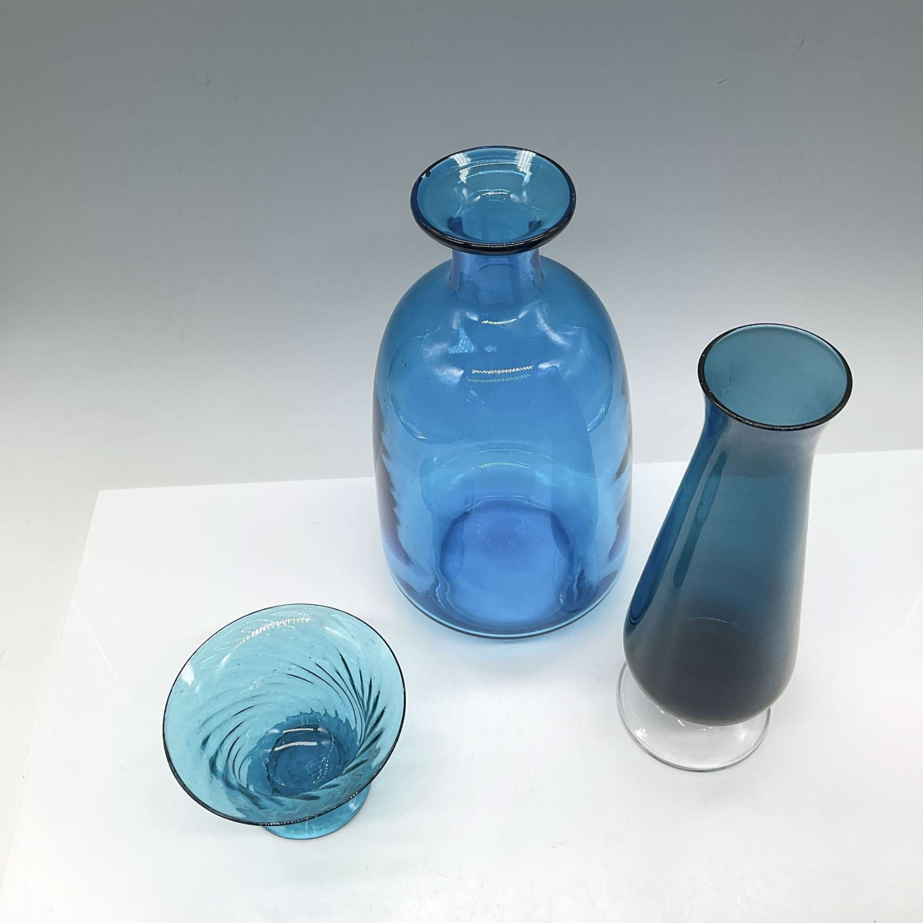 Art glass decor in variations of blue includes vase with clear round base (8.5"H), bottle vase (9"H) and swirl glass dish (2.75"H). Unmarked. Largest piece 9"H x 4.25" dia.