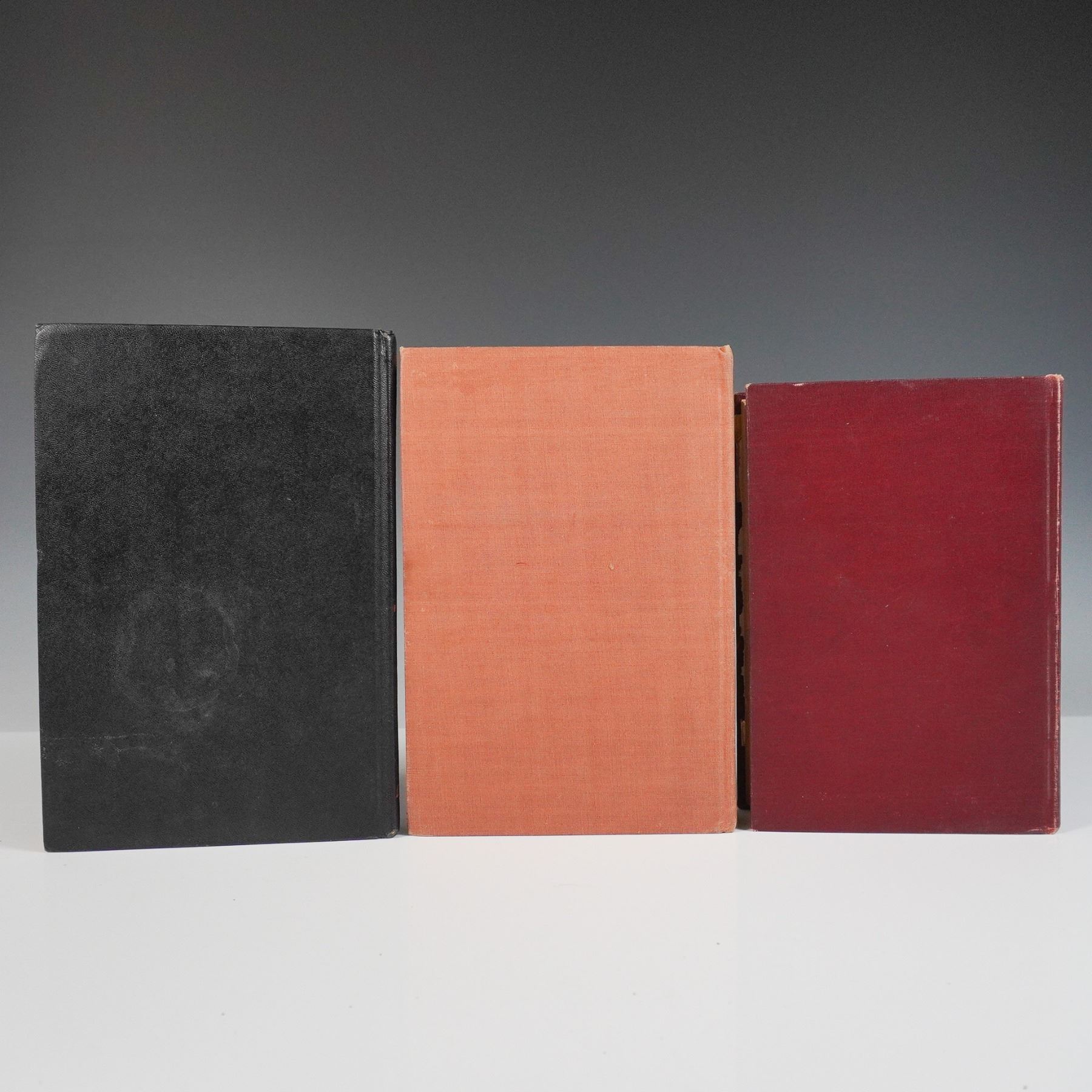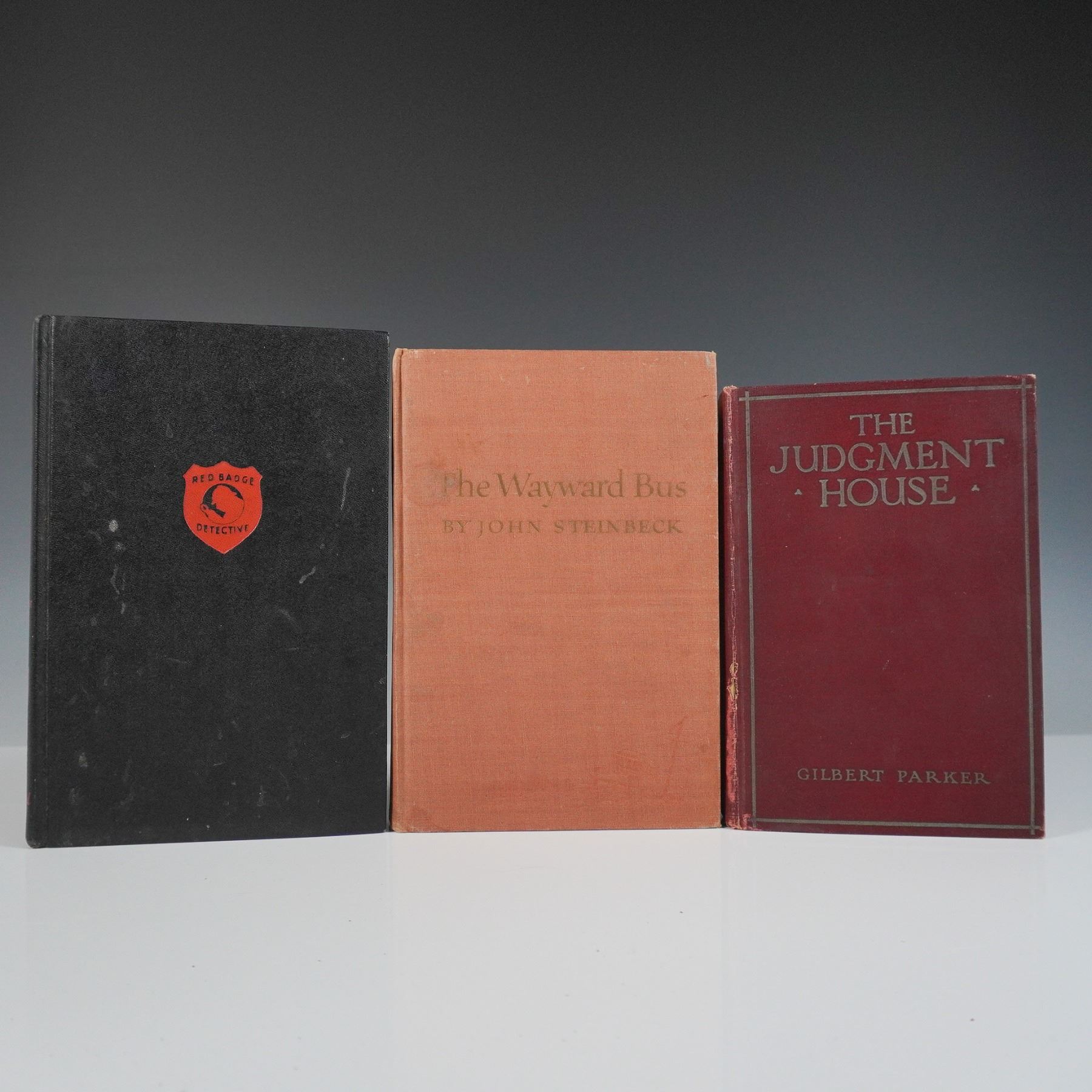 A collection of three vintage hardcover books, each representing a notable literary genre. This lot includes The Wayward Bus by John Steinbeck published by The Viking Press in 1947 a compelling novel from the Pulitzer Prize winning author The Judgment House by Gilbert Parker published by Harper and Brothers in 1913 an early 20th century literary work reflecting historical and romantic themes and Shadow of Madness by Hugh Pentecost a mystery novel published by Dodd, Mead and Company part of the Red Badge Mystery series. Dimensions of largest item: 5.75"L x 1"W x 8.5"H.