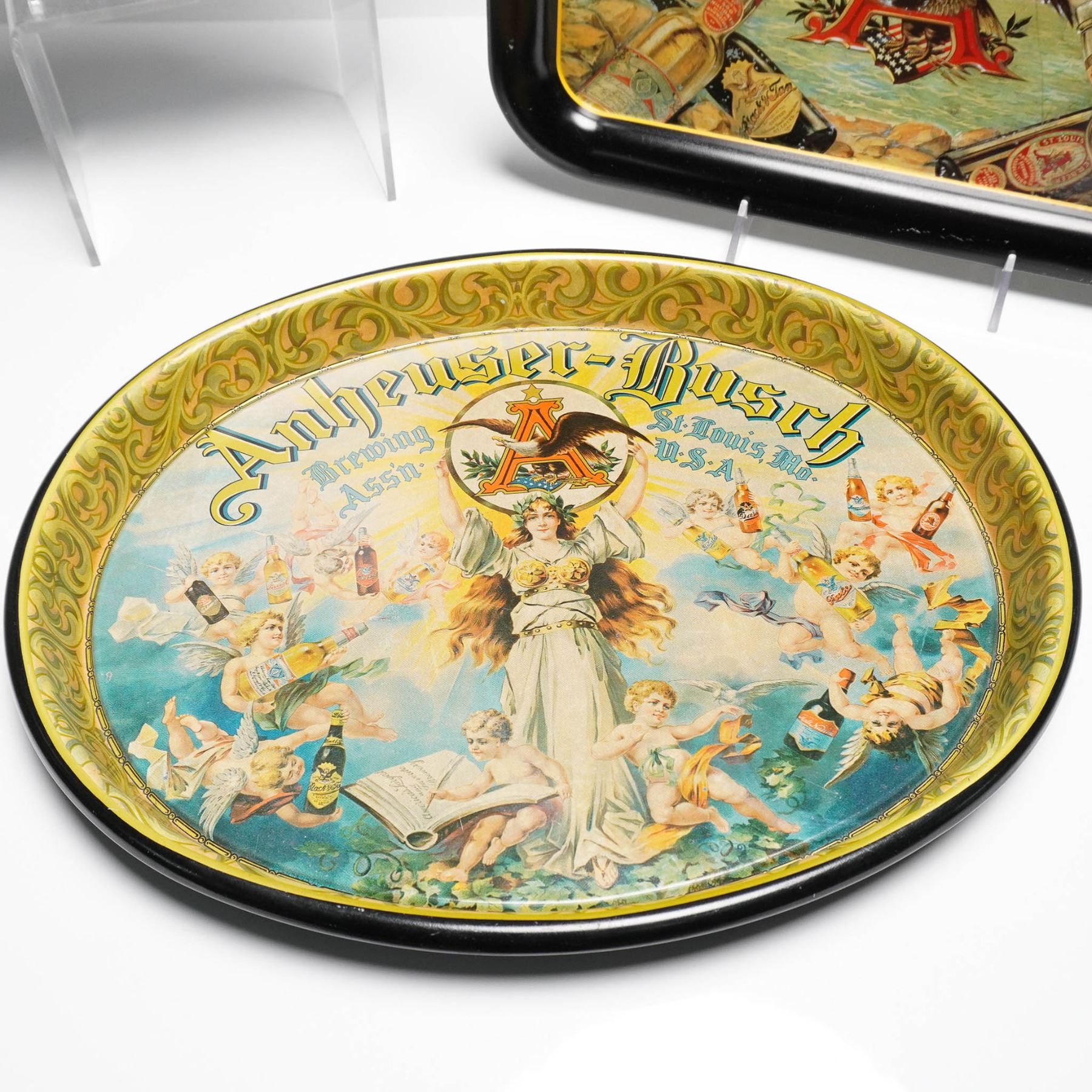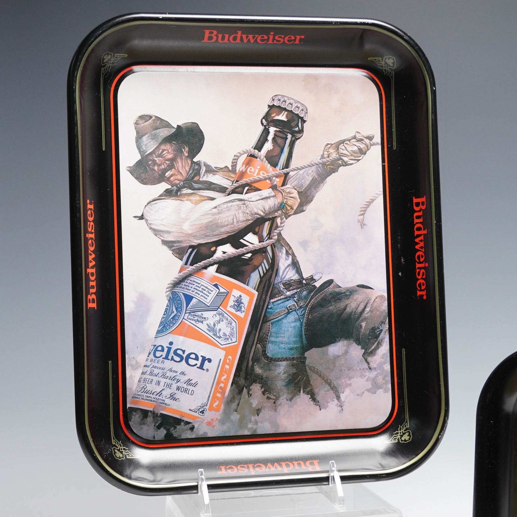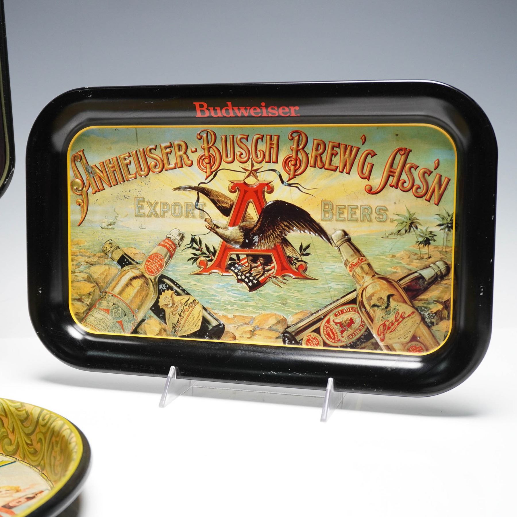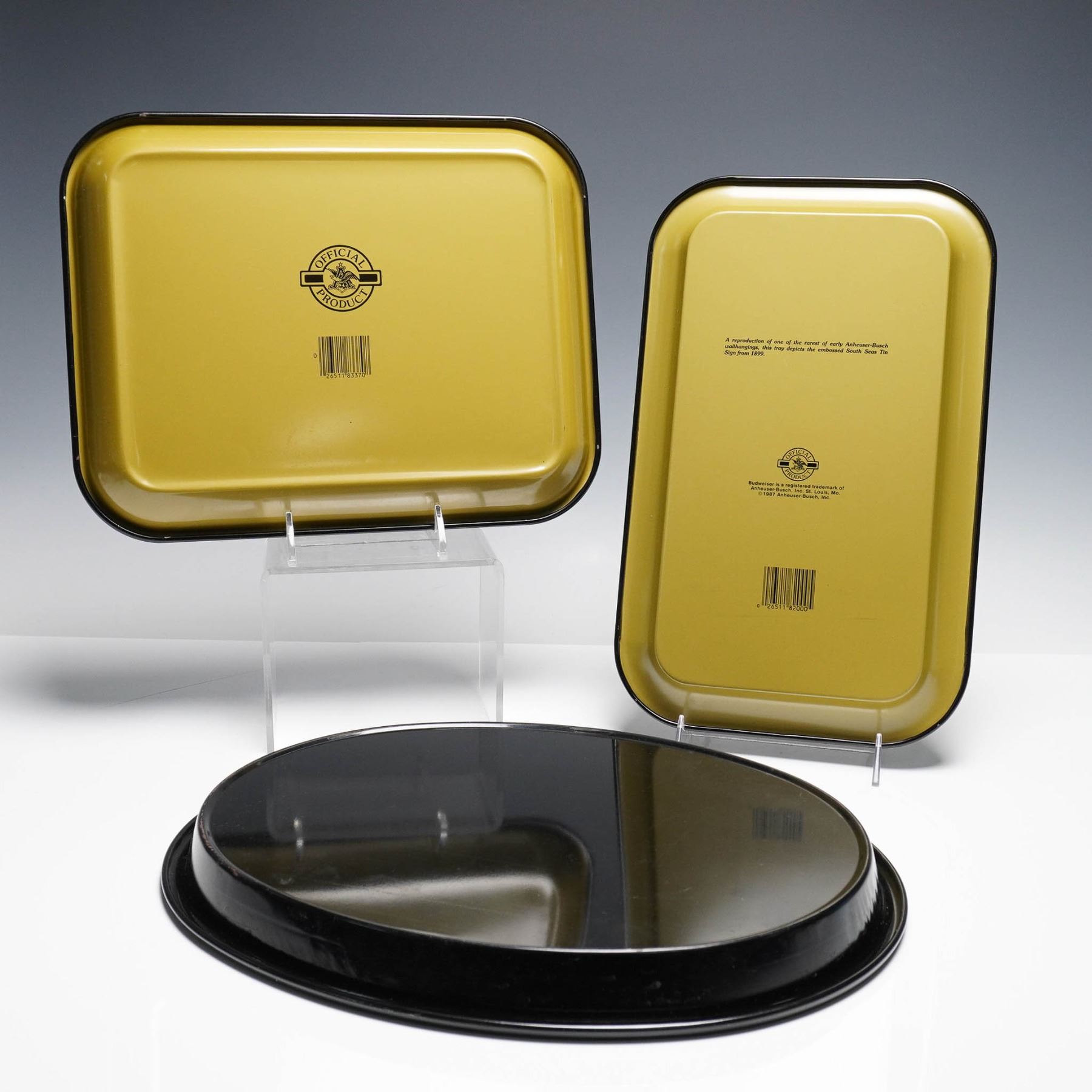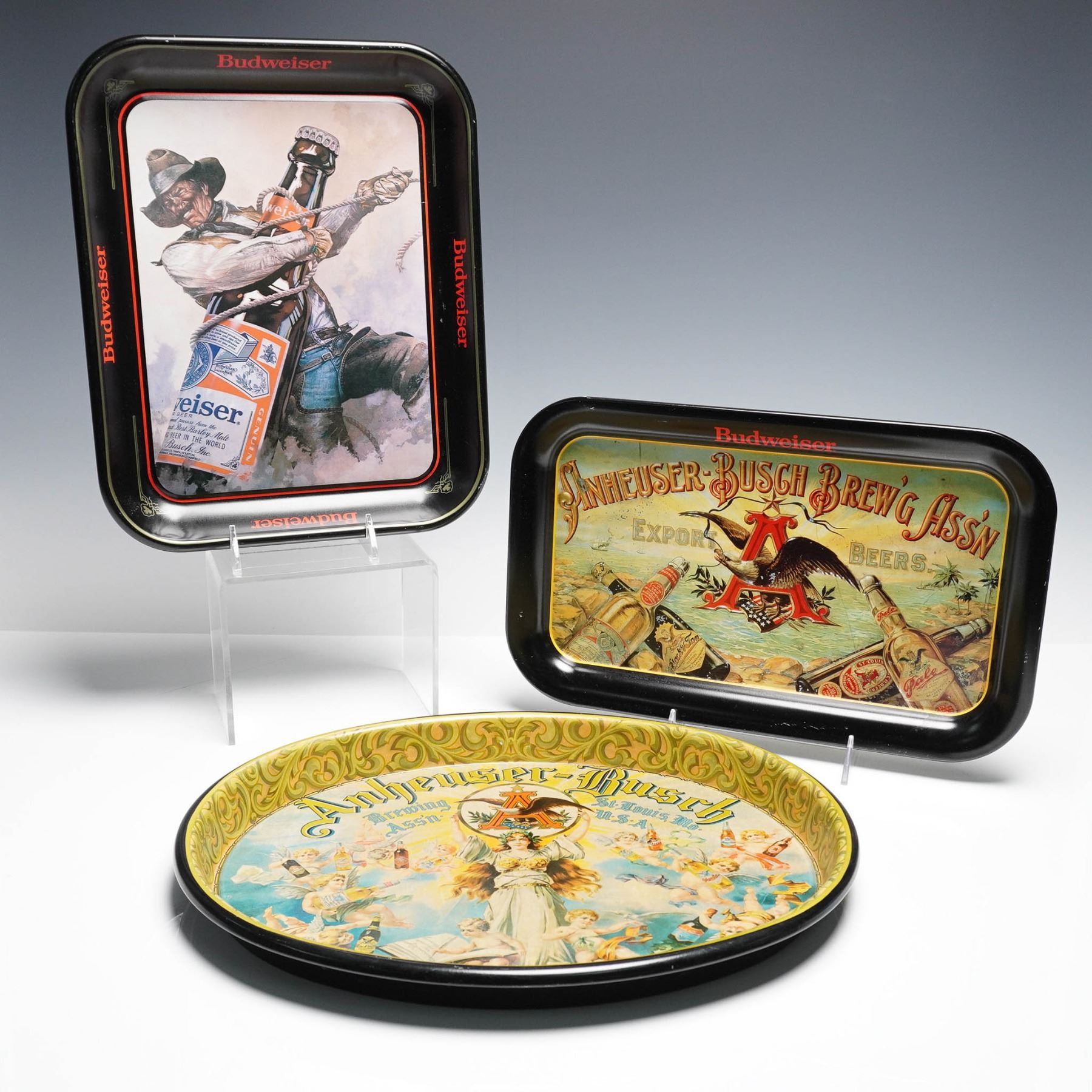A colorful set of three tin Budweiser beer trays, officially licensed reproductions by Anheuser-Busch, Inc. Each tray features vivid printed artwork inspired by historical advertisements from the iconic American beer brand. The set includes a rectangular tray with a cowboy illustration, another rectangular tray featuring classic export beer imagery, and a round tray adorned with cherubs and a central female figure representing Anheuser-Busch. These decorative trays highlight the rich visual history of Budweiser branding. Marked as official products on the reverse.