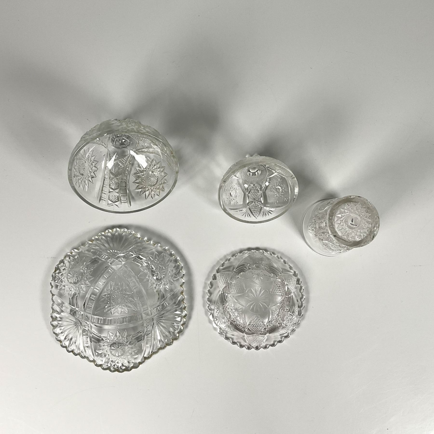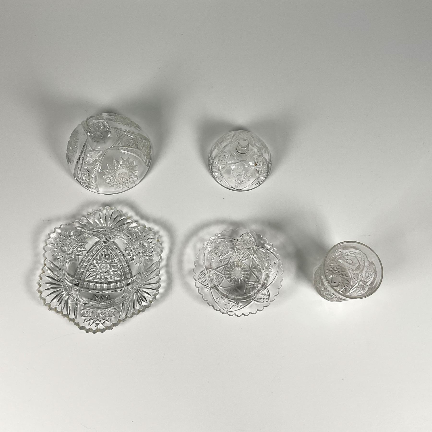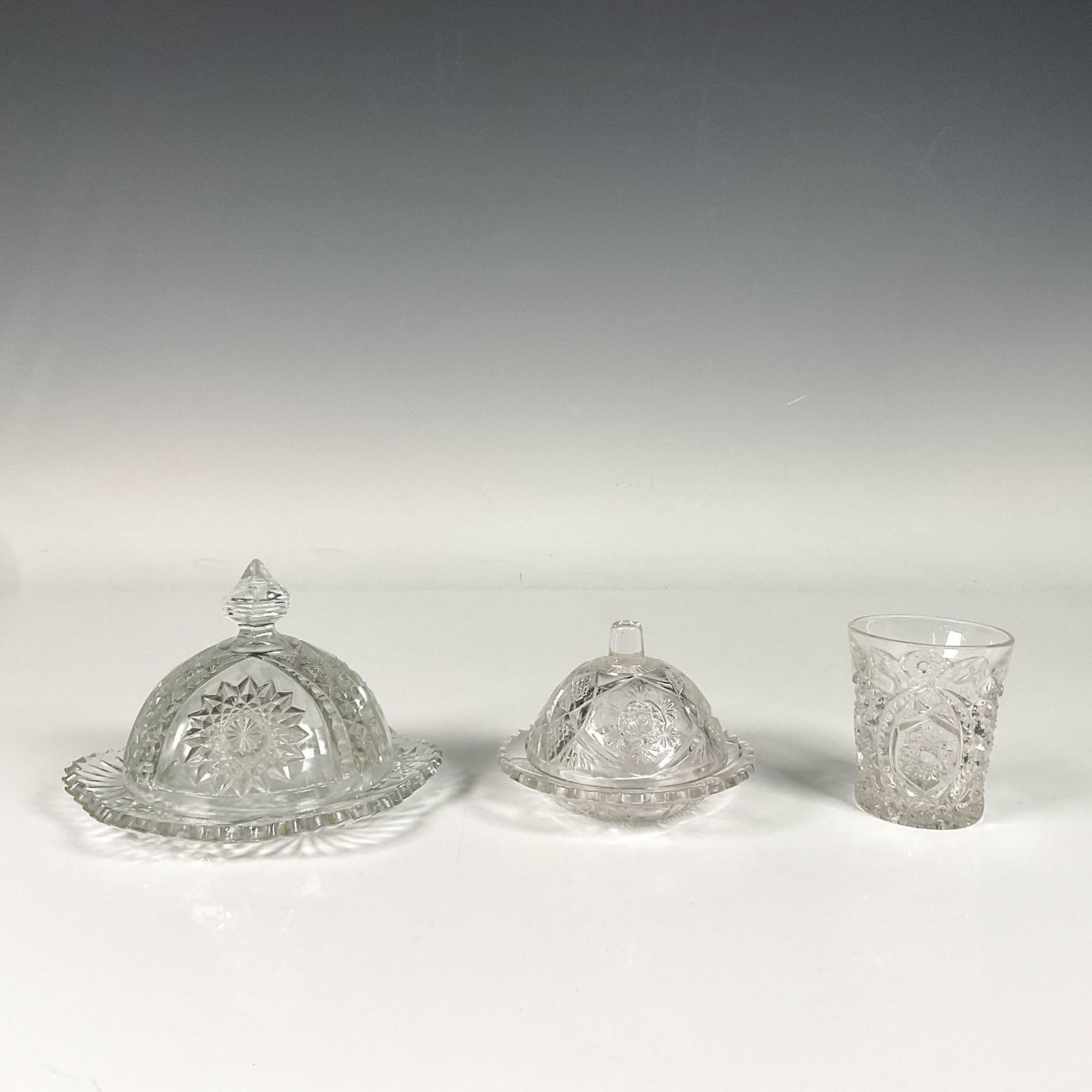 Two covered butter dishes with lids, featuring intricate sunflower and star patterns, accompanied by a shot glass. Larger butter dish with a lid: 5.25"W x 3.75"H. Shot glass: 2.25"W x 2.75"H.