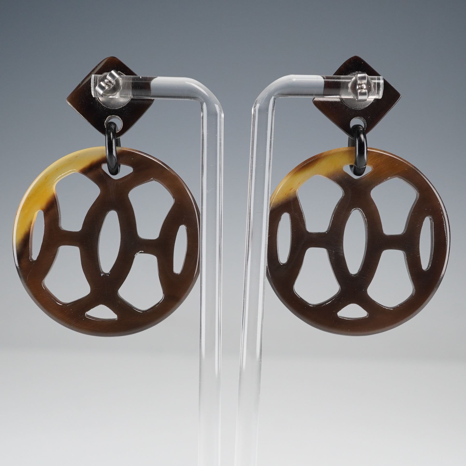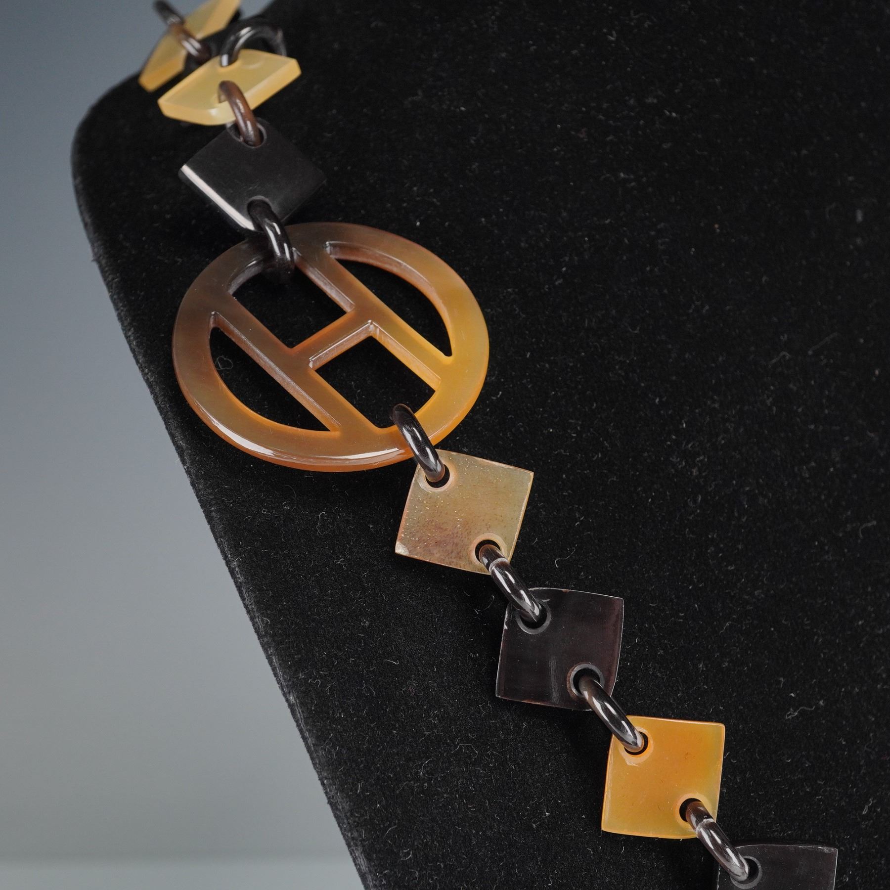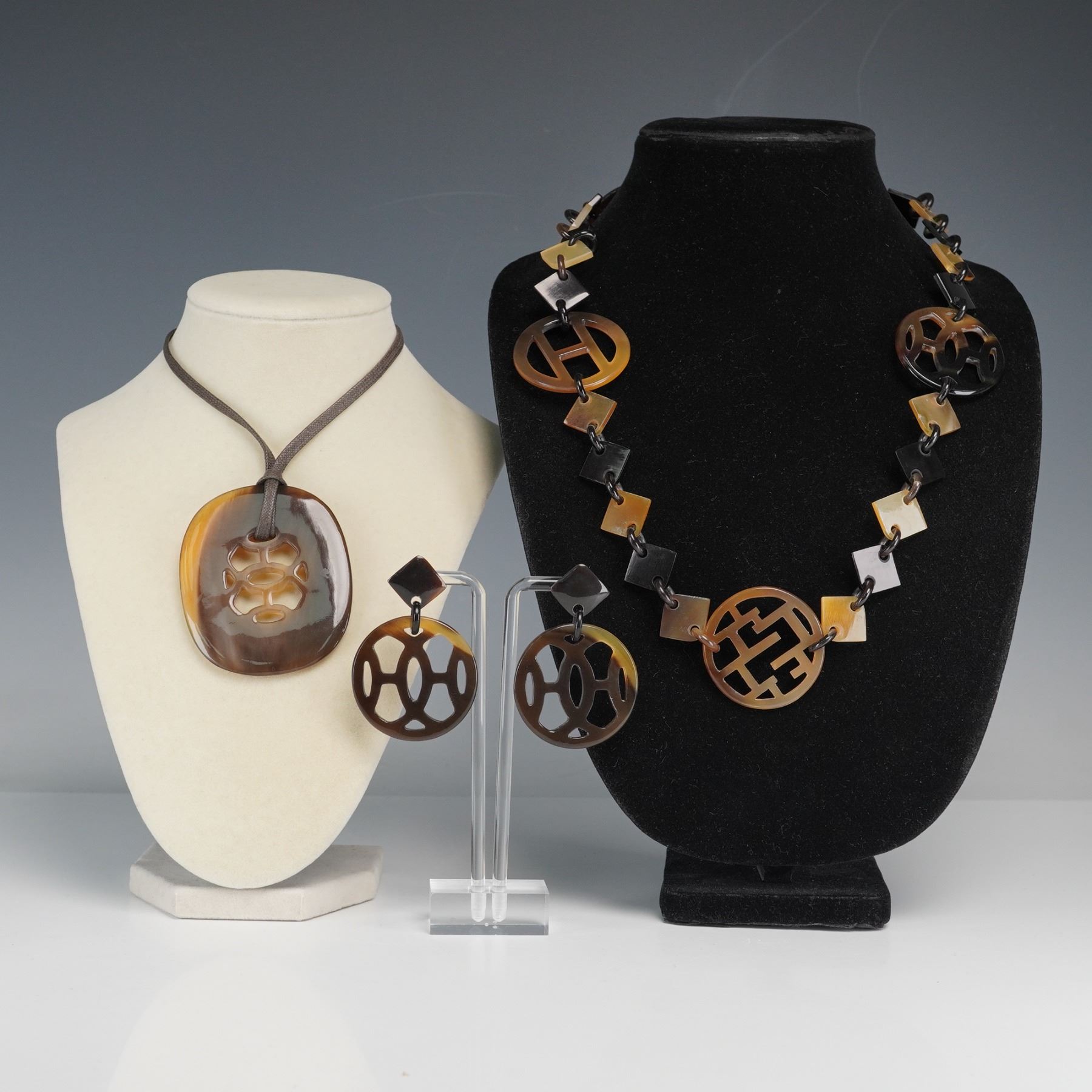 A coordinated trio of carved fashion jewelry, in the style of Hermes. This gorgeous stylish set of three includes a pendant necklace suspended from a dark cord with carved pattern, a pair of circular openwork drop earrings fitted with geometric studs, and a complementary link necklace constructed from alternating square and round panels.