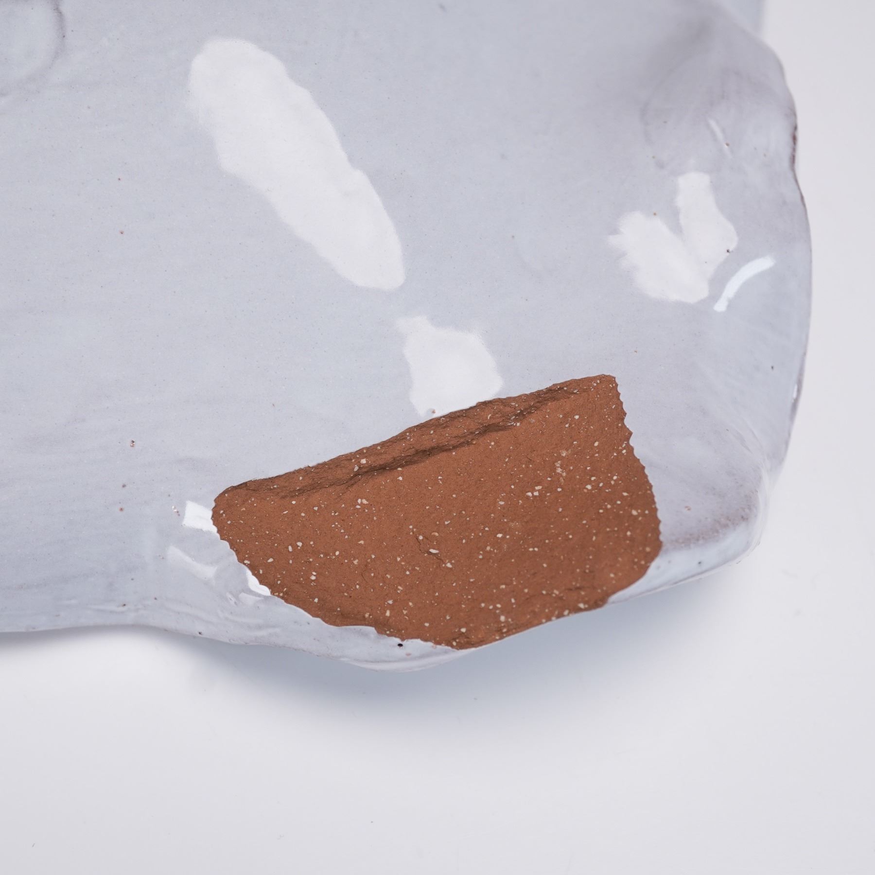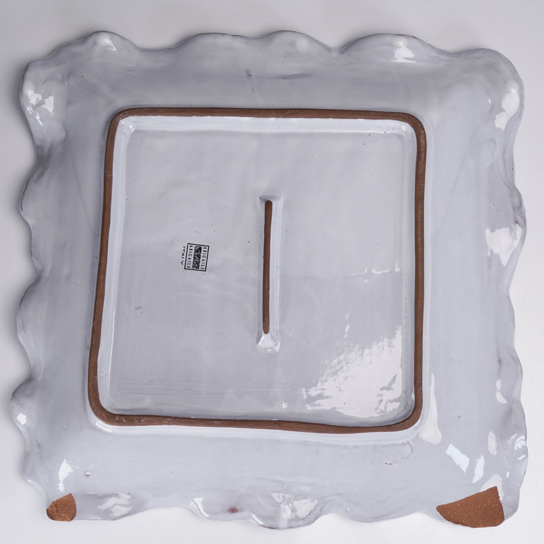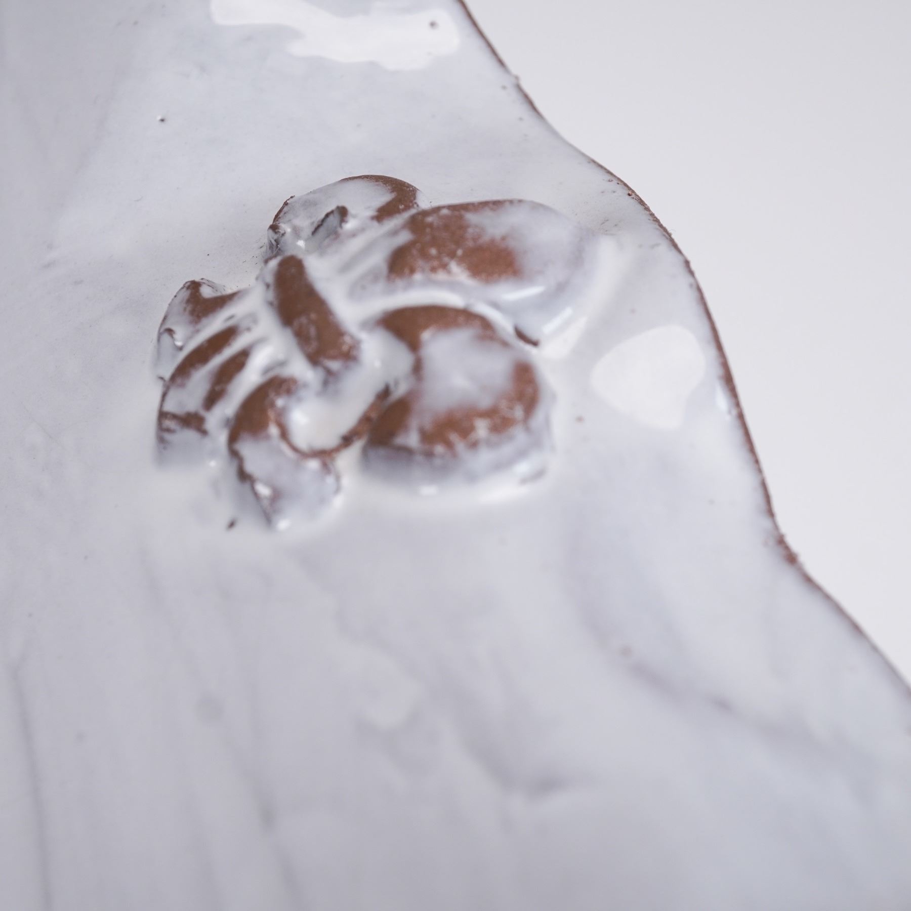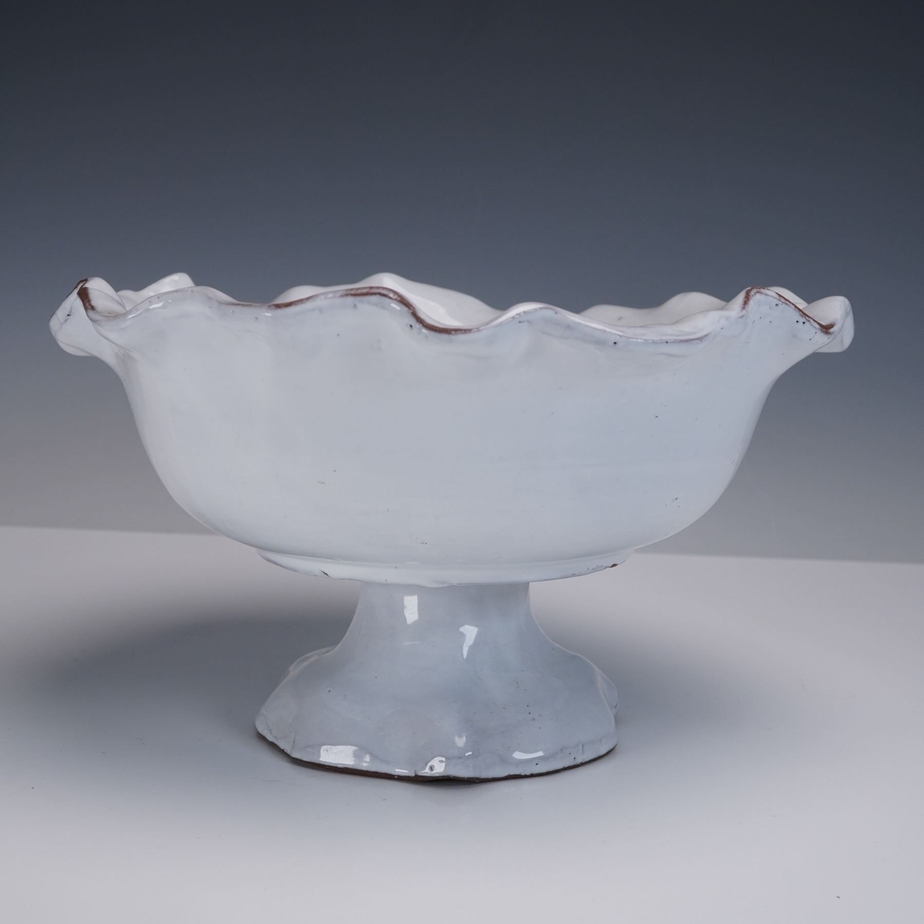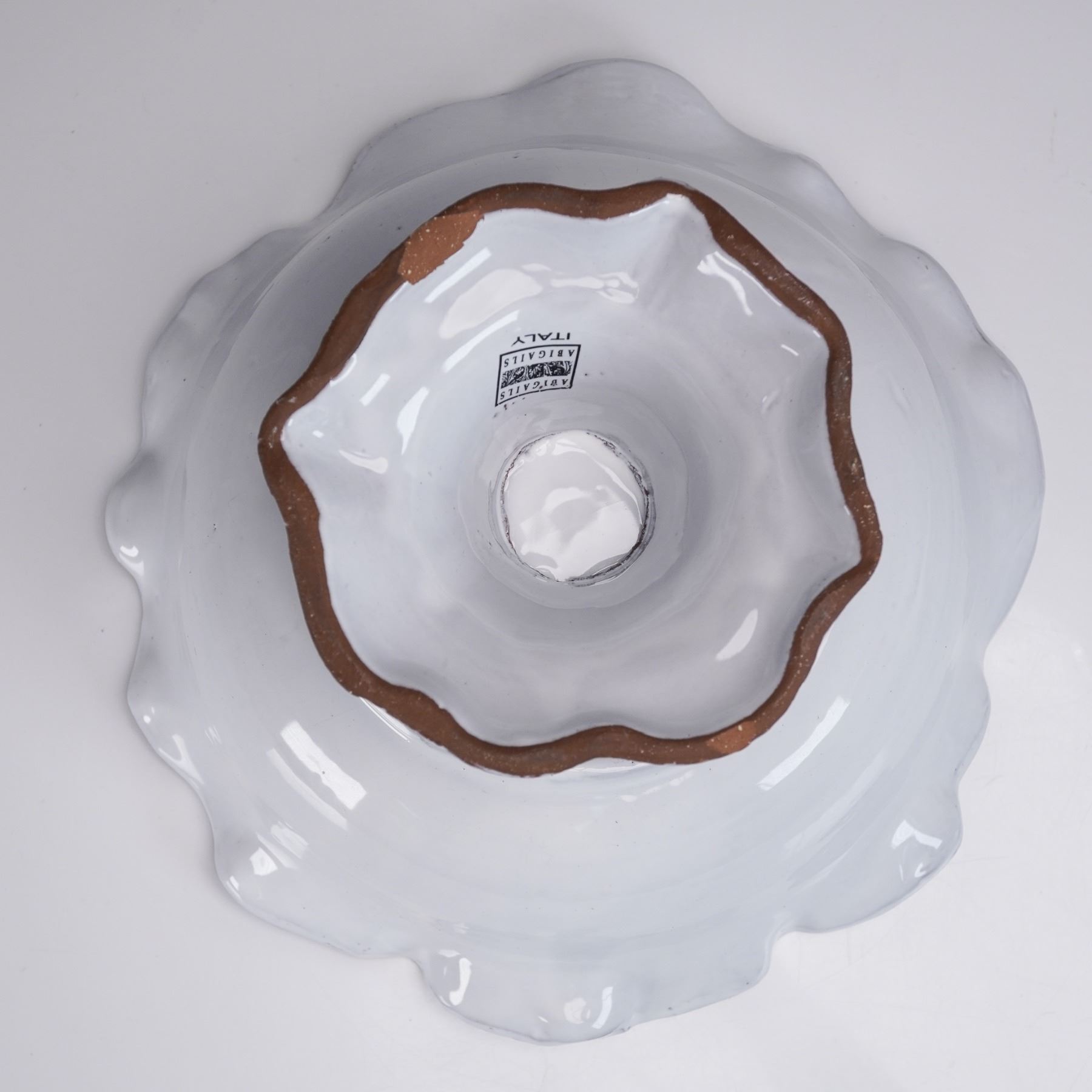 A charming 3-piece Italian ceramic serveware set by Abigails, featuring an elegant Fleur de Lis relief design and scalloped rims with rustic hand-glazed edges. This grouping includes a footed bowl and two rectangular serving platters, all finished in a glossy pale grey glaze with terracotta undertones visible along the ridges and embossed motifs. Each piece is backstamped "Abigails Italy," denoting its hand-crafted origins. Largest item measures 14.5"L.