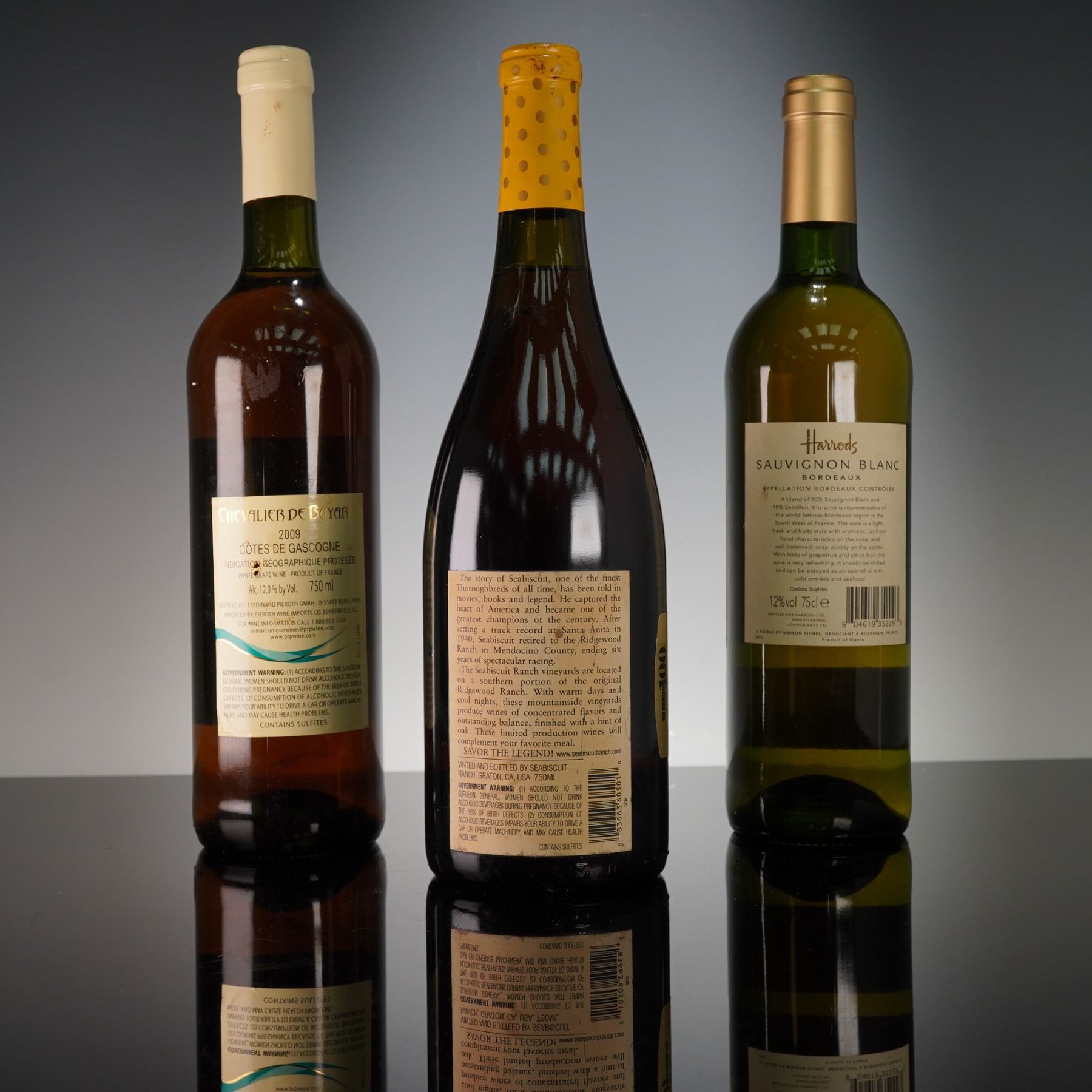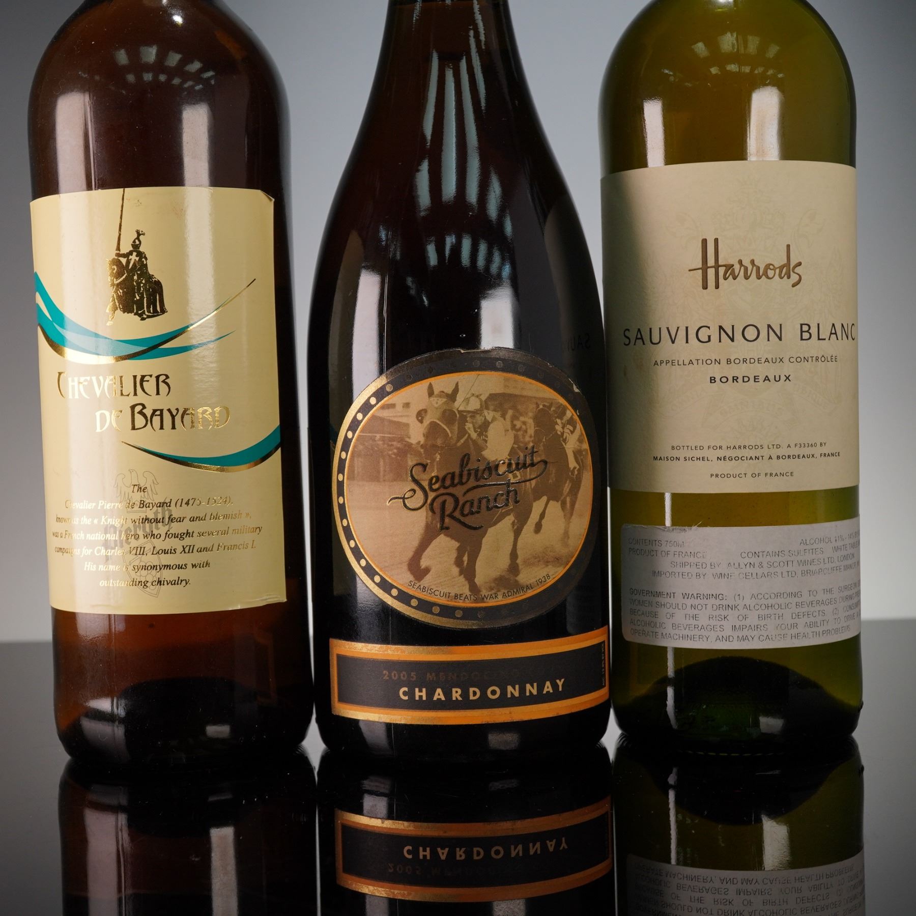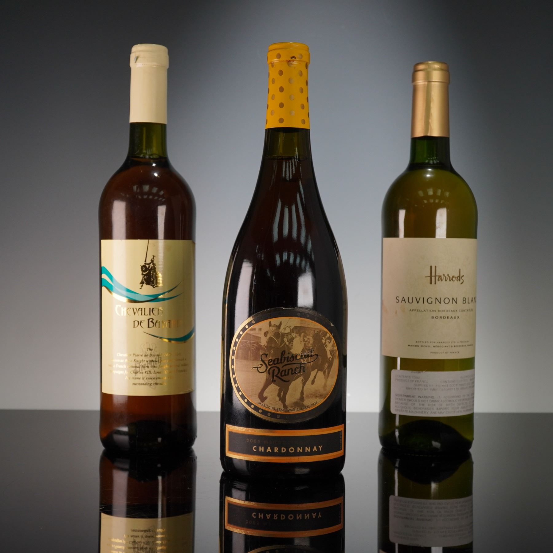 3pc Chevalier de Bayard, Seabiscuit Ranch Chardonnay, and Harrods Sauvignon