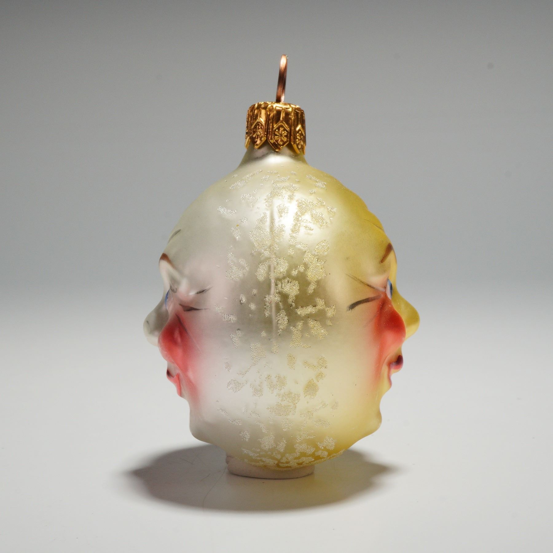Colorful trio of hand painted Christopher Radko glass ornaments including a vibrant rainbow fish with glittered scales, a gold toned scallop shell with raised ribbing and subtle sparkle, and a round silvered moon face ornament with expressive features.