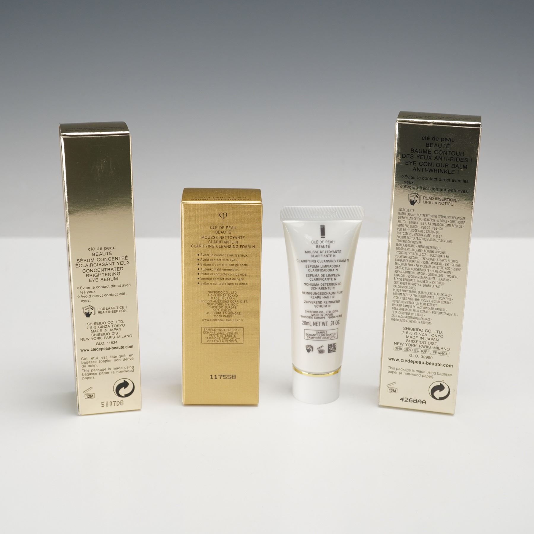 This set from Cle de Peau Beaute features three premium skincare items designed to refine, smooth, and brighten the complexion. Included are the Clarifying Cleansing Foam (20mL / 0.7 oz), the Eye Contour Balm Anti-Wrinkle (15mL / 0.53 oz), and the Concentrated Brightening Eye Serum (15mL / 0.54 oz). Each product remains factory sealed in its original packaging and has never been used. The Clarifying Cleansing Foam gently purifies and refreshes the skin while maintaining moisture balance. The Eye Contour Balm is formulated to minimize the appearance of fine lines and restore firmness around the eyes, and the Brightening Eye Serum delivers radiance and hydration for a luminous finish. All items are authentic Cle de Peau Beaute products, presented in excellent, unopened condition with minimal shelf wear. This elegant trio represents the brand's signature blend of advanced skincare science and luxury craftsmanship, ideal for collectors or those seeking the finest in beauty care.