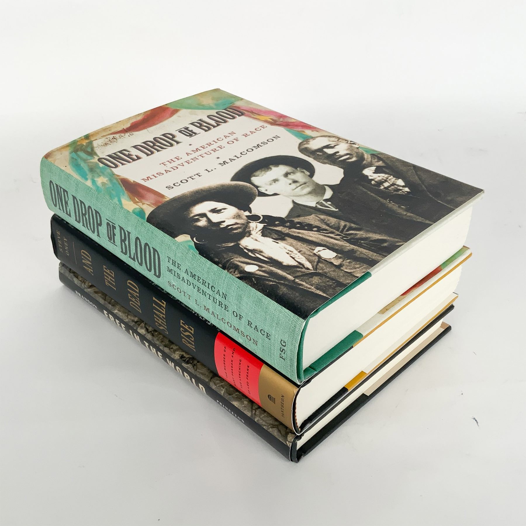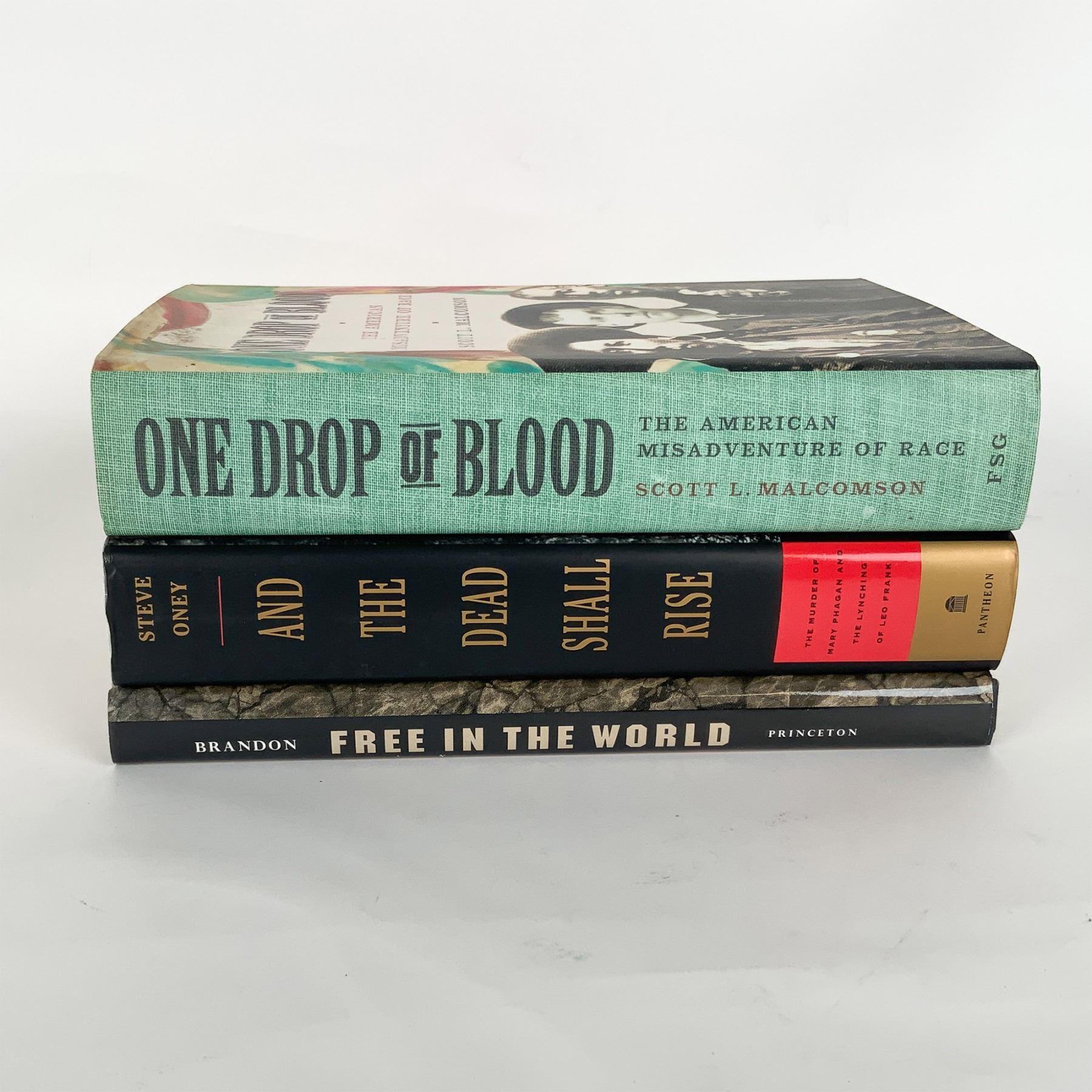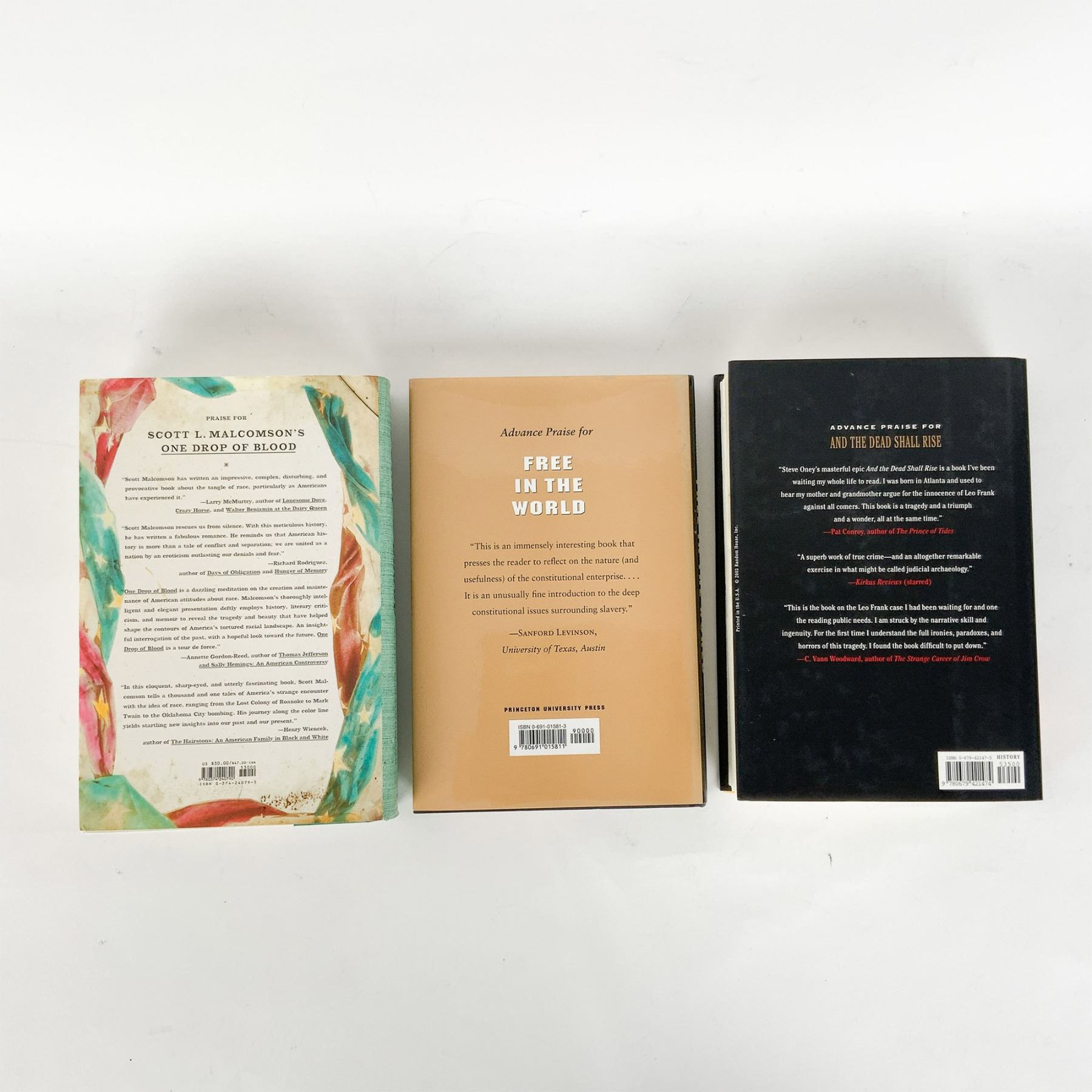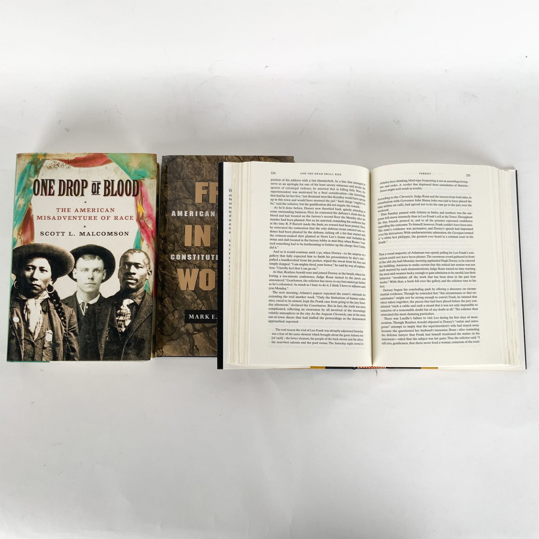 This collection includes three hardcover books exploring themes of race, justice, and societal history. One Drop of Blood: The American Misadventure of Race by Scott L. Malcomson examines the complexities of racial identity in America. And the Dead Shall Rise: The Murder of Mary Phagan and the Lynching of Leo Frank by Steve Oney provides an investigative account of one of the most infamous cases of American injustice. Free in the World by Brandon, published by Princeton, offers a scholarly analysis of freedom and global social structures. Each book is in good condition with intact spines and covers, showing expected wear from use. This lot is an excellent addition for collectors or readers interested in historical, legal, and social studies literature. Largest book measures 9.5"H.
