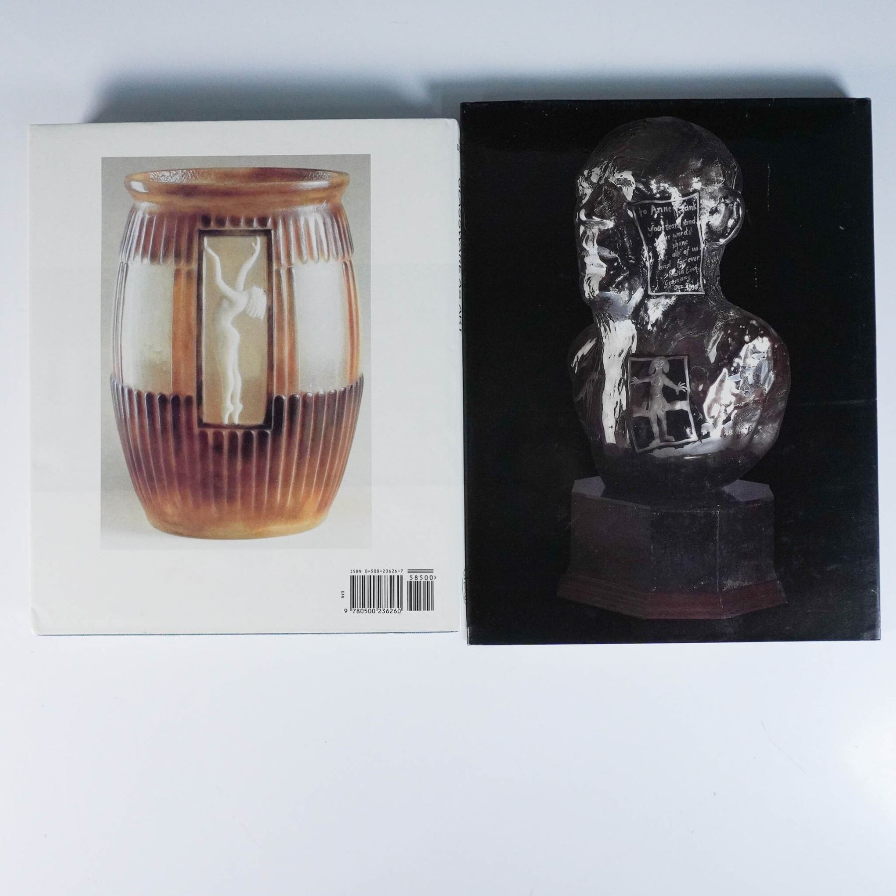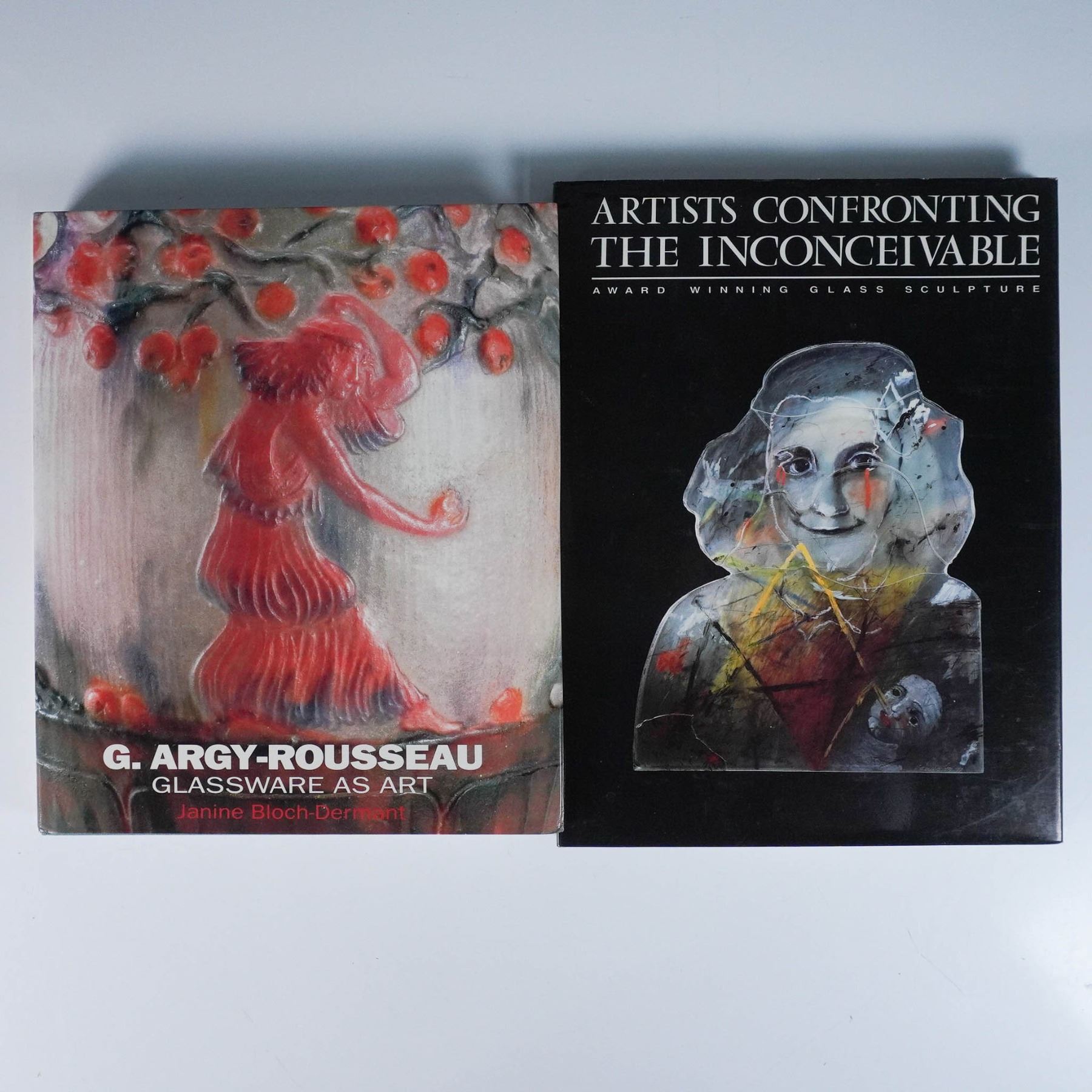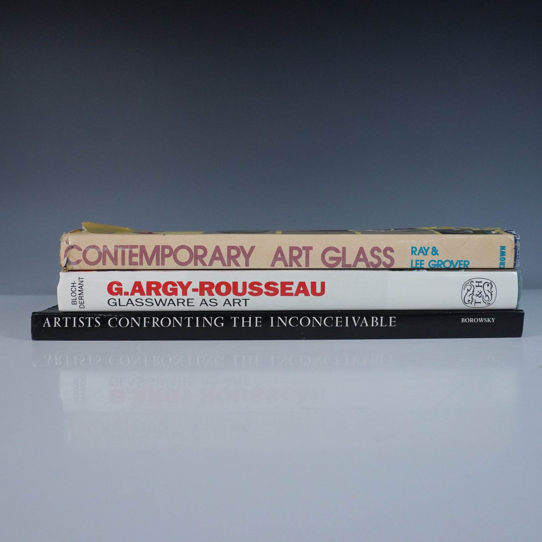 A set of three books showcasing the artistry and history of glassmaking and glass sculpture, perfect for collectors and enthusiasts. The first book, 'Artists Confronting the Inconceivable: Award Winning Glass Sculpture', edited by Irwin J. Borowsky. Published by the American Interfaith Institute in 1992, this book features award-winning glass sculptures and the artists behind them. The second book, 'G. Argy-Rousseau: Glassware as Art' by Janine Bloch-Dermant, with a catalogue raisonne of pate de verre. Published by Thames and Hudson in 1991, this comprehensive book highlights the works of G. Argy-Rousseau, an iconic glass artist of the 20th century. Lastly the third book, 'Contemporary Art Glass' by Ray and Lee Grover. Published by Crown Publishers in 1975, this book features 128 color plates and 48 black-and-white illustrations documenting the evolution and artistry of modern glassmaking. Book 1: 12"H; ISBN: 1-881060-00-4. Book 2: 11.25"H; ISBN: 9780500236260. Book 3: 11.25"H; ISBN: 0-517-516284.