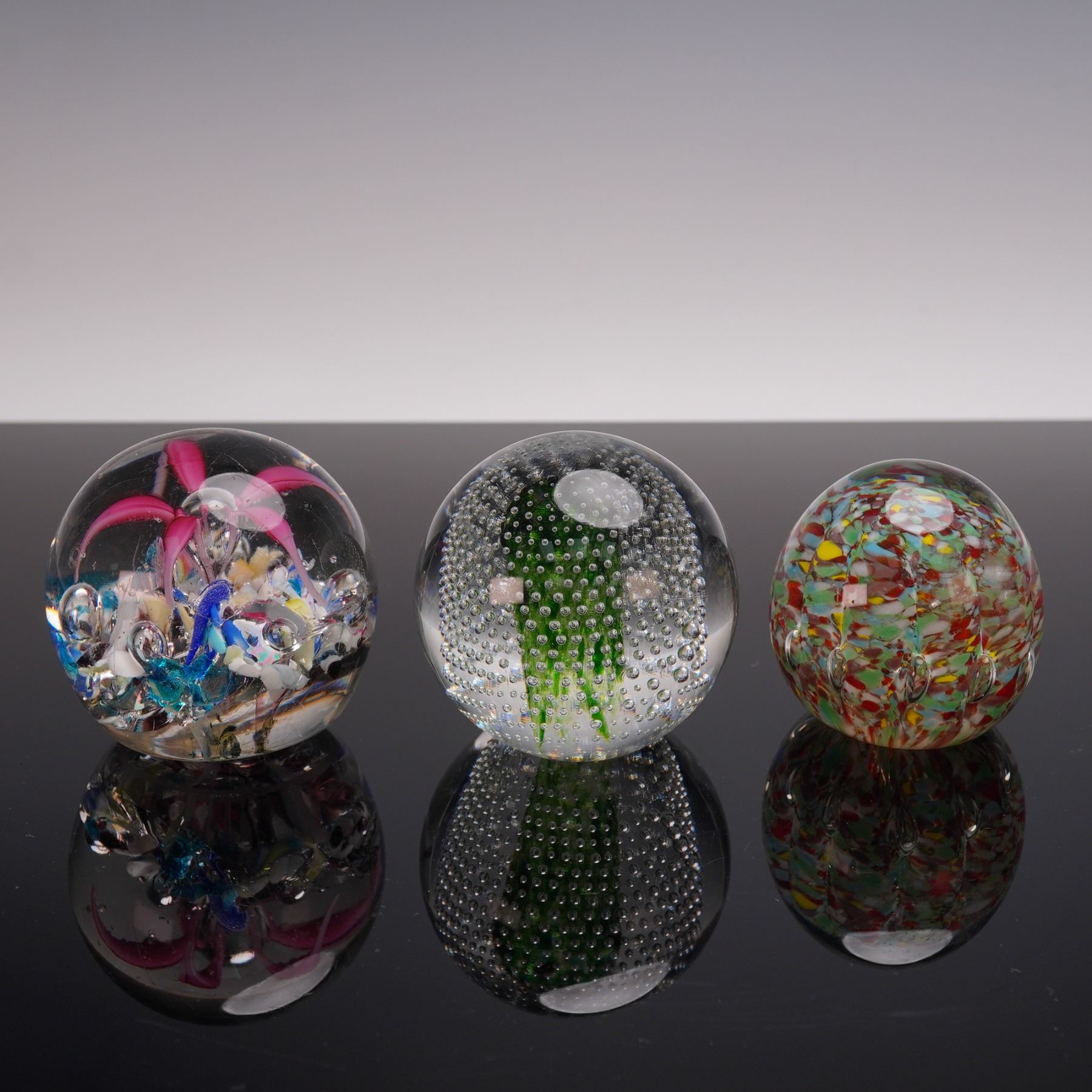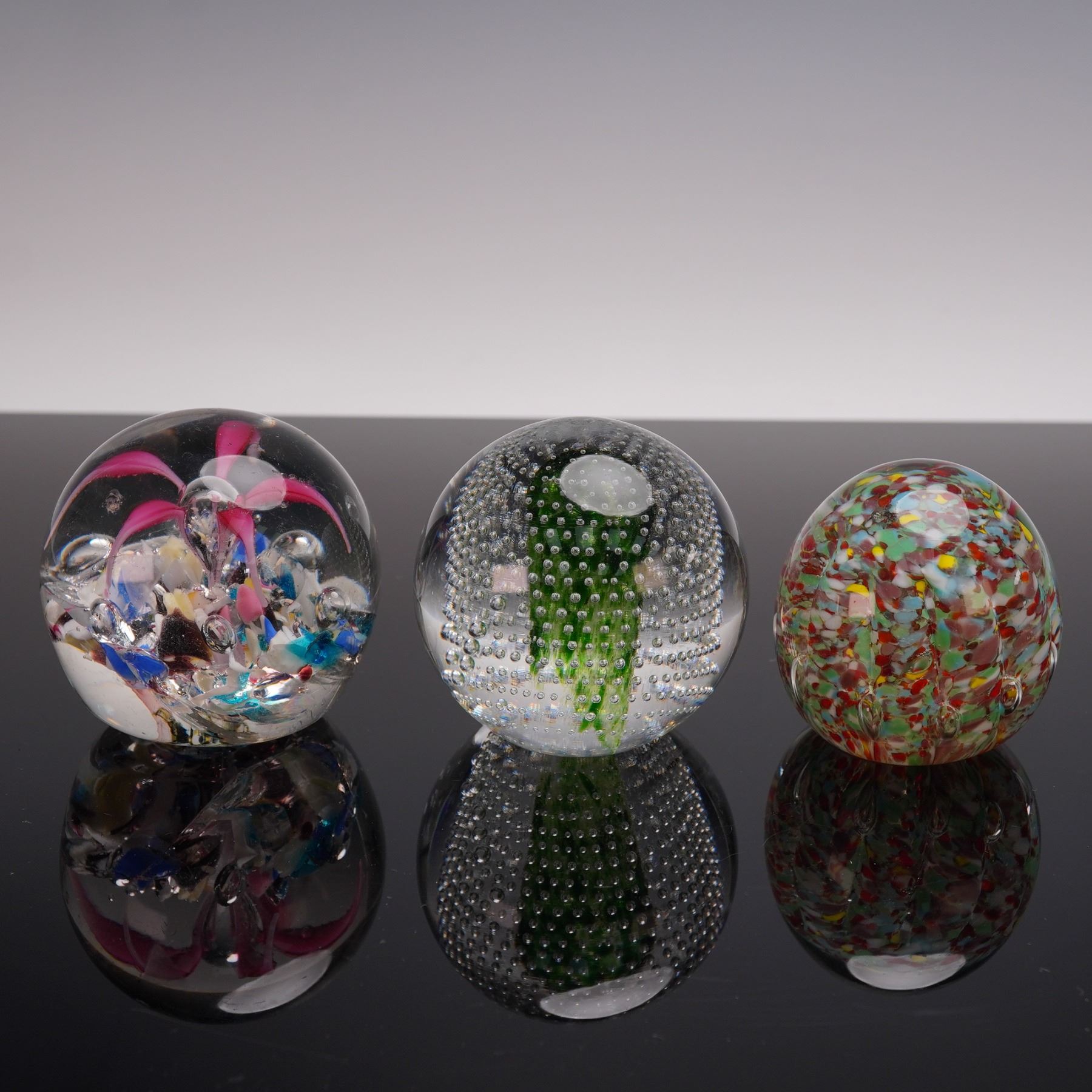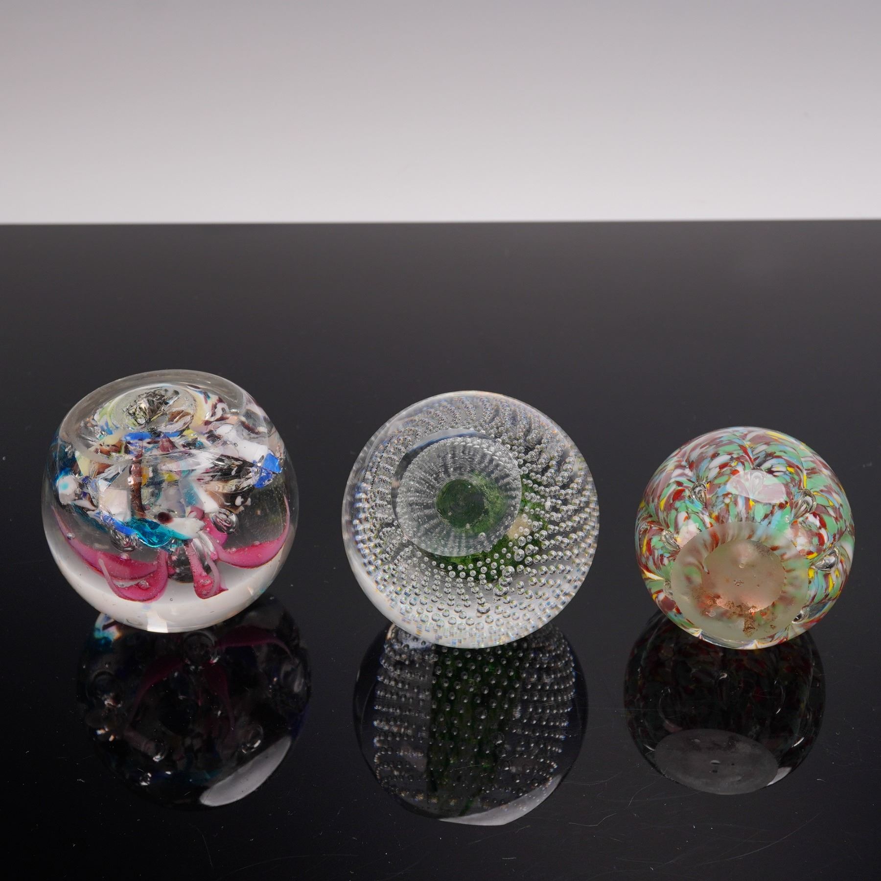 A group of three controlled bubble glass paperweights, each featuring clear glass spheres with evenly spaced air bubbles captured within. The set displays variations in size and bubble arrangement, highlighting the craftsmanship and decorative appeal of mid-century style art glass.