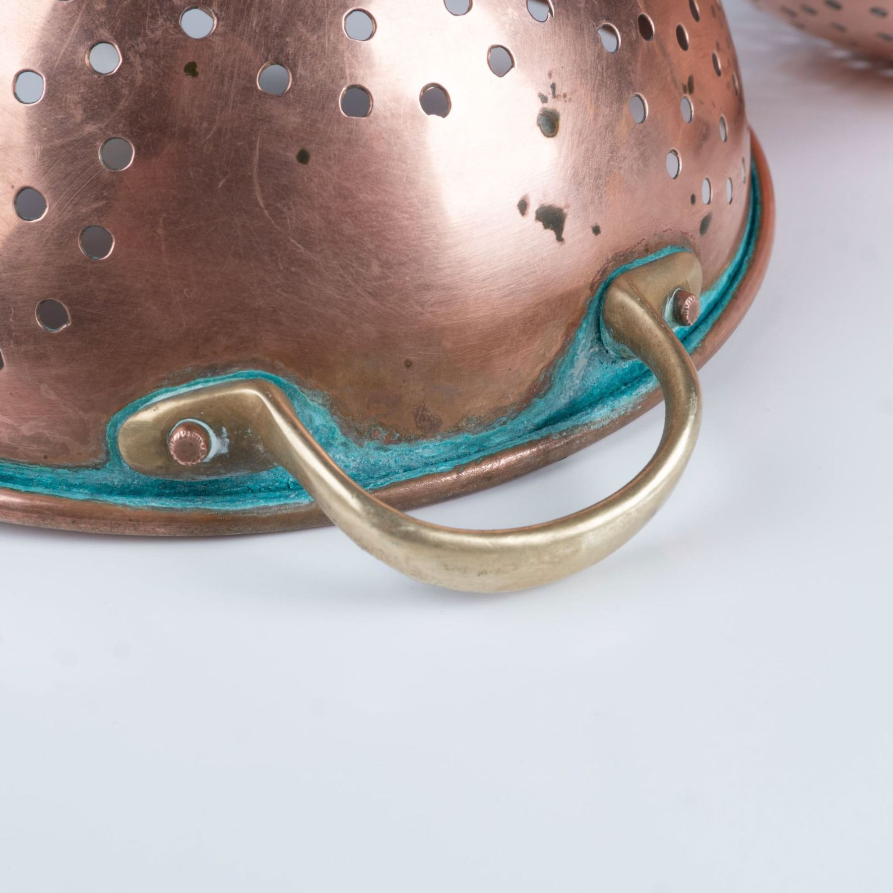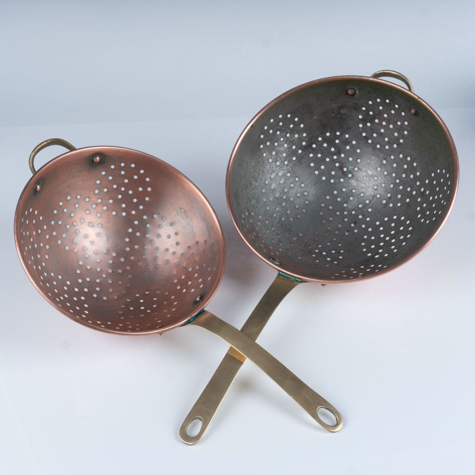 Rustic set of perforated copper bowls with bronze handles used for straining, rinsing, or draining liquids. Largest item measures 15.5"L x 8.25"W x 3.75"H.